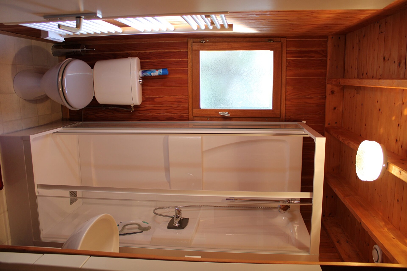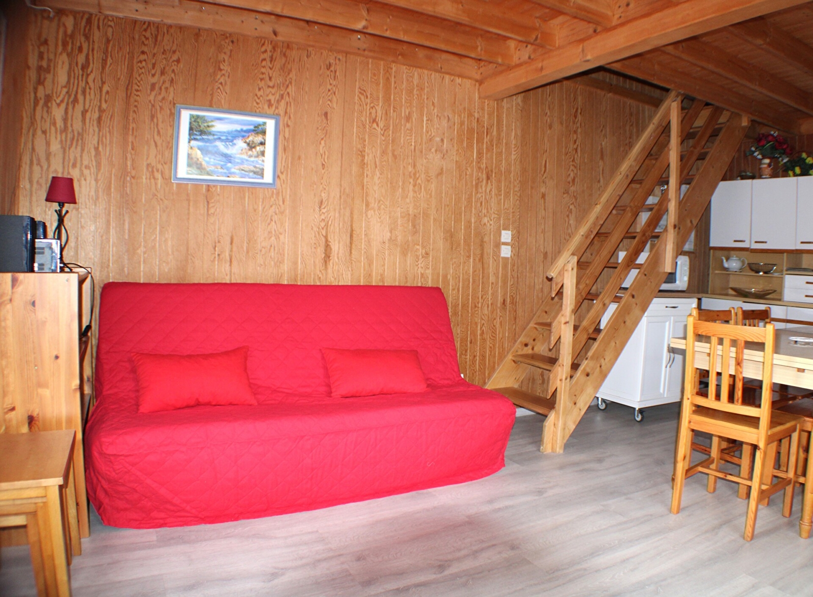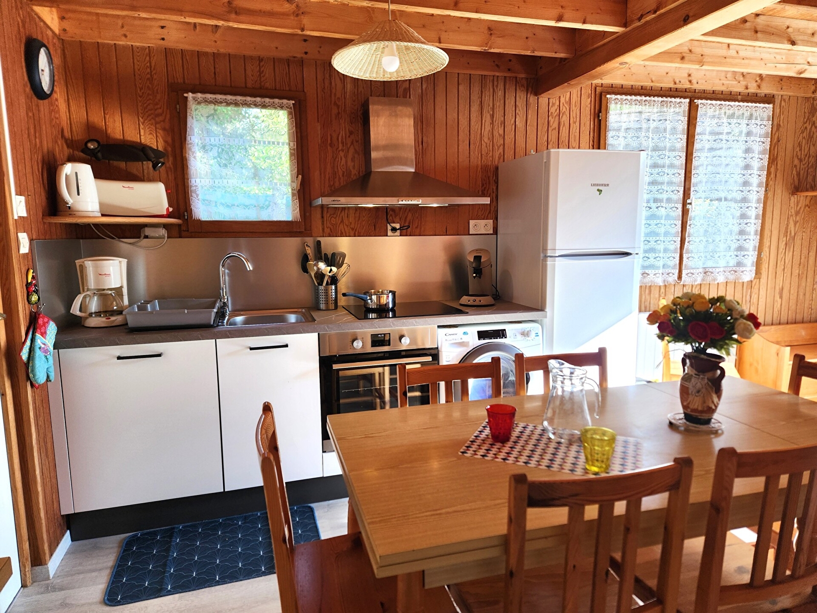 Au RDC : Séjour avec canapé convertible, coin cuisine (plaque à induction + four, lave vaisselle, micro onde, combiné lave linge/sèche linge, électroménager divers, cafetière Sanséon, TV), chambre avec lit superposés en 90, Salle de bains /WC.
