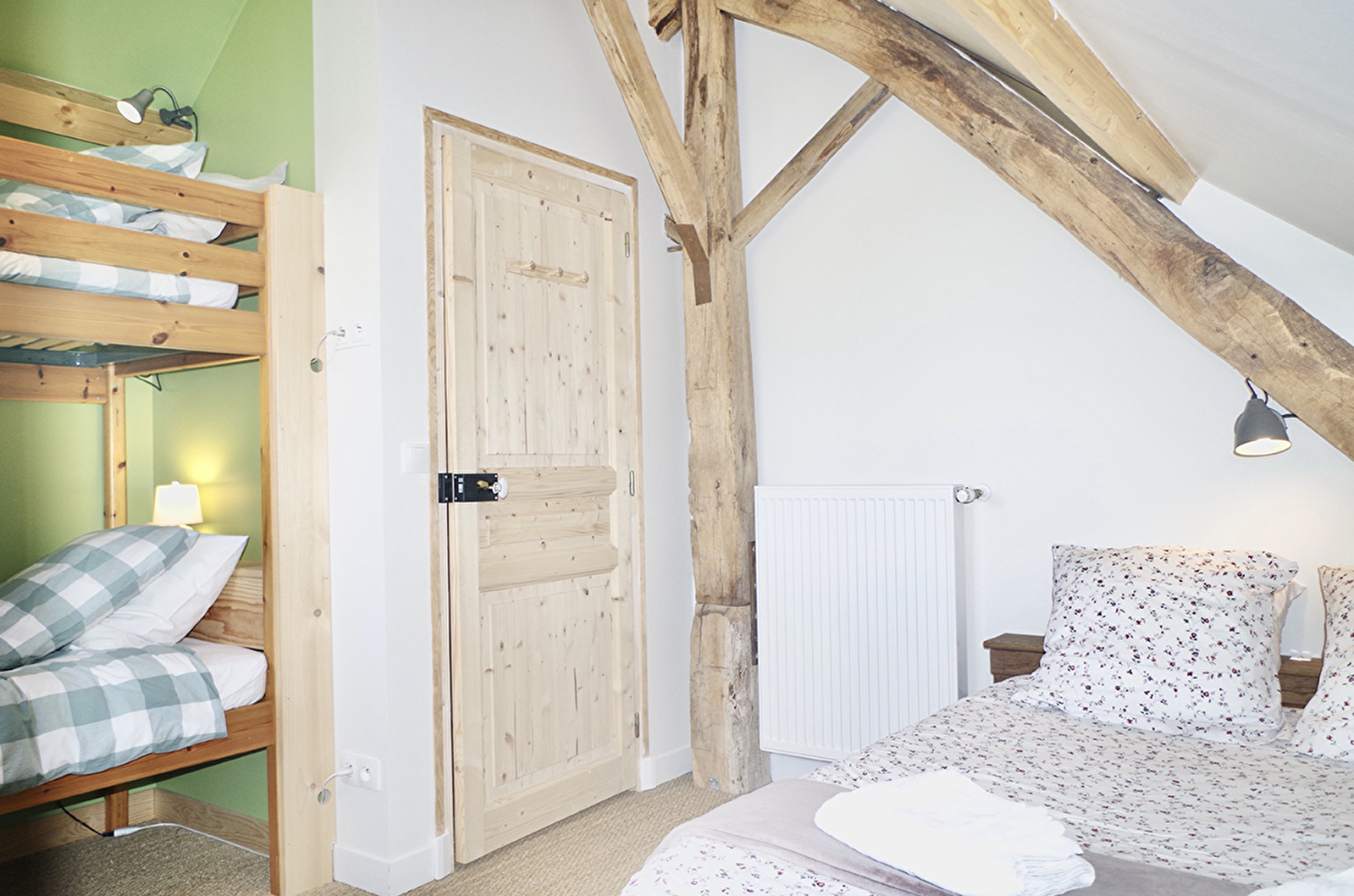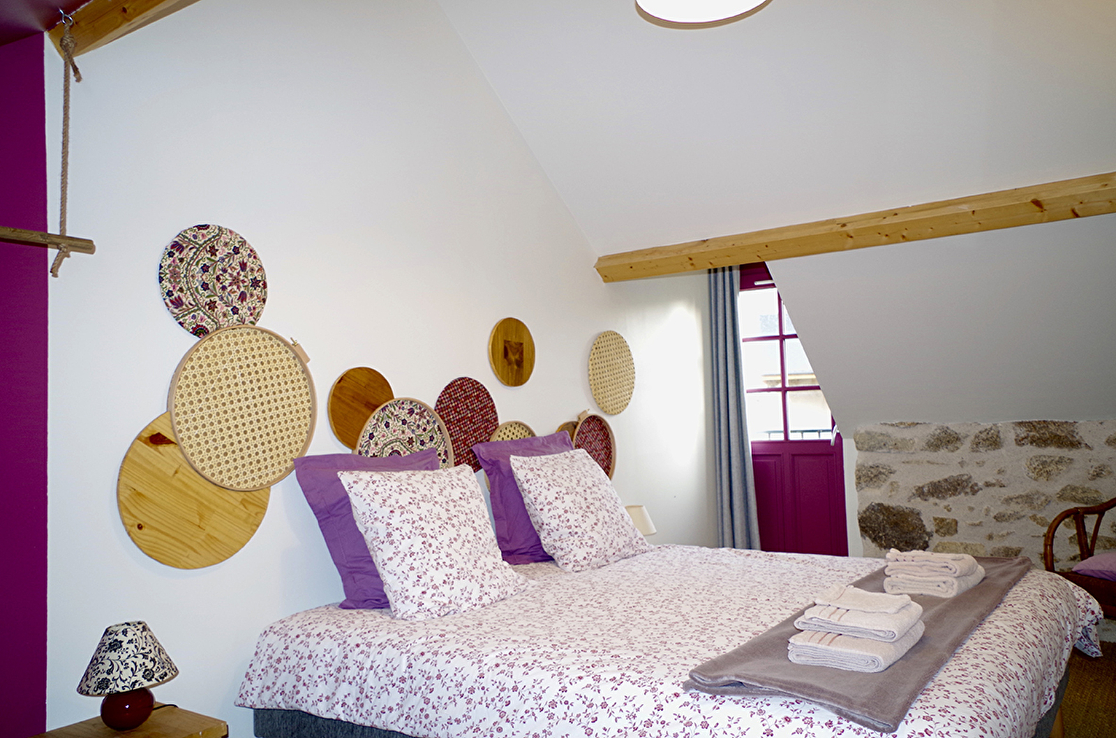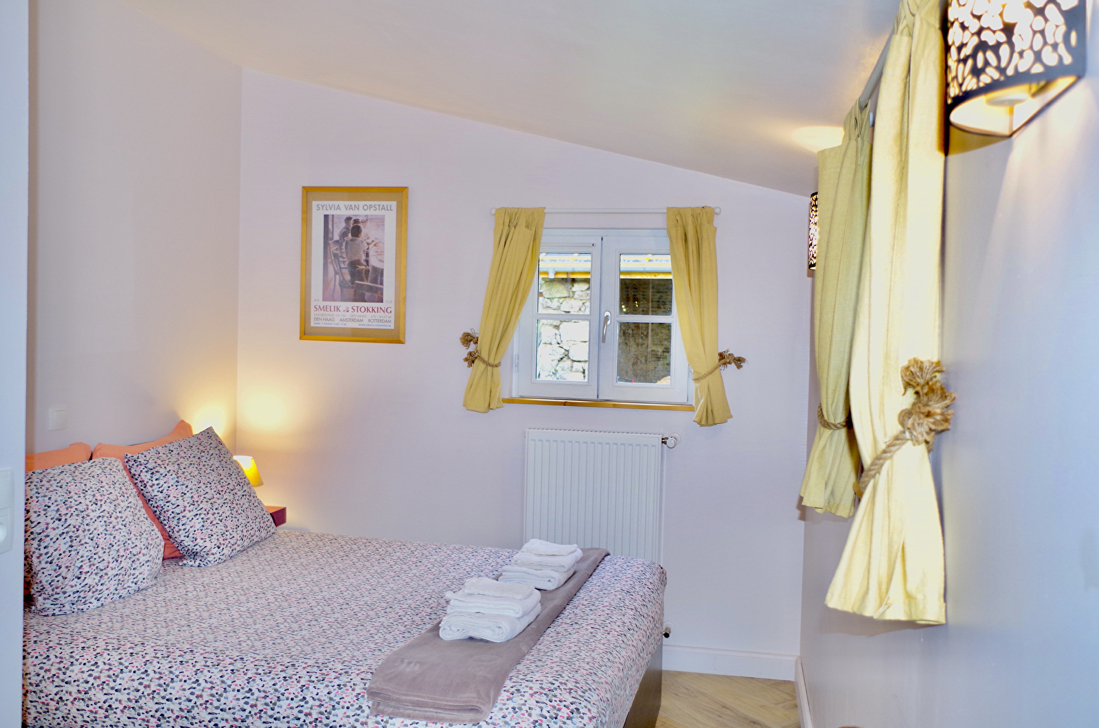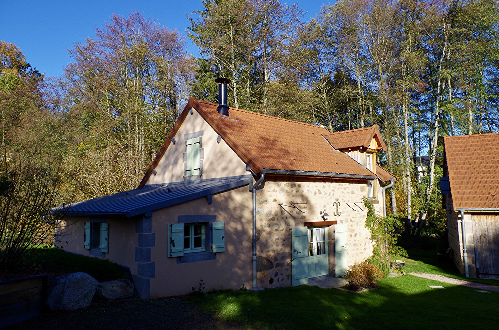 Description du gîte : cuisine ouverte sur la grande pièce à vivre et accès direct sur la terrasse et le ruisseau. Salon avec télévision et wifi, cheminée. 3 chambres: 1 chambre en rez-de-chaussée avec 1 lit de 160x200, et salle d'eau attenante avec douche à l'italienne; à l'étage : 1 chambre avec 1 lit 180x200 (modulable en 2 lits de 90x200) et 1 chambre avec 1 lit 140x190 et 2 lits superposés 90x200. Autre salle de bain avec baignoire et wc séparé. Linge de lit inclus avec les lits faits, ainsi que le linge de toilette et de cuisine. Chauffage par chaudière centrale aux plaquettes de bois (compris dans le prix) et électricité incluse, Bois en supplément à la demande pour la cheminée. Forfait ménage à la demande. Buanderie commune aux 3 gîtes (lave-linge, table et fer à repasser).
