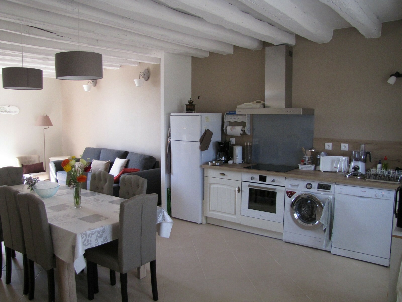 Rez-de-chaussée : grande pièce à vivre de 36 m² (cuisine équipée, salle à manger, salon) avec accès dans un jardin clos (terrasse, salon de jardin, barbecue) ; salle d'eau avec WC.