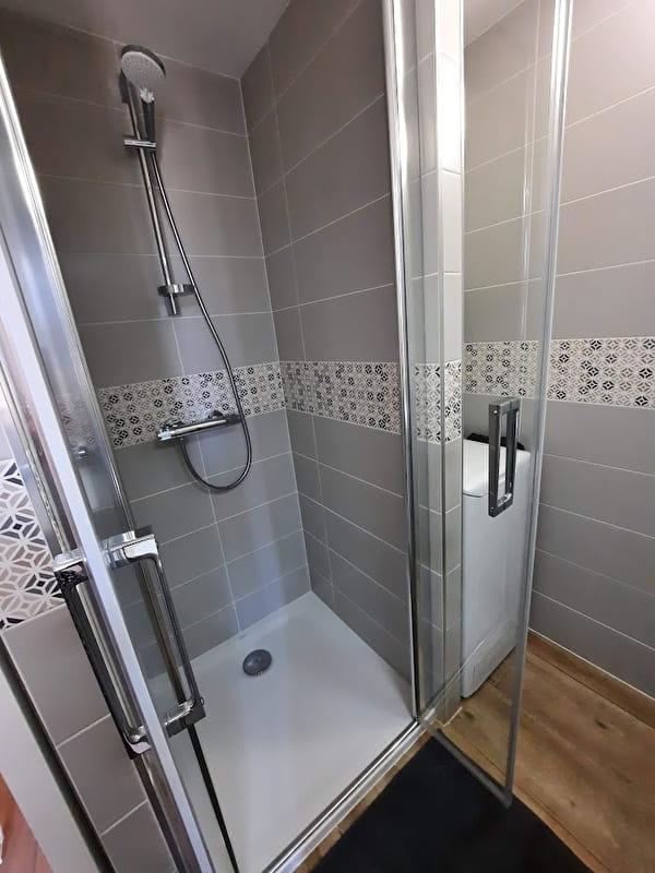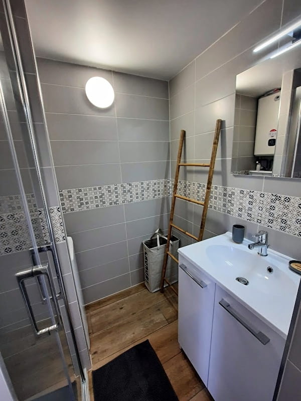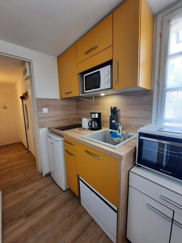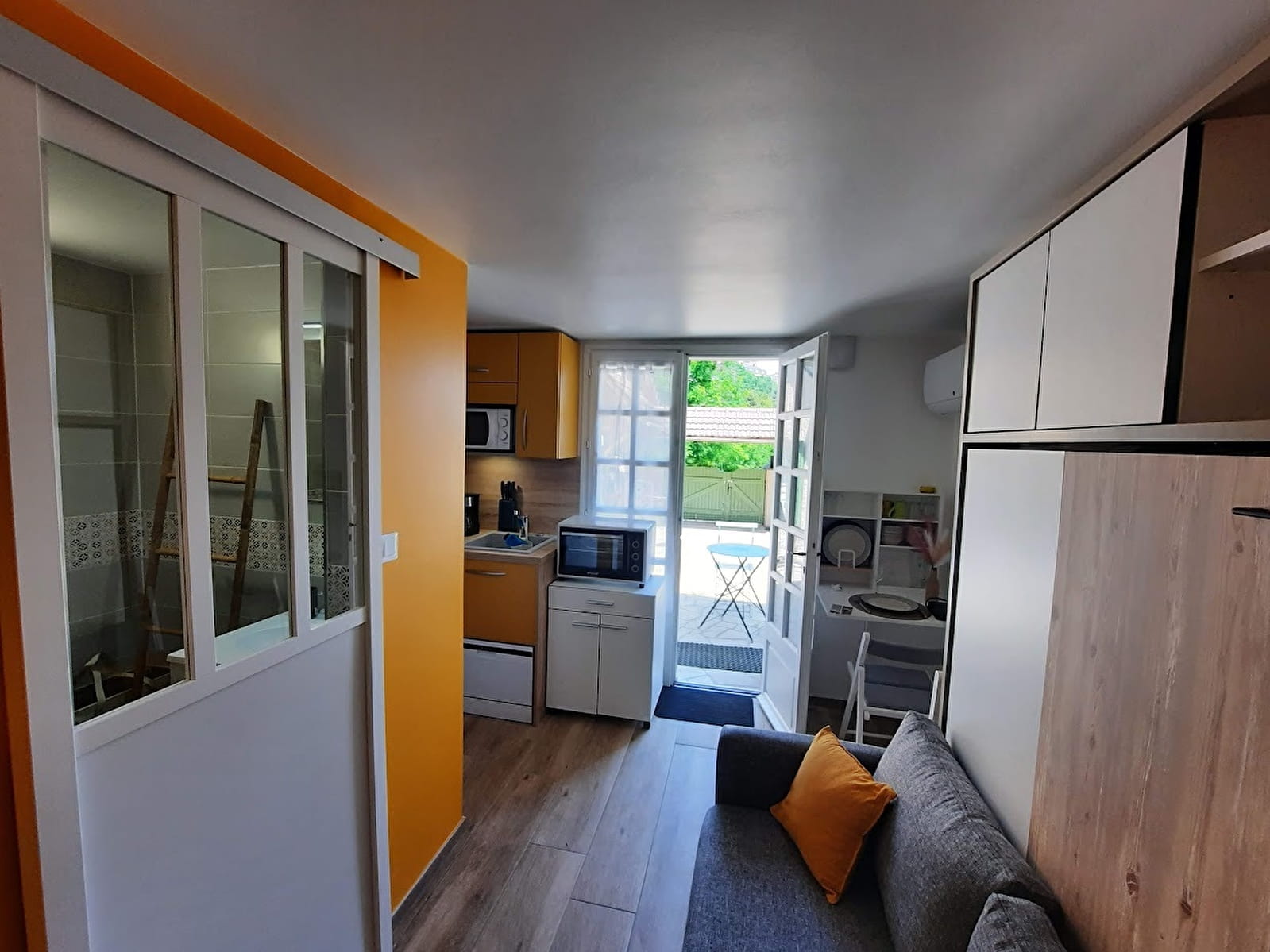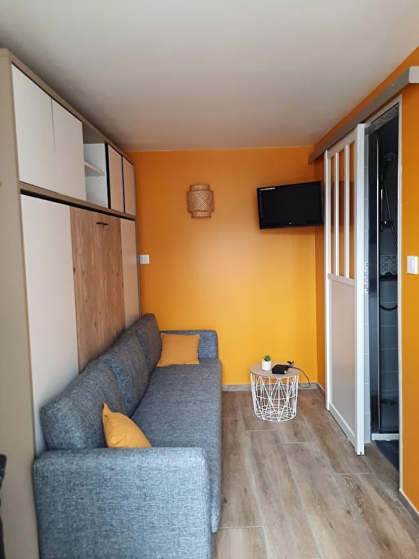 Studio neuf de plain-pied pour 1 à 2 personnes, composé d'une cuisine équipée, plaques vitro, four à micro-ondes, four, hotte aspirante, lave-vaisselle, cafetière filtre, grille pain, bouilloire, lave-linge, salle de douche et WC, sèche cheveux, canapé fixe, TV connectée, fibre WIFI, lit double escamotable, climatisation réversible, terrasse équipée (table, chaises et parasol, barbecue). Sèche linge, petits électroménagers dans le local commun, jardin avec vue sur le vieux Bourbon.
