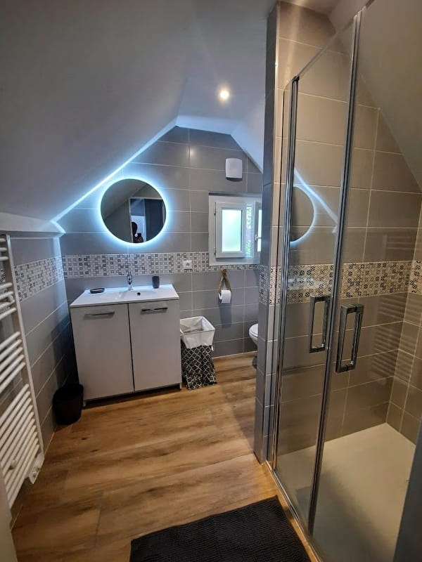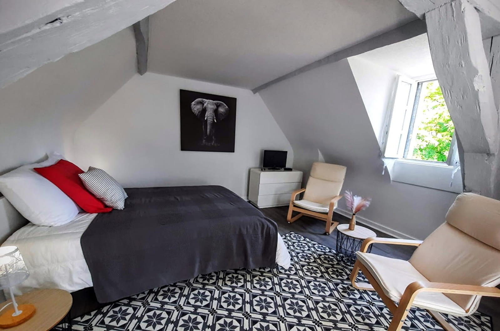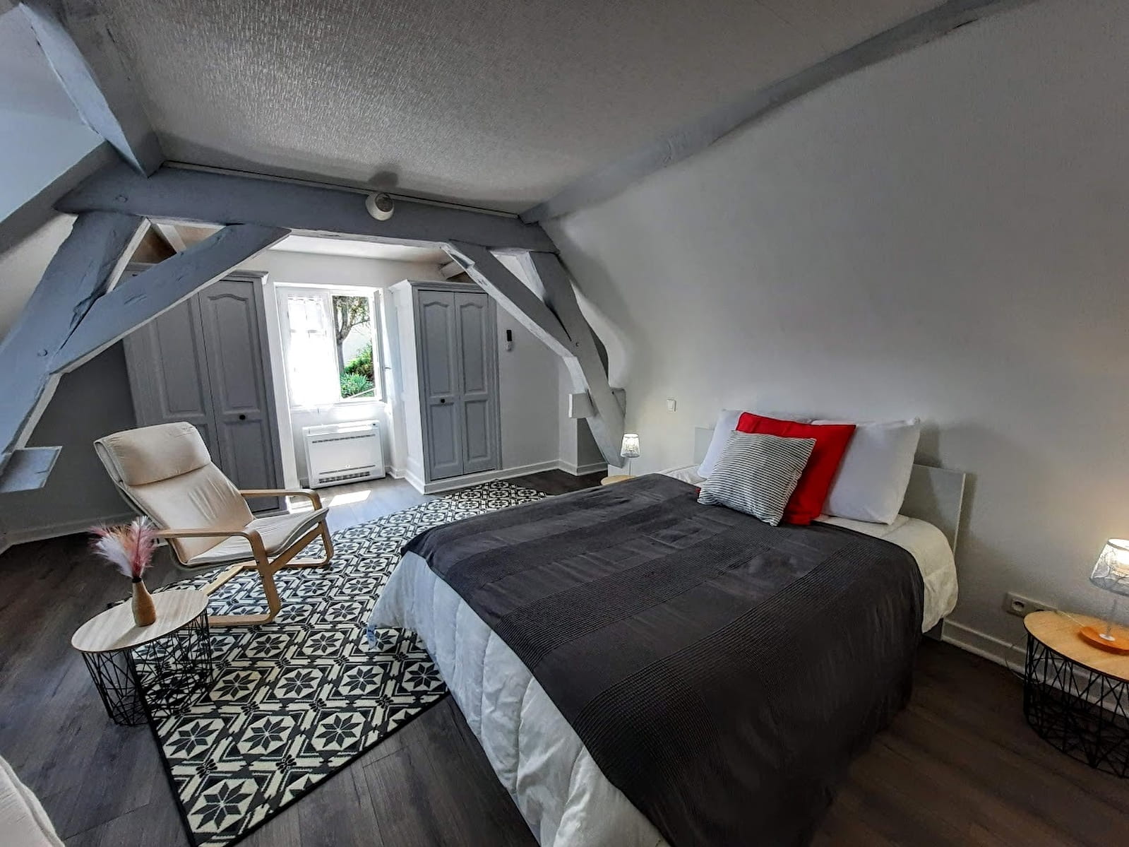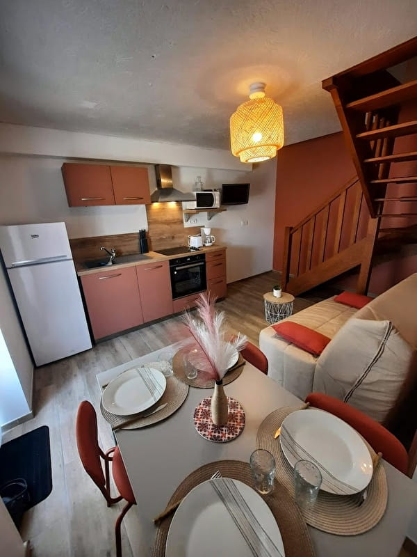 Appartement neuf en duplex pour 2 à 4 personnes, composé d'une cuisine équipée, plaques vitro, four à micro-ondes, four à chaleur tournante, hotte aspirante, lave-vaisselle, cafetière filtre, grille pain, bouilloire, lave-linge, salle de douche et WC, sèche cheveux, canapé BZ 2 couchages, 2 TV connectées, fibre WIFI, une chambre , climatisation réversible, terrasse équipée (table, chaises et parasol, barbecue). Sèche linge, petits électroménagers dans le local commun, jardin avec vue sur le vieux Bourbon.