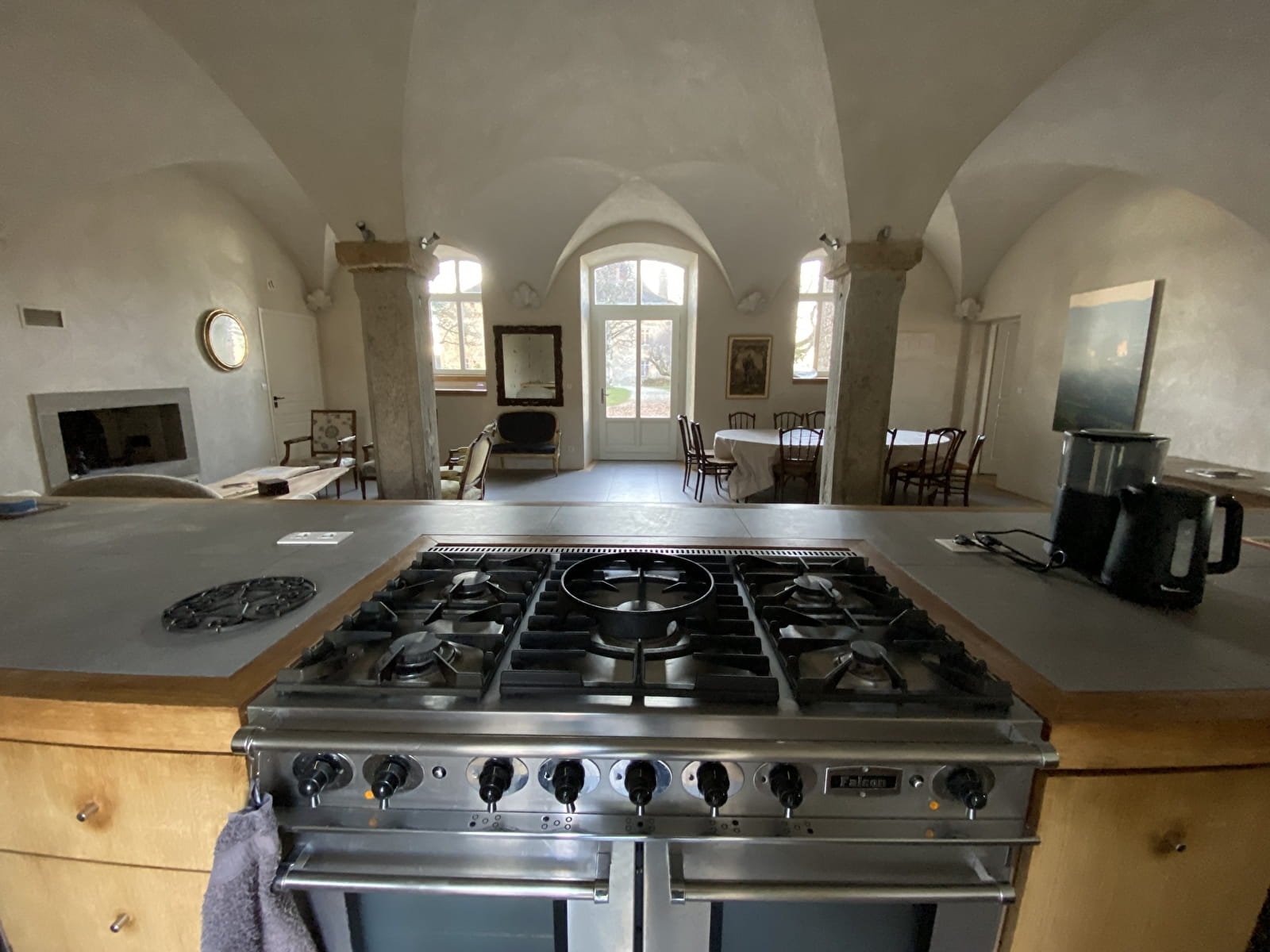 - une grande pièce à vivre avec une cuisine toute équipée et une cheminée,