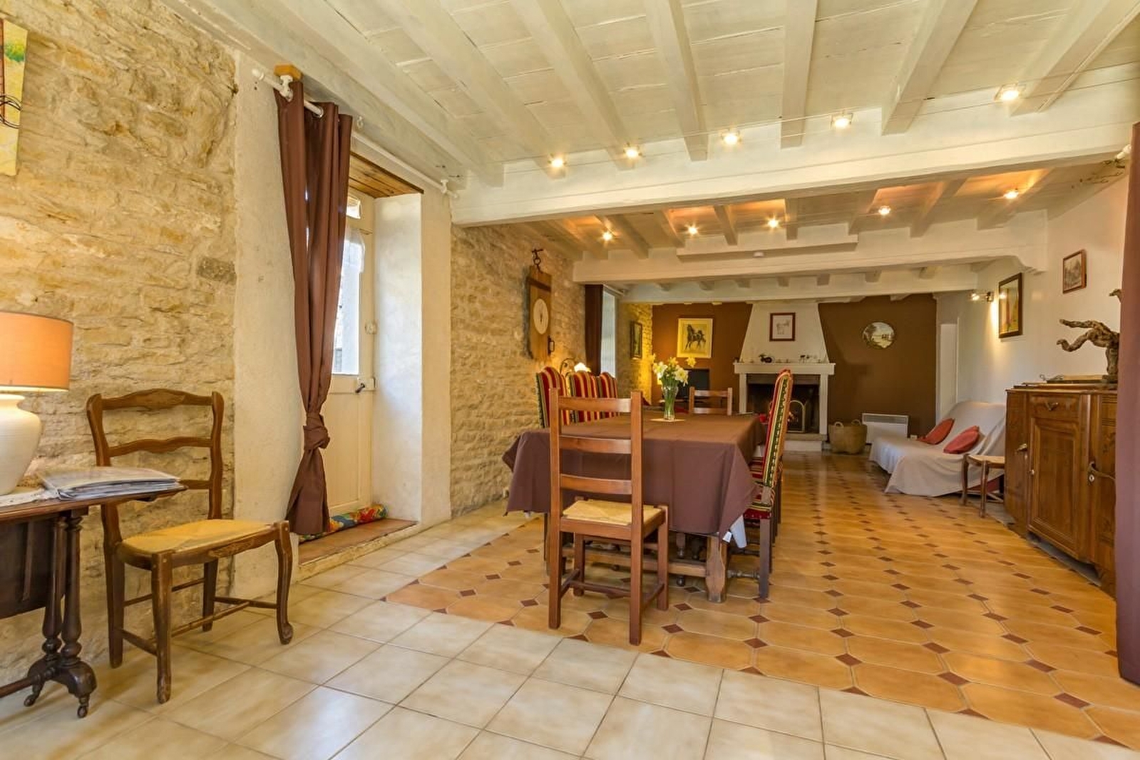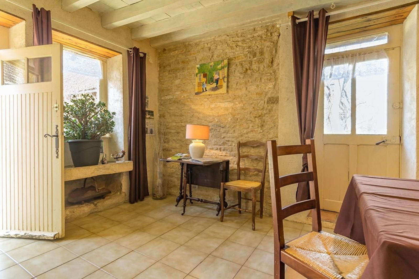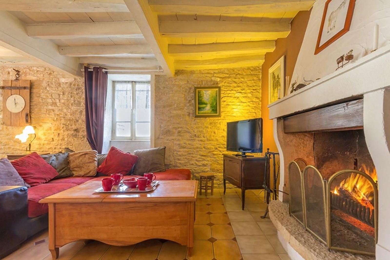 Sur les hauteurs de l'Auxois, maison en pierres indépendante sur une vaste propriété. Rez-de-chaussée : grand salon et salle à manger avec cheminée ouverte et murs en pierres apparentes. Cuisine équipée. WC séparé. A l'étage : une chambre avec 3 lits 90 et une chambre avec un lit 140 (pas de fenêtre directe sur l'extérieur). Salle d'eau avec WC.
