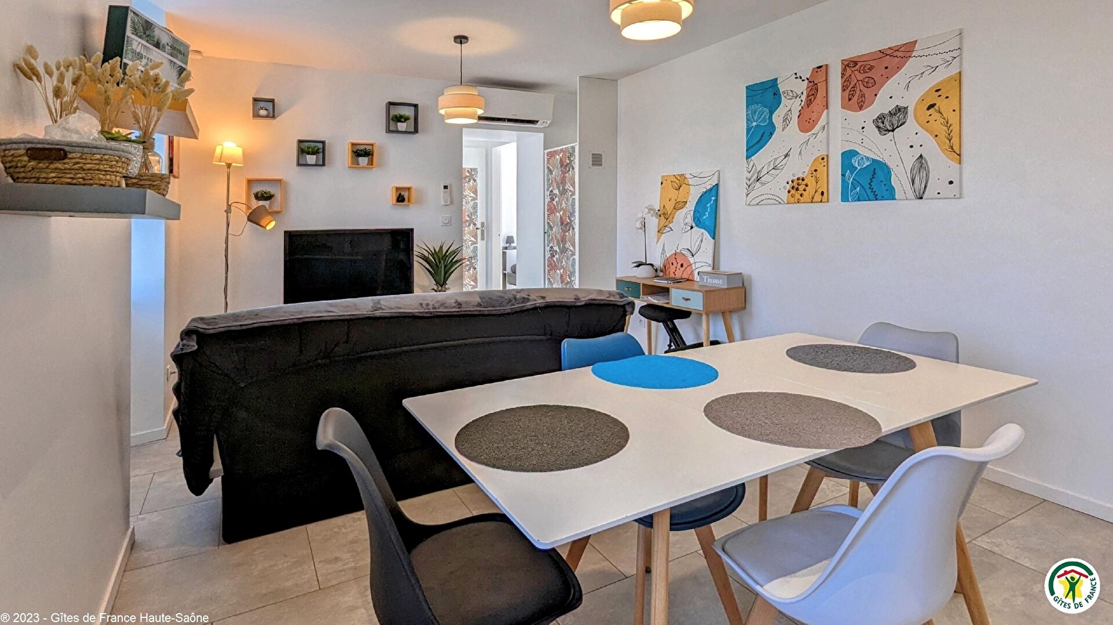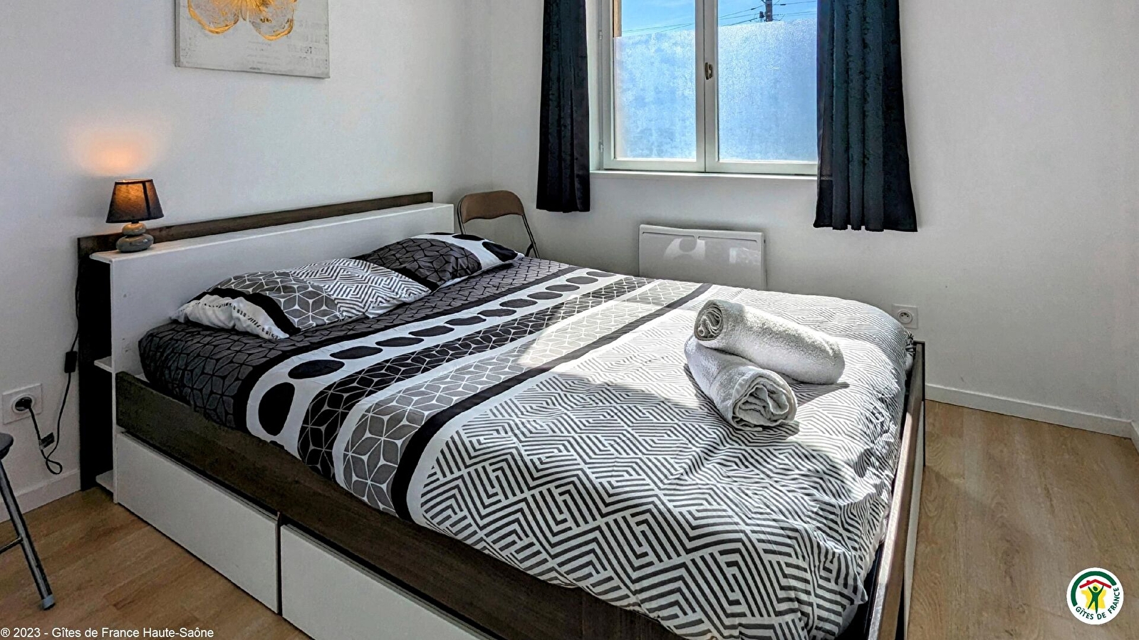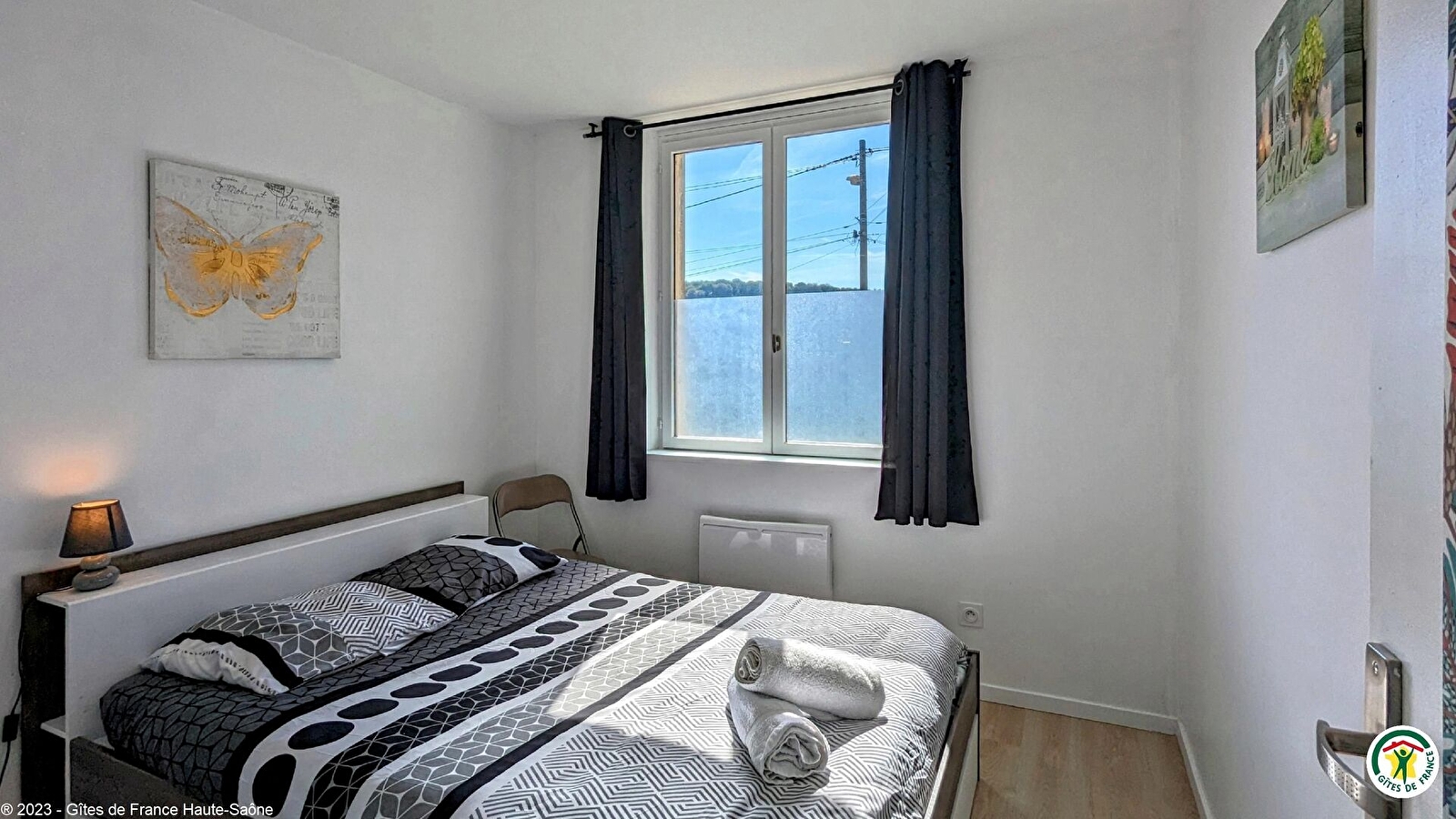 A Héricourt, dans un quartier calme, au rez-de-chaussée d'une maison comprenant un 2ème gîte, appartement entièrement rénové comprenant : cuisine ouverte sur séjour/salon, 1 clic-clac (140 cm), TV, Wifi, 1 chambre avec 1 lit de 140 cm et 1 chambre comprenant 1 lit de 160 cm et 1 dressing. 1 salle d'eau avec douche et WC. Climatisation réversible. Jardin entièrement clos avec salon de jardin, barbecue et balançoire. Parking privatif dans la cour. Possibilité de mettre des vélos à l'abri dans le garage sur demande. Un autre gîte est situé à l'étage avec entrée et jardin indépendant (de l'autre côté de la maison) n° 70G4995 pour 6 pers.