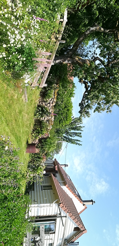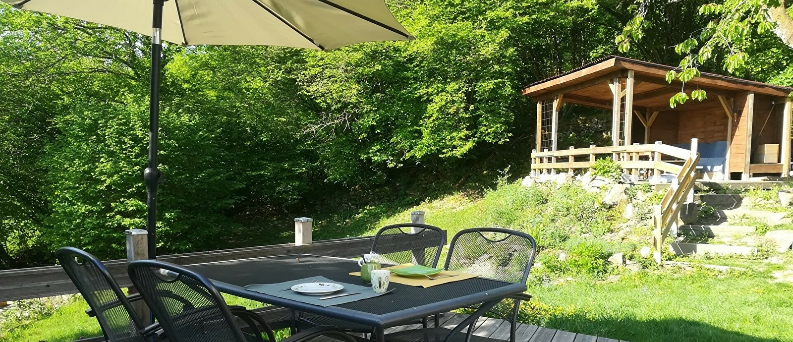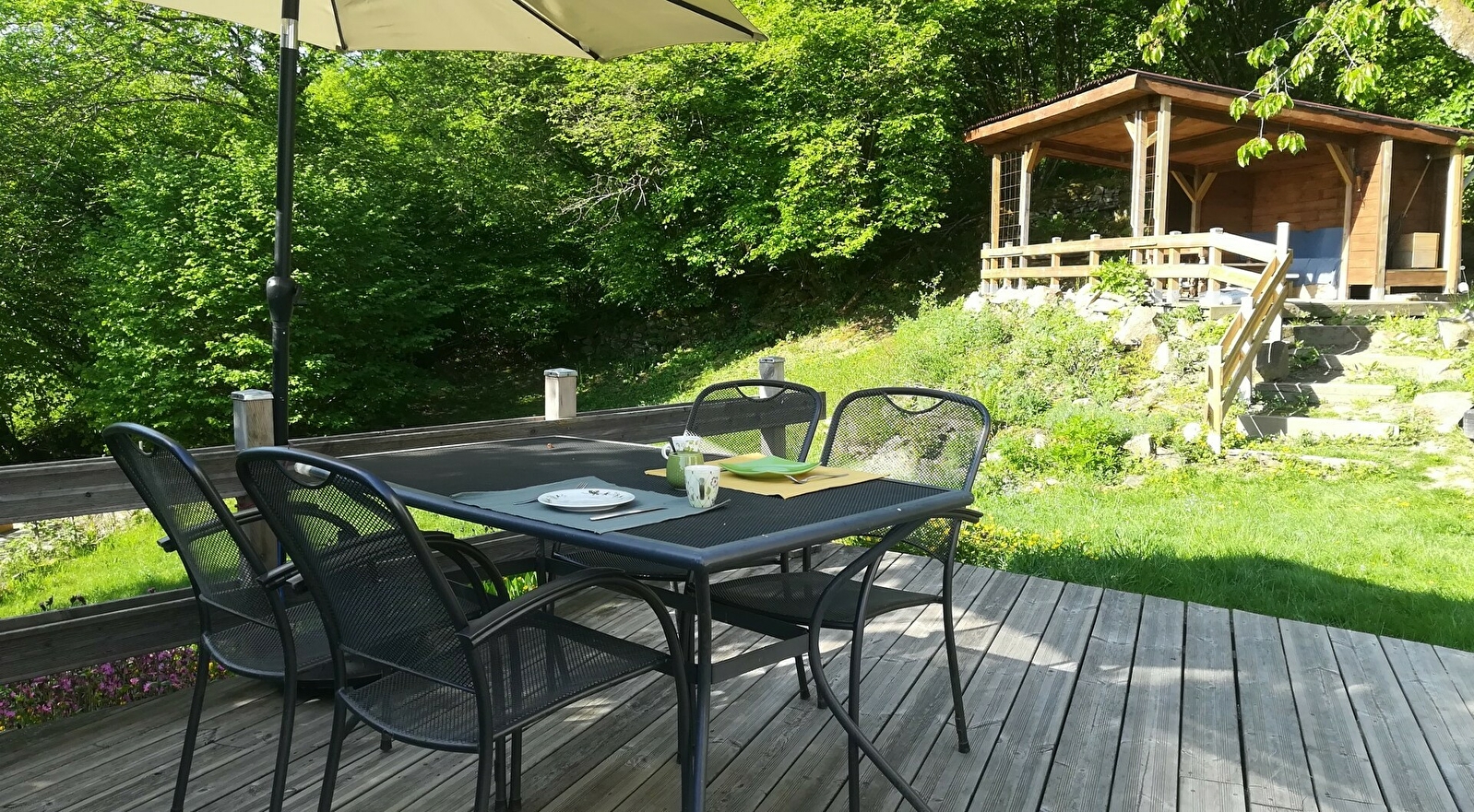 La maison se compose d'un salon et salle à manger avec poêle à bois, d'une cuisine entièrement équipée (réfrigérateur/congélateur, lave-vaisselle, lave-linge, four, micro-ondes, etc.), d'une douche et toilettes séparées dans une pièce supplémentaire. Sans oublier la terrasse attenante à la cuisine et la grande terrasse dans le jardin, avec une vue magnifique.