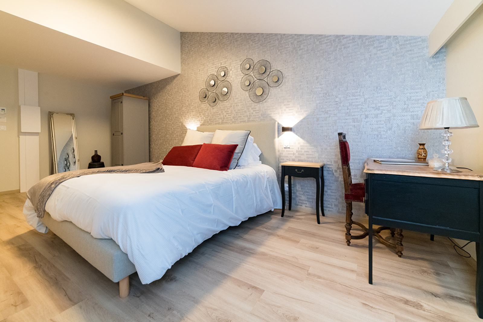 Ambiance cave aux teintes pastels et bordeaux... rappel de la pierre et du velouté du vin. Vous allez sans doute apprécier certains éléments décoratifs authentiques qui vous donneront envie d’une petite dégustation de grands crus et de découvrir les caves du Mâconnais et du Beaujolais !