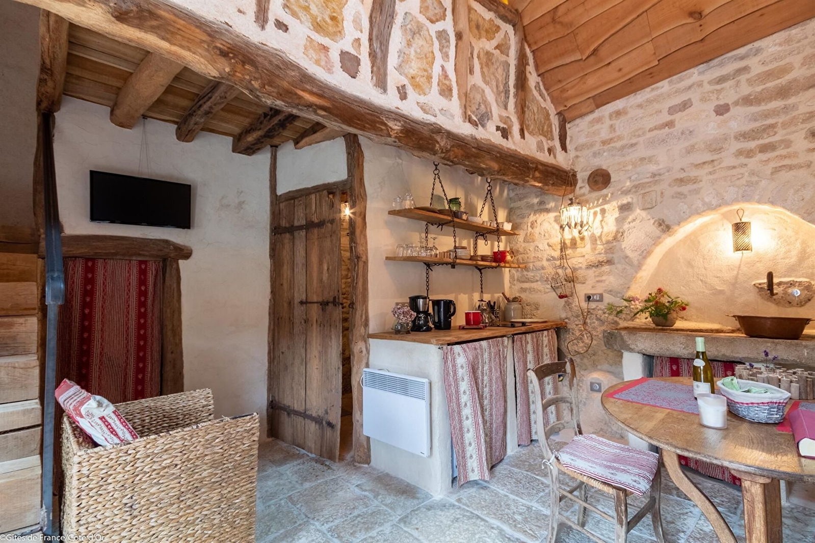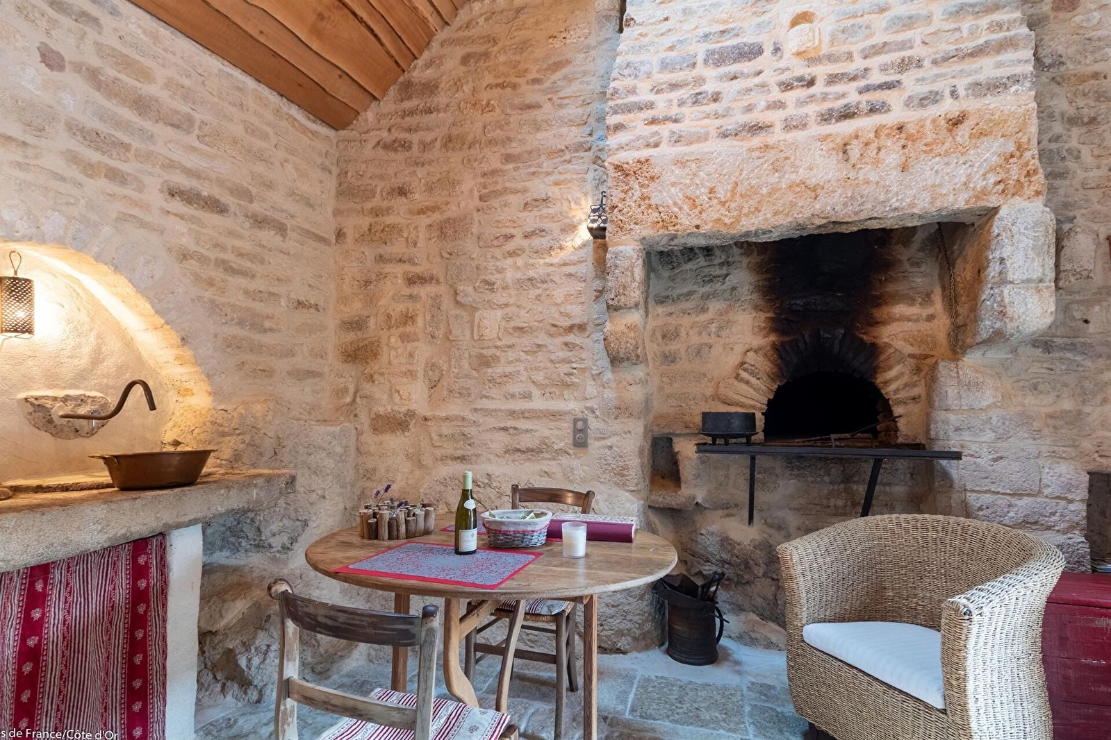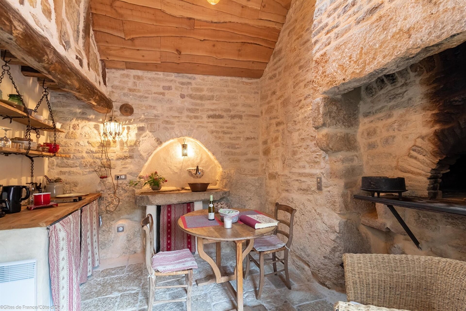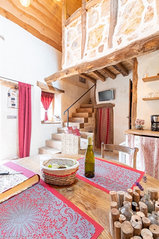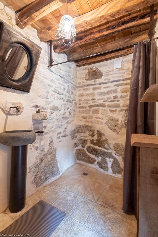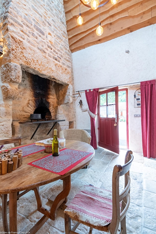 Dans un joli hameau calme et fleuri de la campagne bourguignonne, gîte tout en pierre, construit vers le 11ème siècle sur des roches et devenu au 19ème le four à pain du village. Restauré avec authenticité et originalité, ce paradis pour amoureux des vieilles pierres propose au rez-de- chaussée un séjour avec coin cuisine et une salle d'eau avec WC. Chambre en mezzanine avec 1 lit bas de 140. Parking. Terrasse privée. Buanderie commune avec un petit gîte mitoyen et un grand gîte à proximité. Chauffage électrique compris. Location de vélos électriques sur la commune à 2 km.
