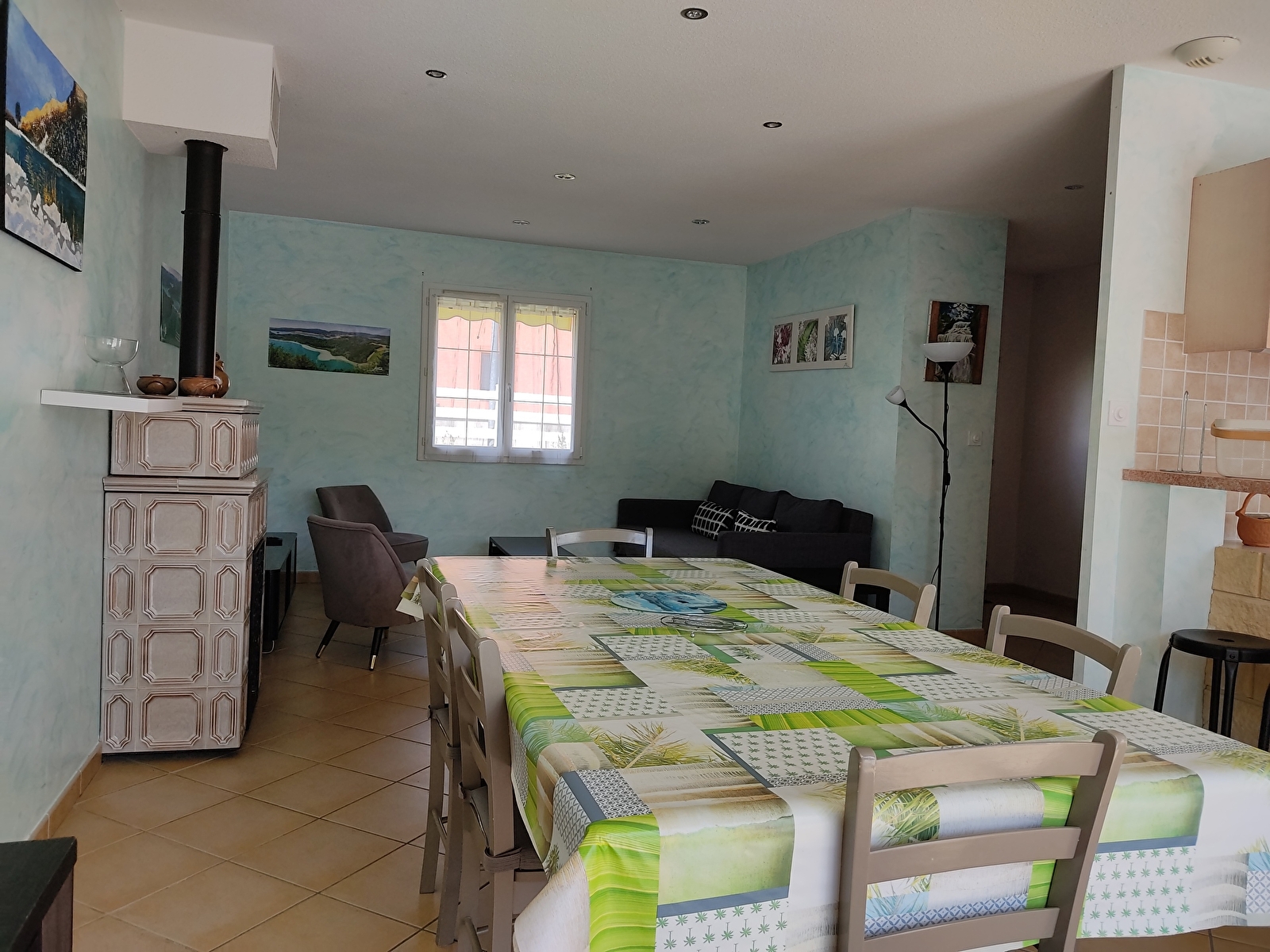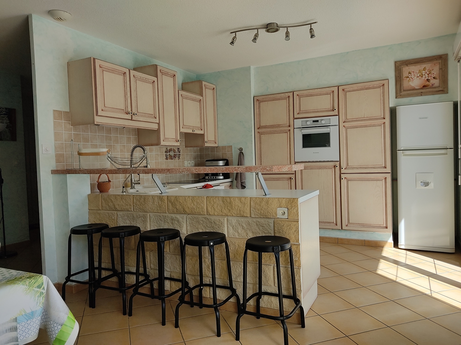 Cuisine équipée (frigo-congel, lave vaisselle, four, micro ondes, plaque induction) et ouverte sur un vaste salon-séjour avec TV et canapé convertible.
