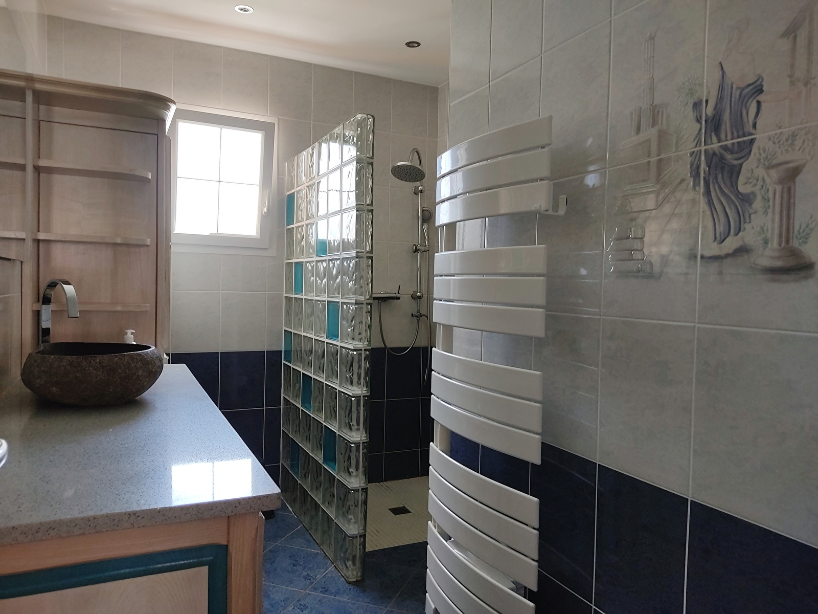 Salle de bain avec douche à l’italienne, buanderie avec lave linge. Pour l’extérieur : barbecue, transats, auvents avec table pour repas près de la piscine.