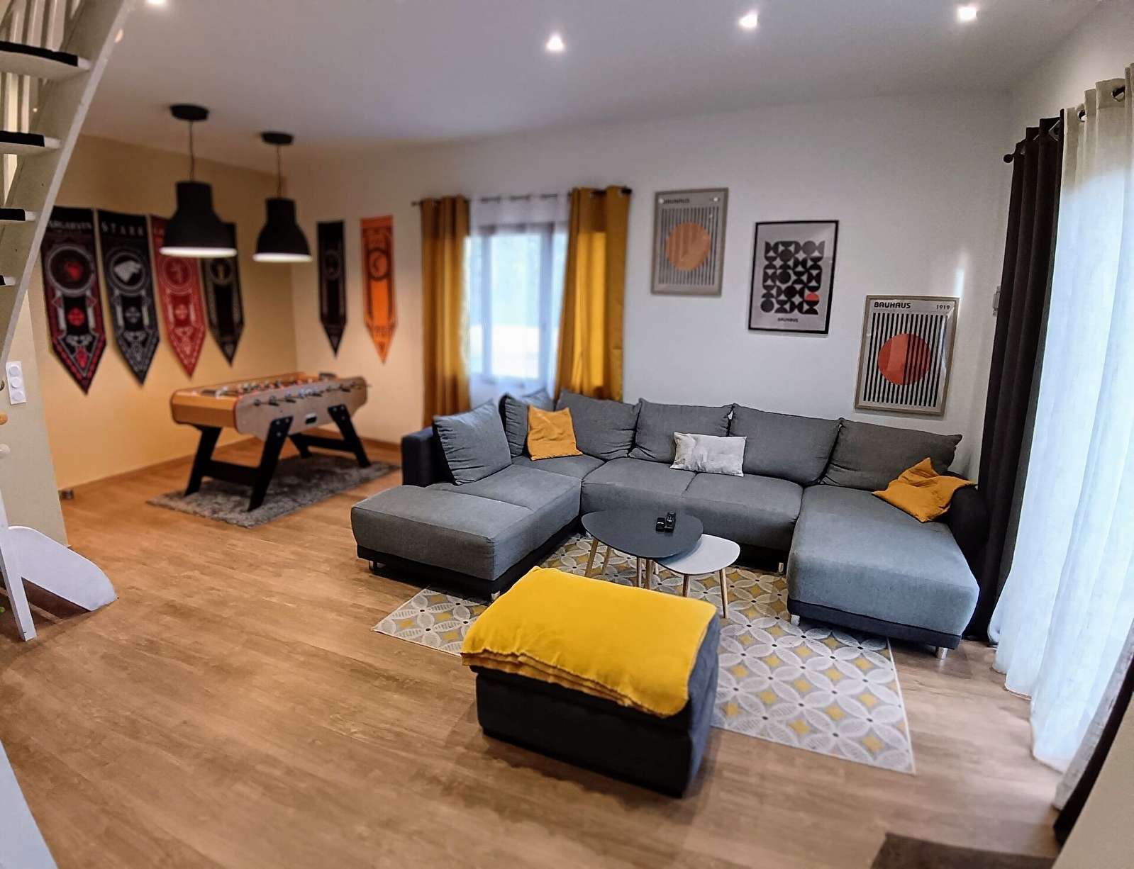 Le gîte, mitoyen à l'habitation des propriétaires, offre au rez-de-chaussée un grand double séjour avec poutres et pierres apparentes : salle à manger, cuisine équipée, salon confortable, espace de jeux et WC. Un poêle à granulés réchauffera vos soirées hivernales. A l'étage, 4 belles chambres accueillant chacune de 2 à 4 personnes : 1 chambre avec 2 lits 90x190 jumelables, 1 chambre avec 3 lits 90x190, dont 2 jumelables, 1 chambre avec un lit 140 et une chambre familiale avec 4 lits 90x190 dont 2 jumelables. Ces 4 chambres disposent chacune d'une salle d'eau avec WC. La 5ème chambre "le dortoir", idéale pour les ados, est accessible par un escalier depuis le salon ; elle est composée de quatre lits simples (80x200).