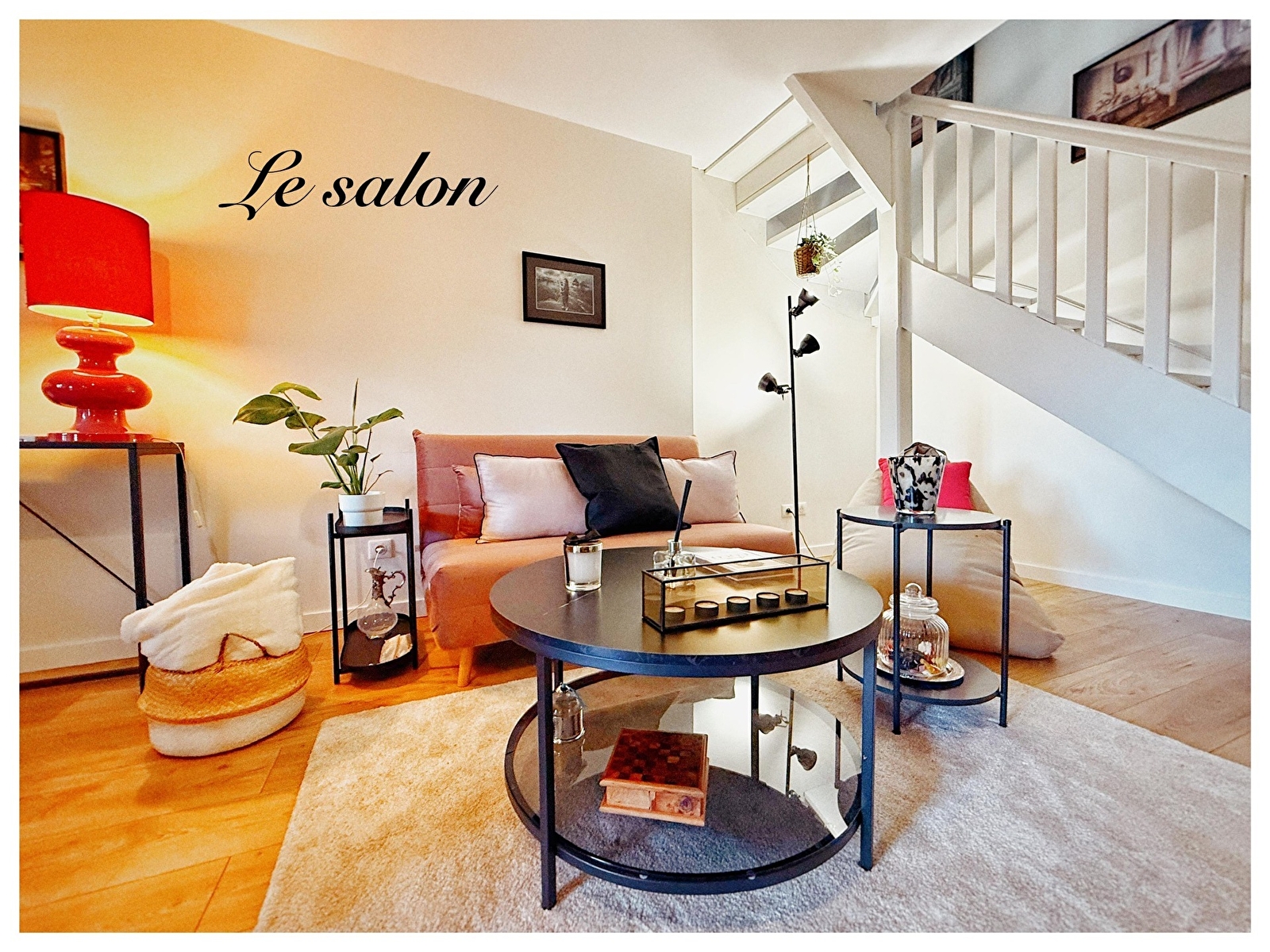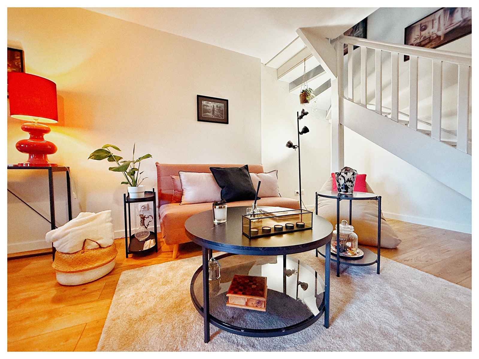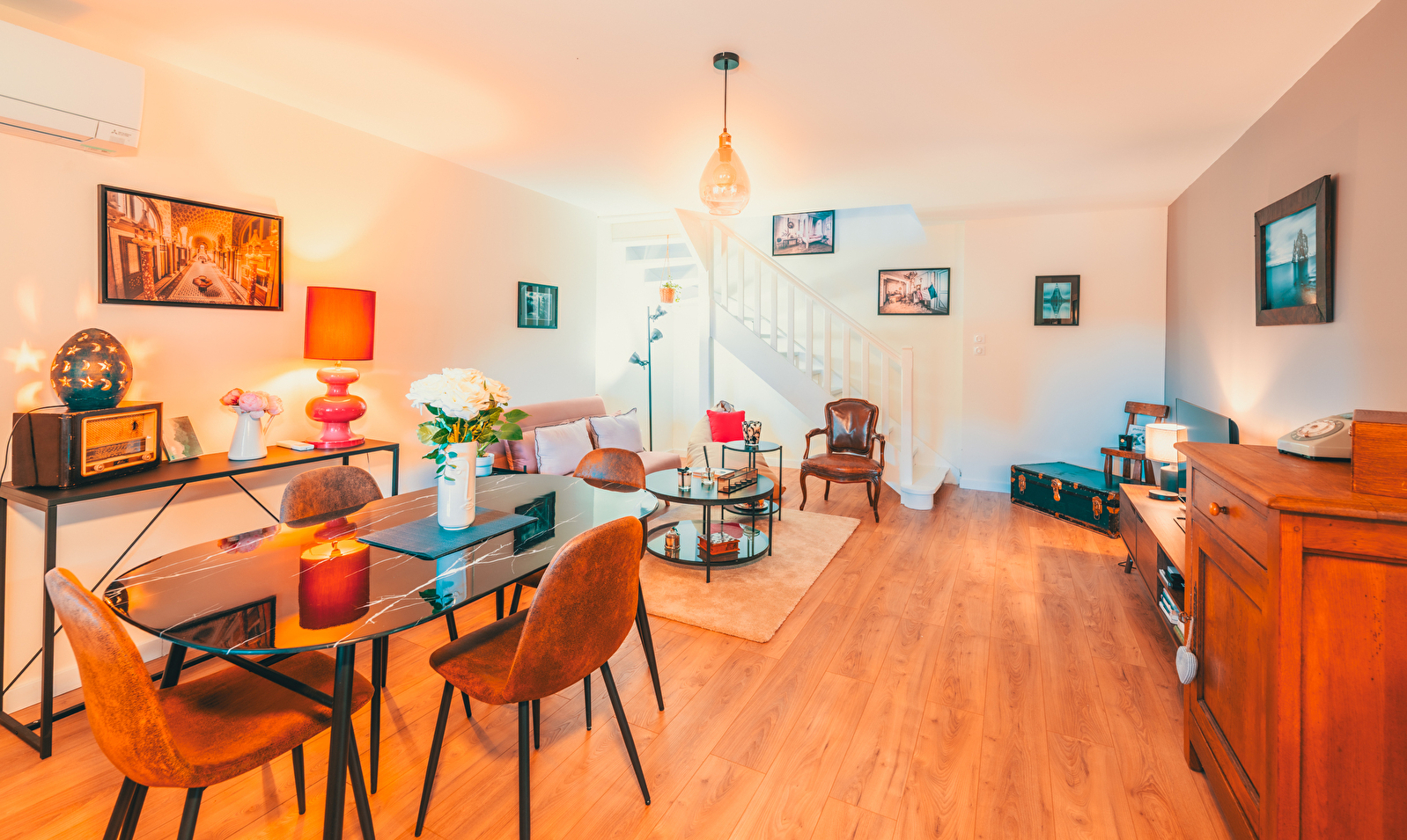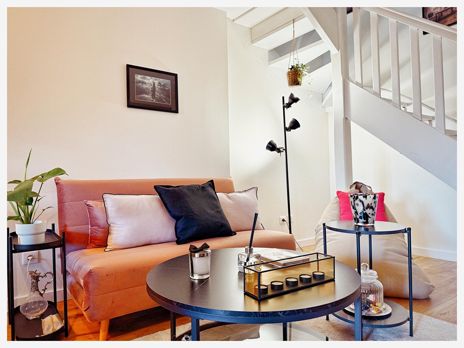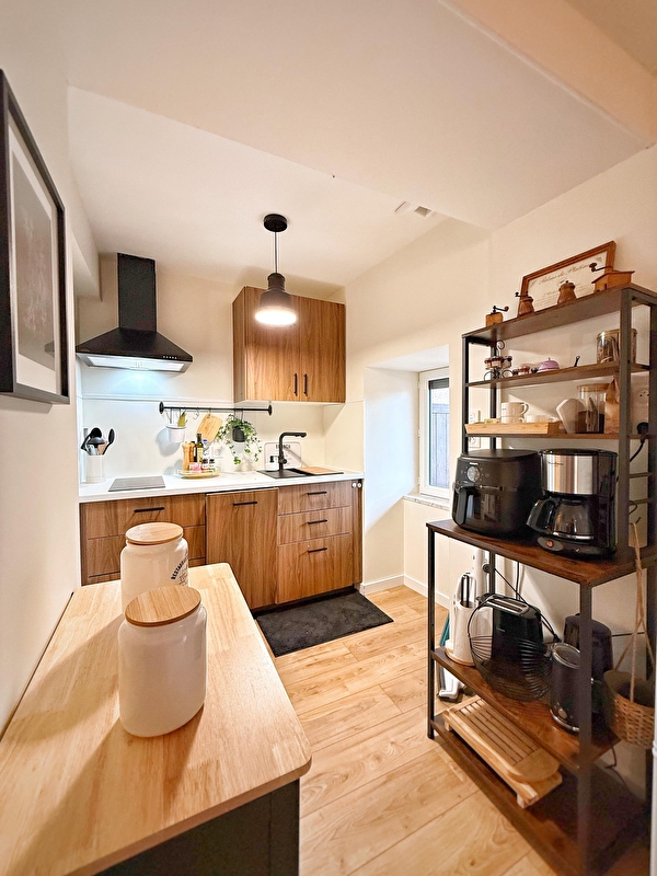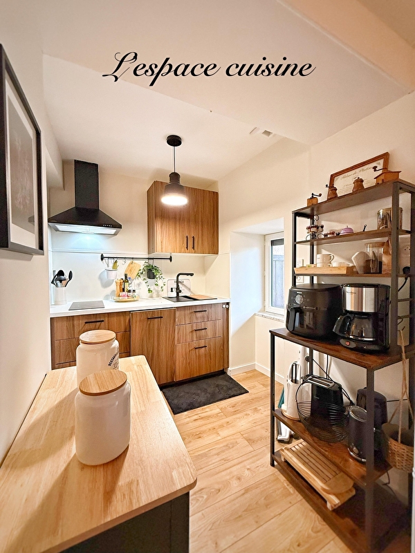 Charmante maison en pierre sur cave entièrement rénovée et climatisée de 50m² comprenant petite une terrasse, un salon avec un canapé lit 140 cm, une salle à manger, une cuisine équipée, une salle de douche et un WC et une chambre en mezzanine avec un lit 160 cm