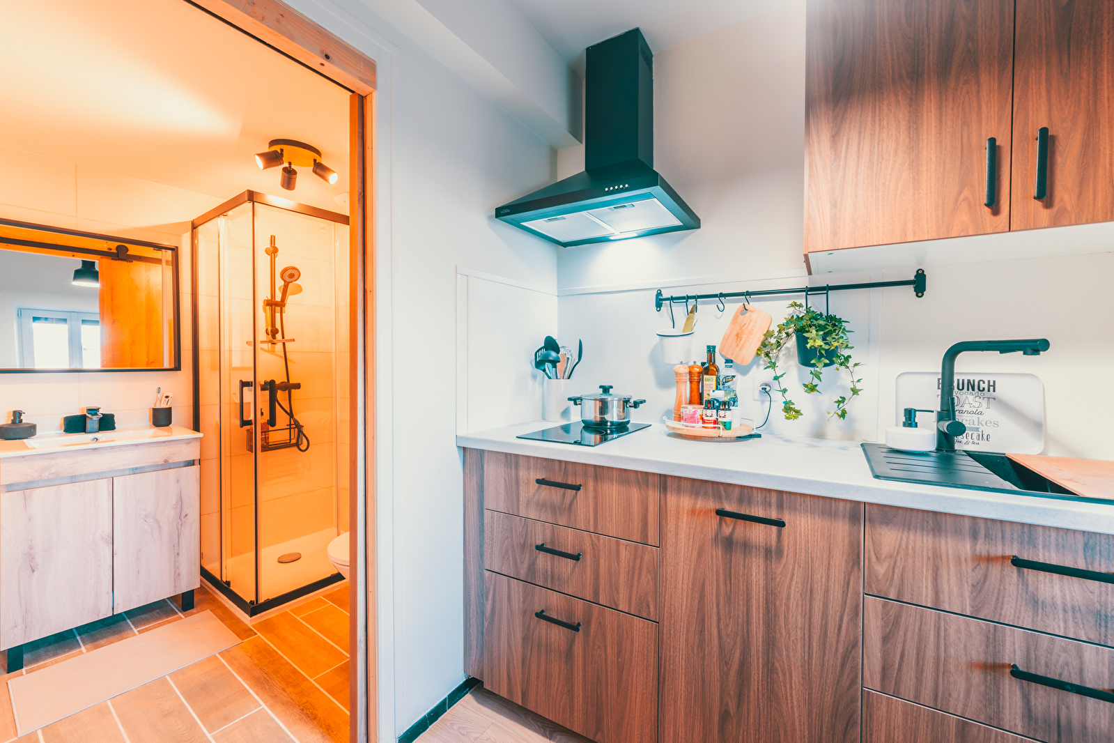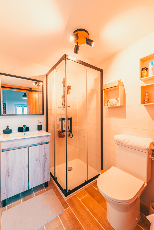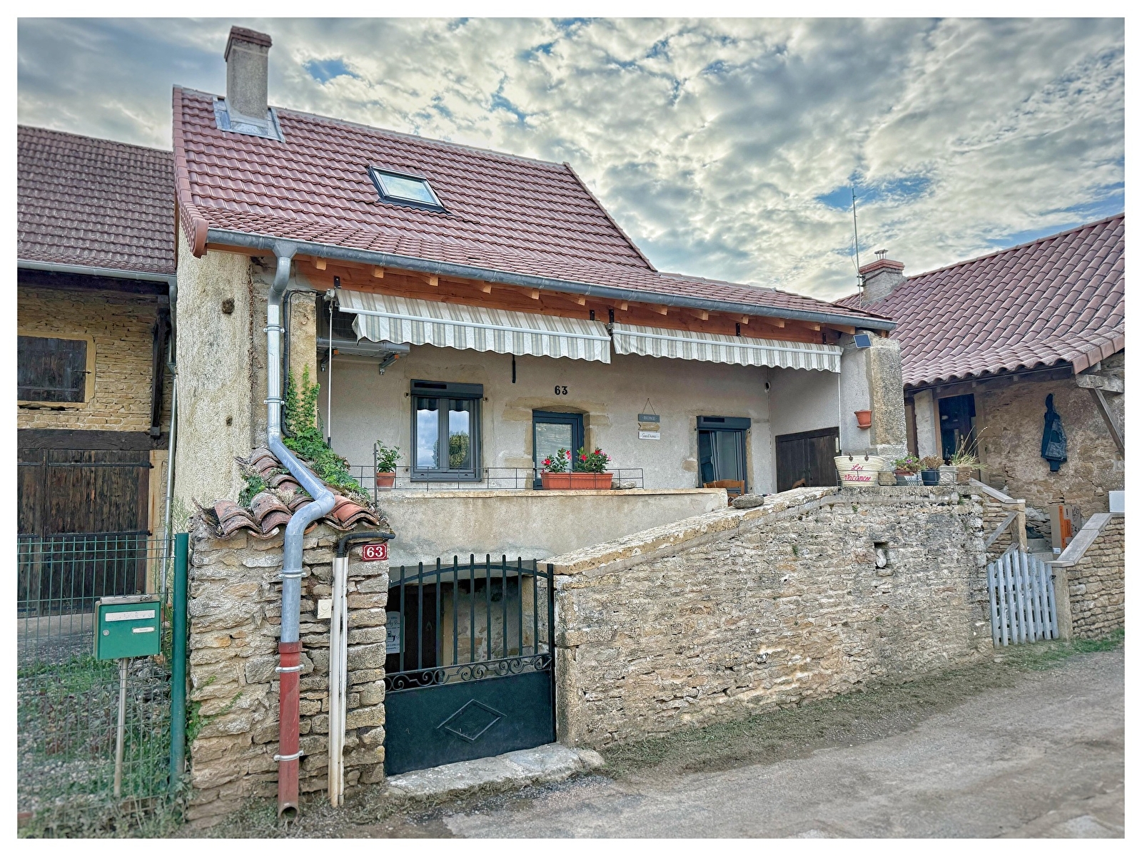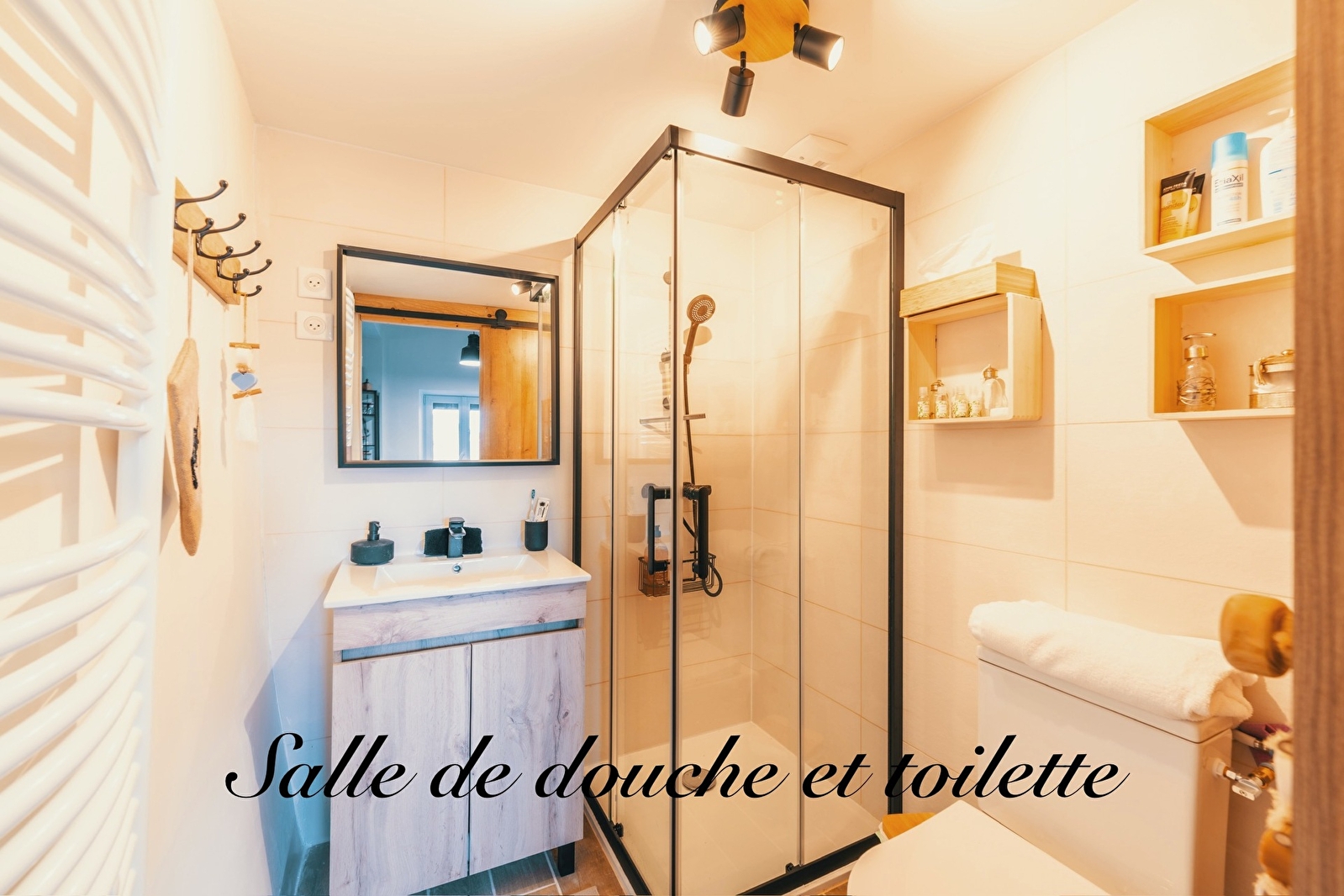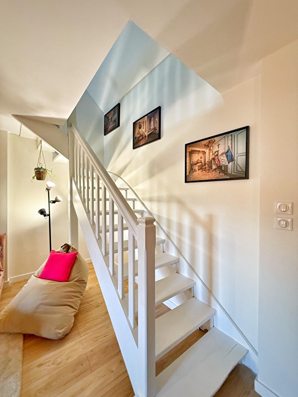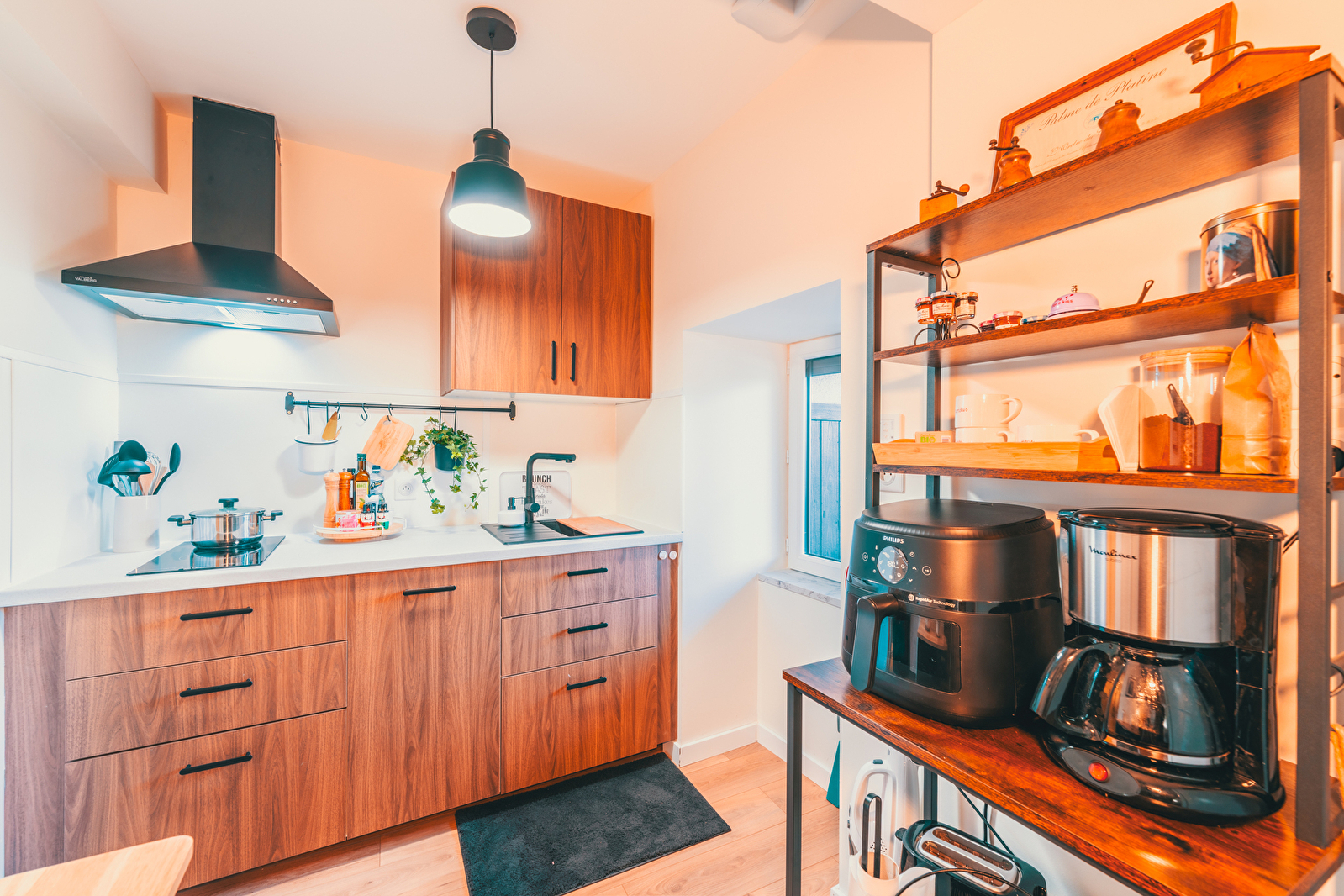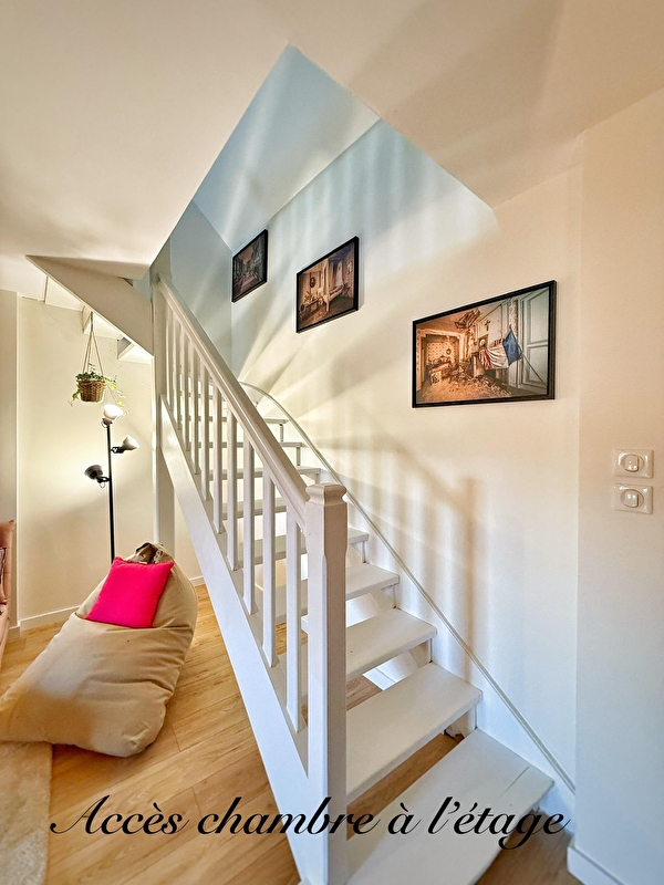 Charmante maison en pierre sur cave entièrement rénovée et climatisée de 50m² comprenant petite une terrasse, un salon avec un canapé lit 140 cm, une salle à manger, une cuisine équipée, une salle de douche et un WC et une chambre en mezzanine avec un lit 160 cm
