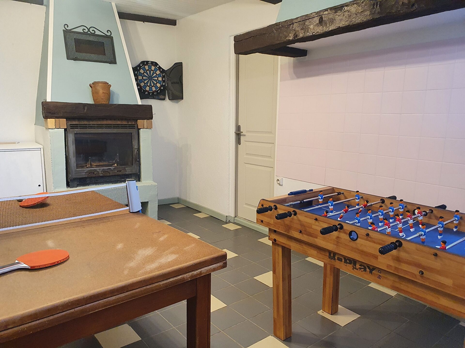 A l’étage, la palier dessert 3 chambres (lit 140x190cm). La plus spacieuse est équipée d’un lit bébé en bois évolutif. Salle d’eau avec douche à l’italienne et WC. Salle de jeux avec baby foot et table de ping pong.