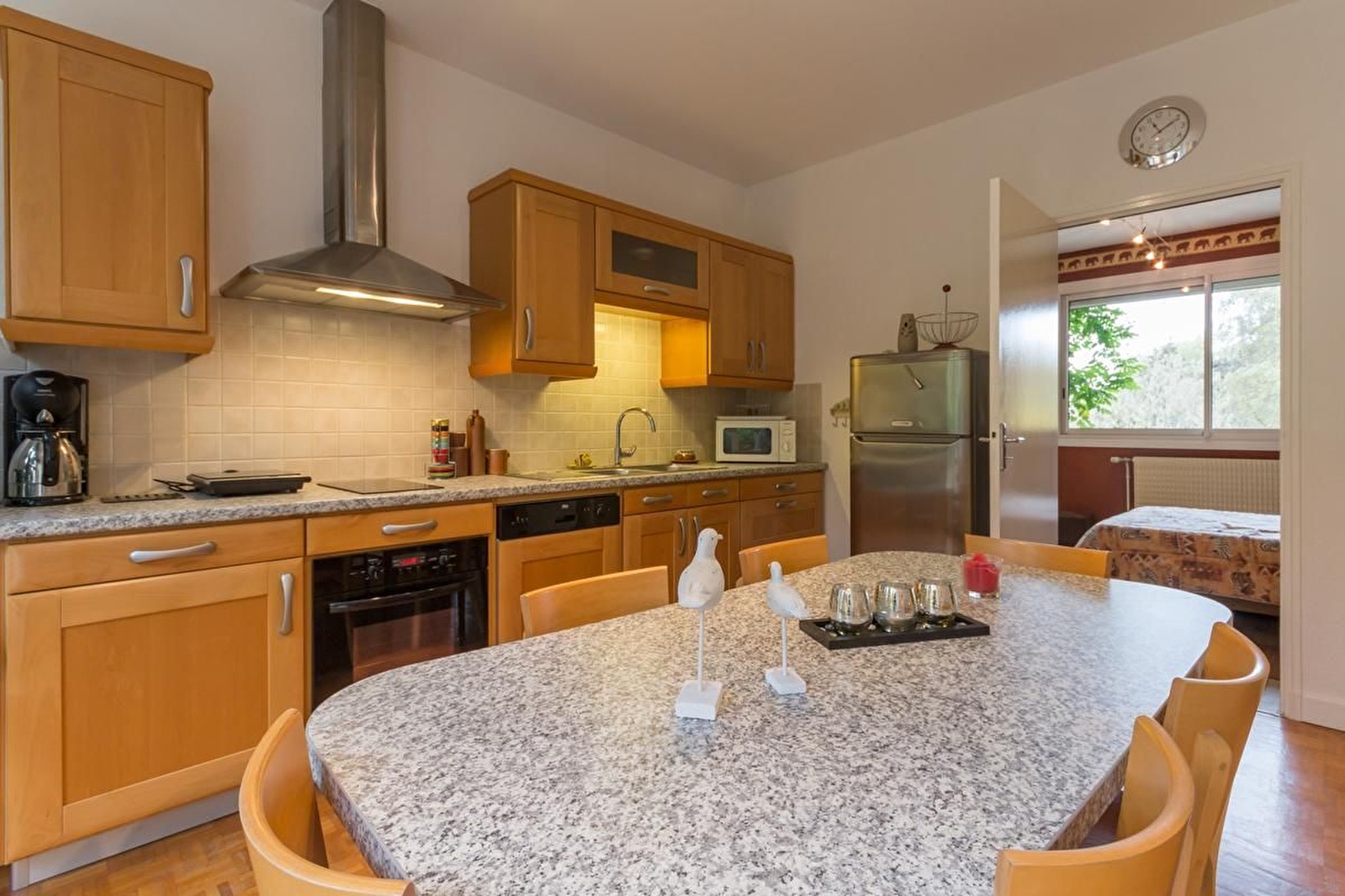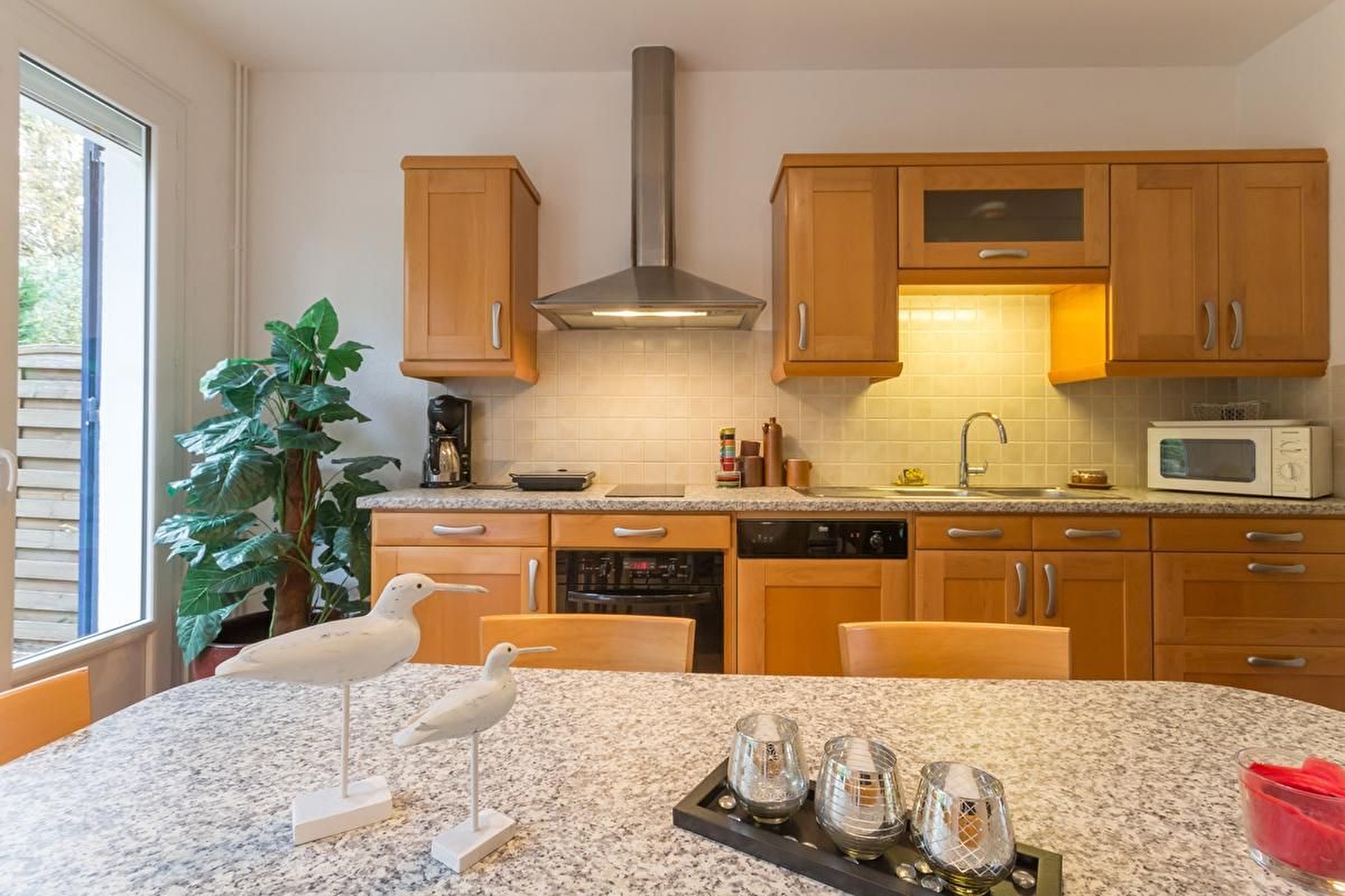 Belle cuisine indépendante avec baies vitrées donnant sur terrasse. Coin salon dans entrée. 2 chambres (1 lit 140) et 1 lit 160. Salle d'eau. WC.