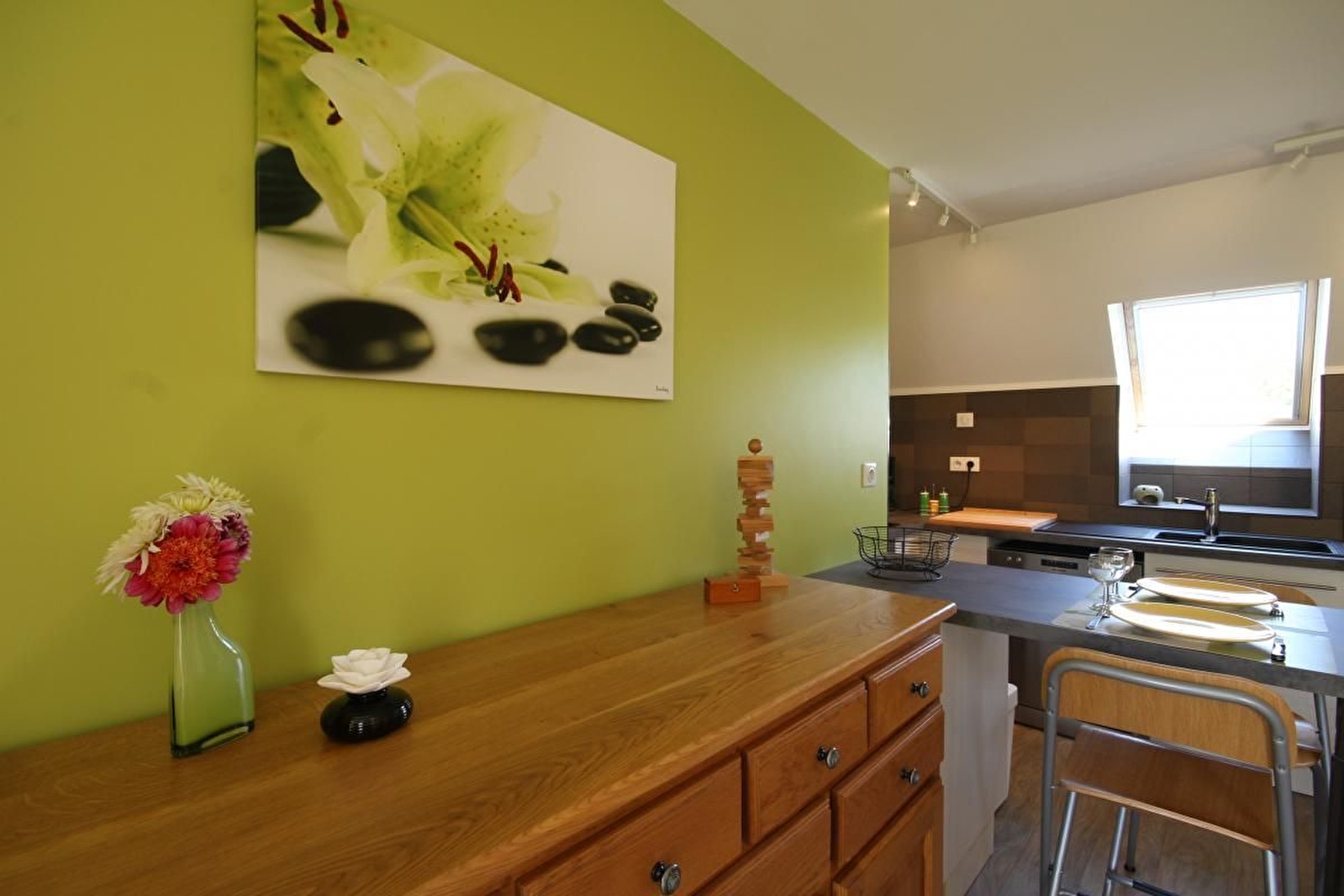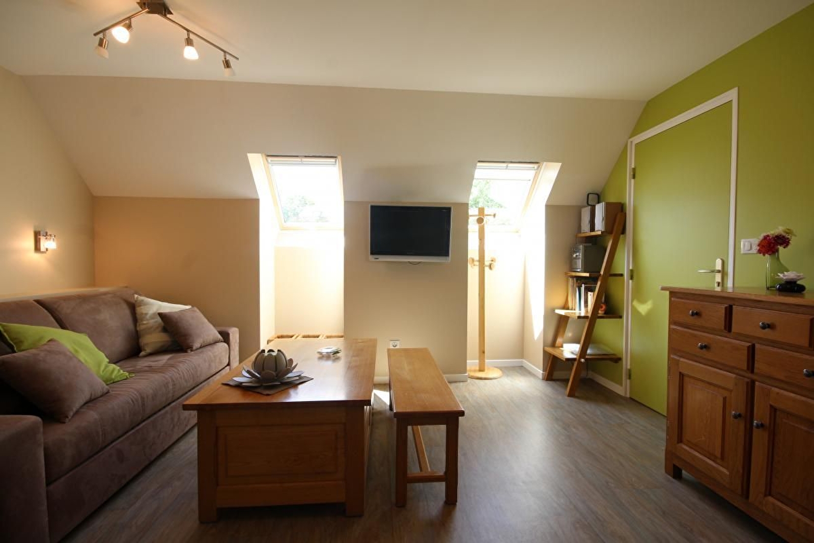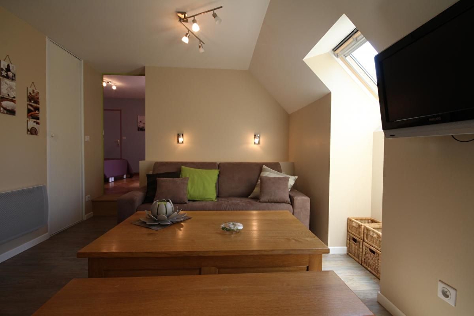 Séjour de 20 m² avec canapé convertible de très bon confort (offrant la possibilité d'accueillir une troisième personne), cuisine toute équipée (plaques vitrocéramiques, four), chambre de 13 m² avec deux lits 80 x 190 jumelés et séparables sur demande donnant sur balcon privatif de 6 m², belle salle d'eau avec WC. Accès au gîte par buanderie commune au rez-de-chaussée (machine à laver et sèche-linge communs). Lit bébé.