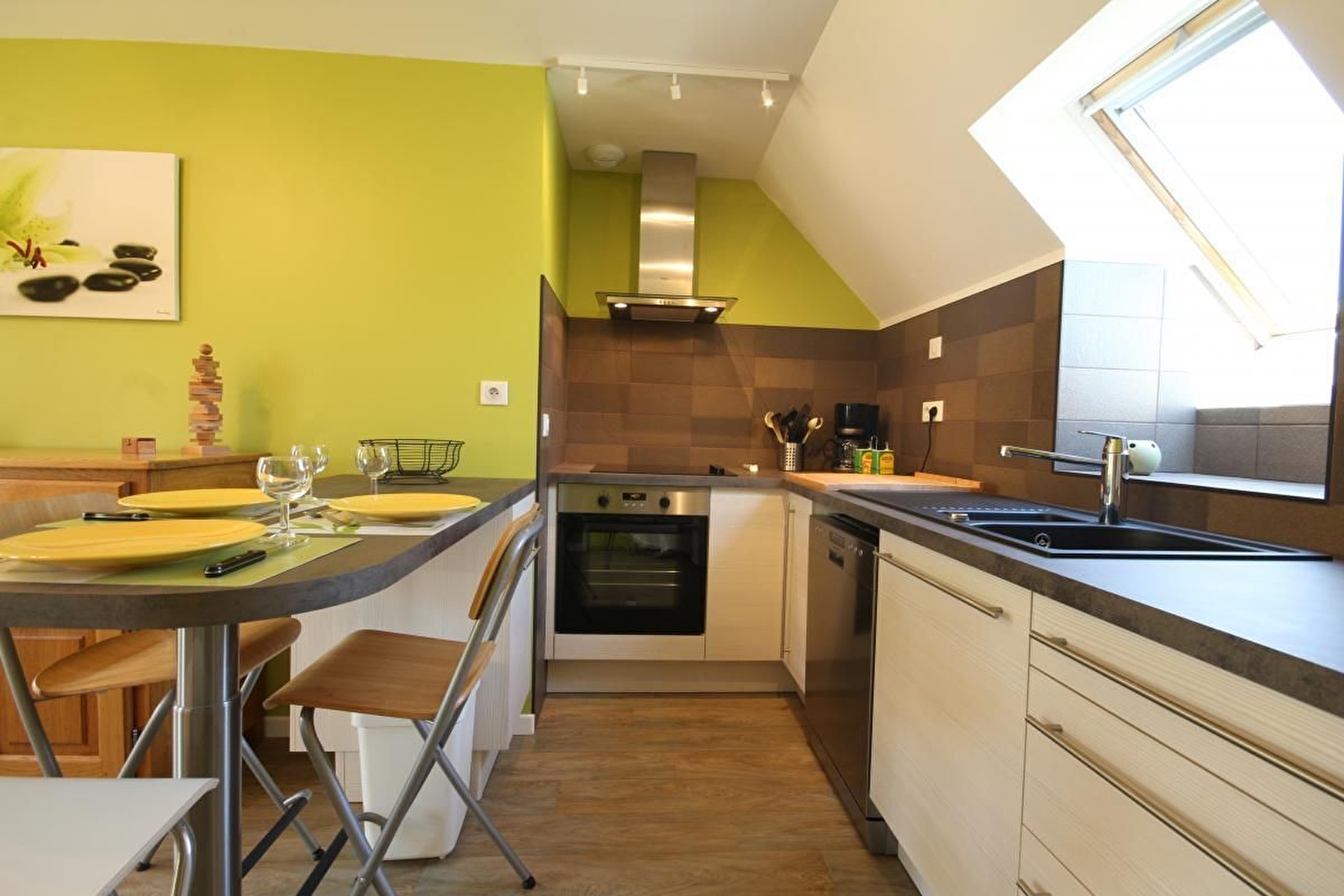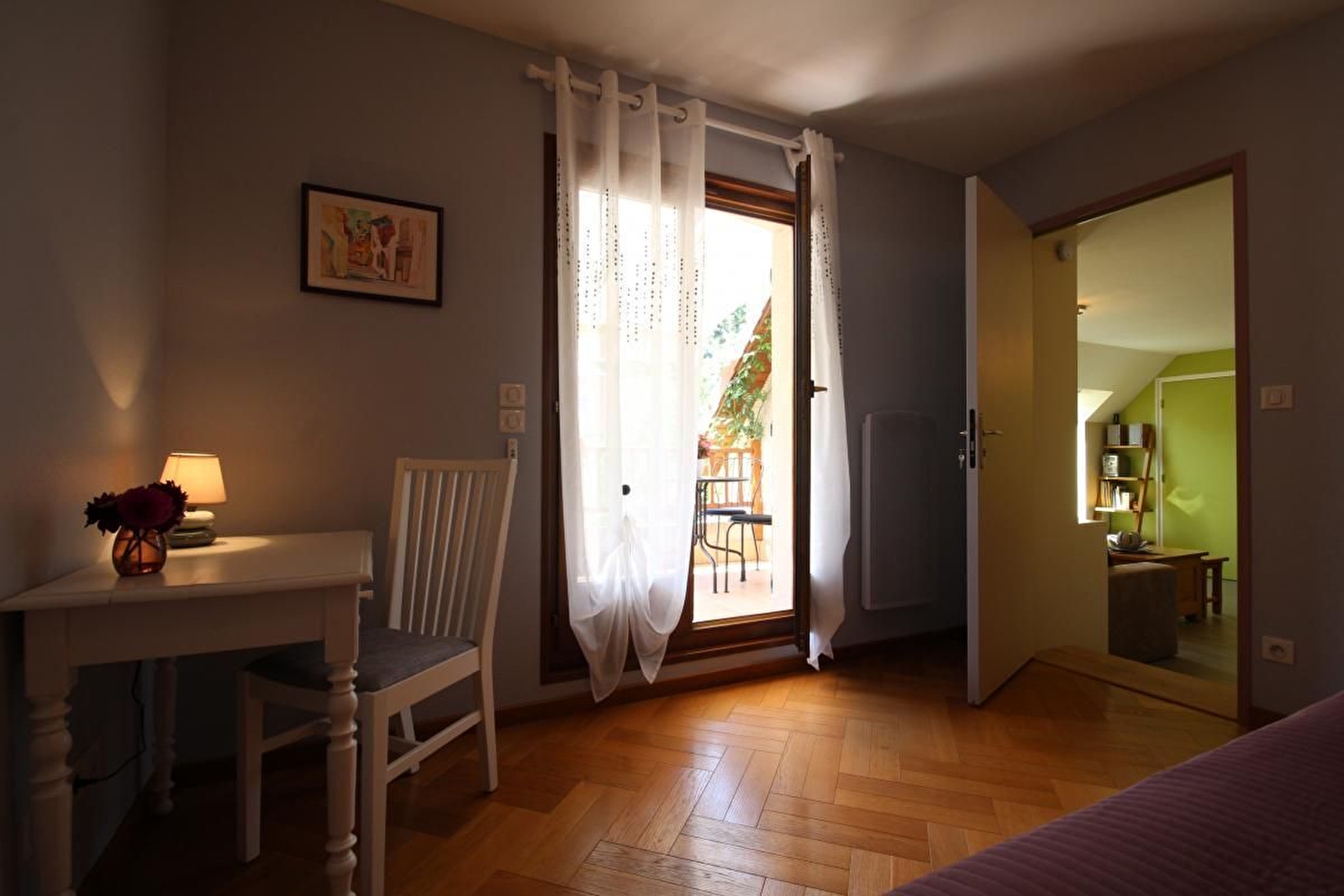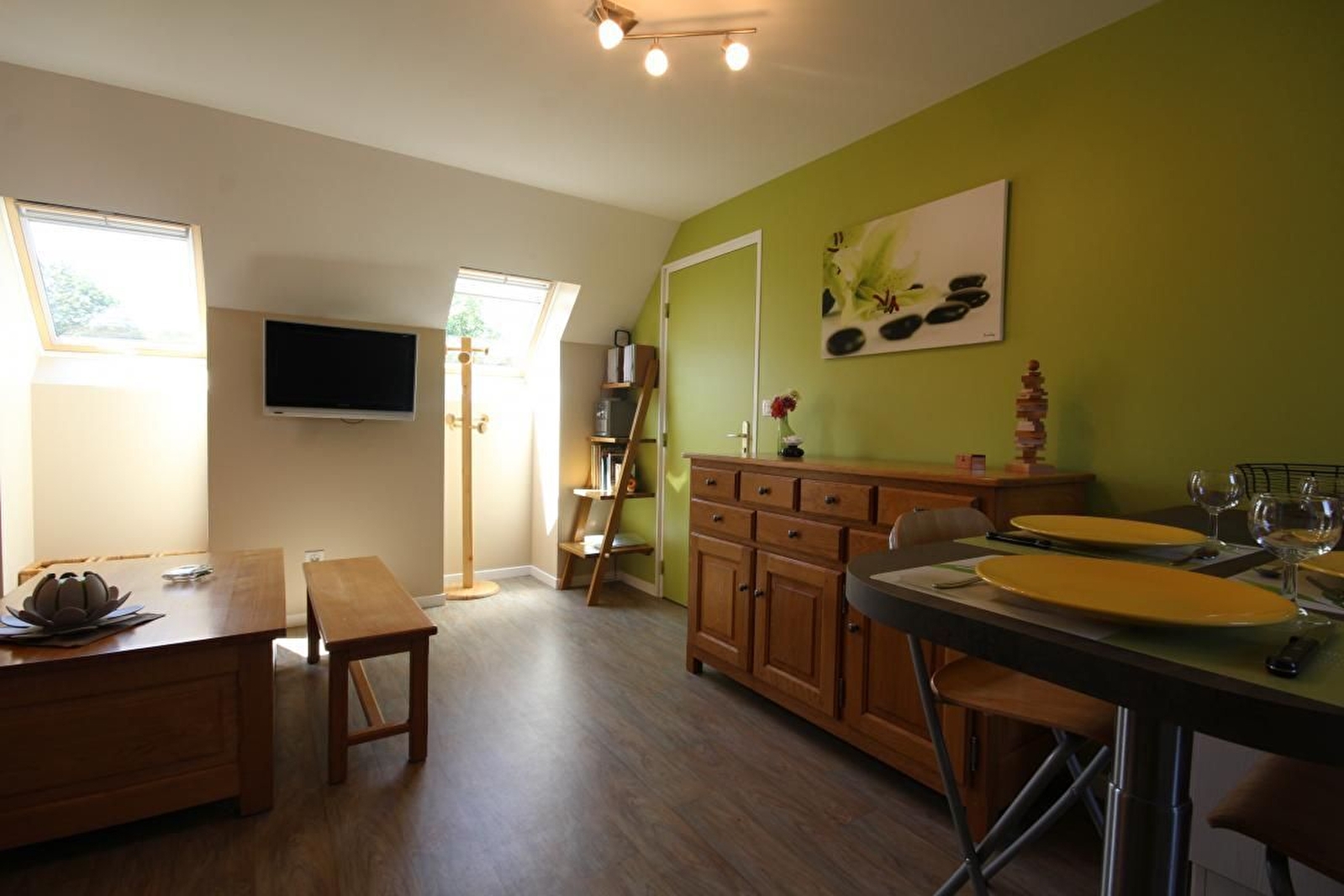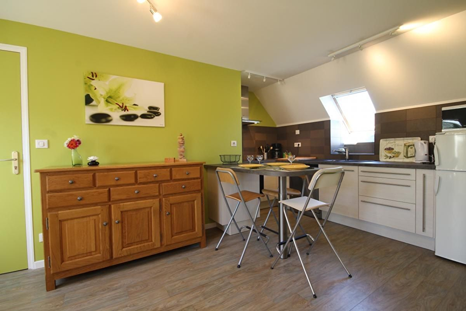 Séjour de 20 m² avec canapé convertible de très bon confort (offrant la possibilité d'accueillir une troisième personne), cuisine toute équipée (plaques vitrocéramiques, four), chambre de 13 m² avec deux lits 80 x 190 jumelés et séparables sur demande donnant sur balcon privatif de 6 m², belle salle d'eau avec WC. Accès au gîte par buanderie commune au rez-de-chaussée (machine à laver et sèche-linge communs). Lit bébé.