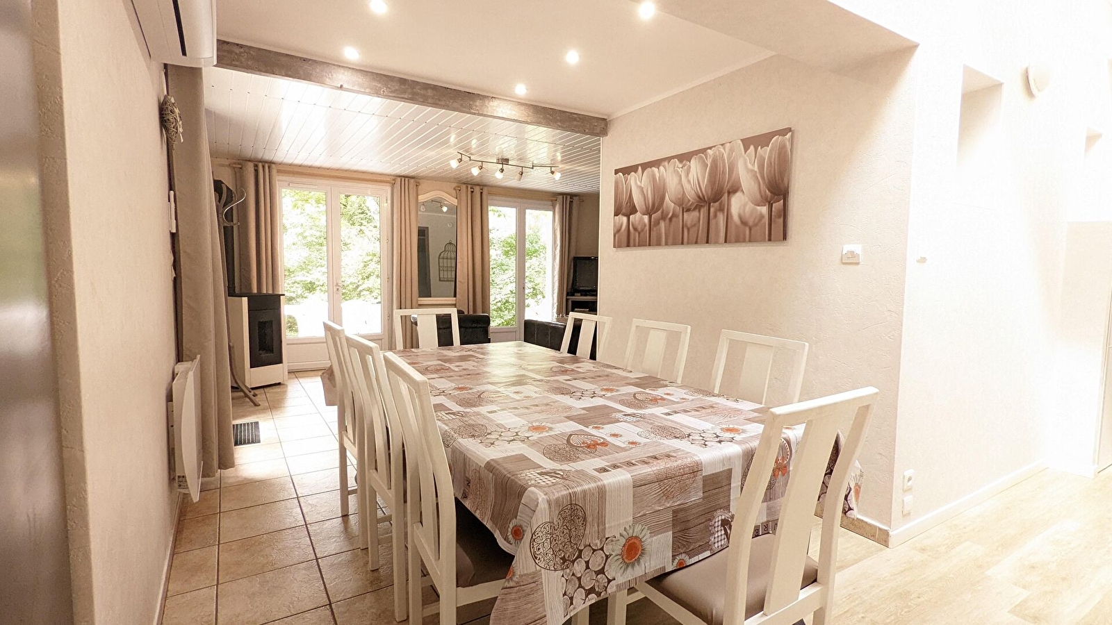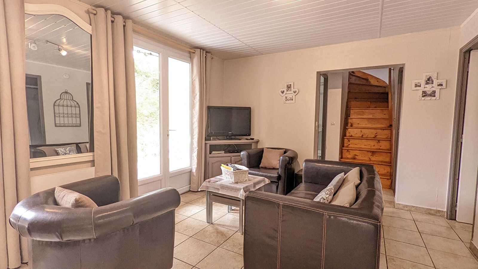 Au rez-de-chaussée, un salon-séjour avec une cuisine ouverte. Le salon est équipé d'un poêle à granulés, fournis gratuitement. 2 chambres composées chacune d'un lit double 160x200 et d'un lit bébé. 2 salles d'eau dont une avec douche à l'italienne. 2 toilettes séparés dont un très spacieux permettant l'accès aux personnes à mobilité réduite. Salle avec baby-foot.