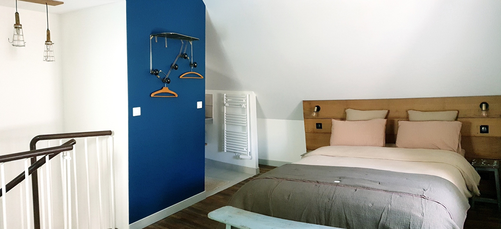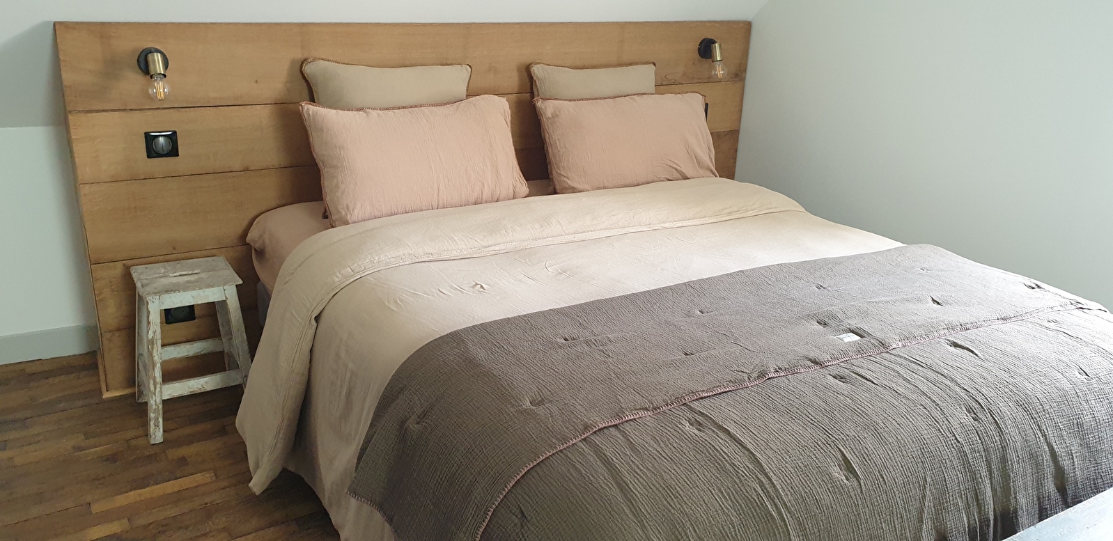 Lumineuse et spacieuse (23 m²), la chambre à l’étage se compose d’un lit double de très bon confort (Queen Size), d’une salle de bain ouverte (linge de toilette inclus) et de wc indépendants.