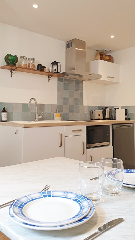 Une cuisine de 12 m² au rez-de-chaussée offre une totale indépendance, quelle que soit la durée de votre séjour (combiné four micro-ondes, plaques induction, bouilloire, grille-pain, cafetière Nespresso et à piston...). Nous ne proposons pas le petit déjeuner mais vous aurez à votre disposition thé, café (moulu et dosettes), beurre, confiture, céréales...