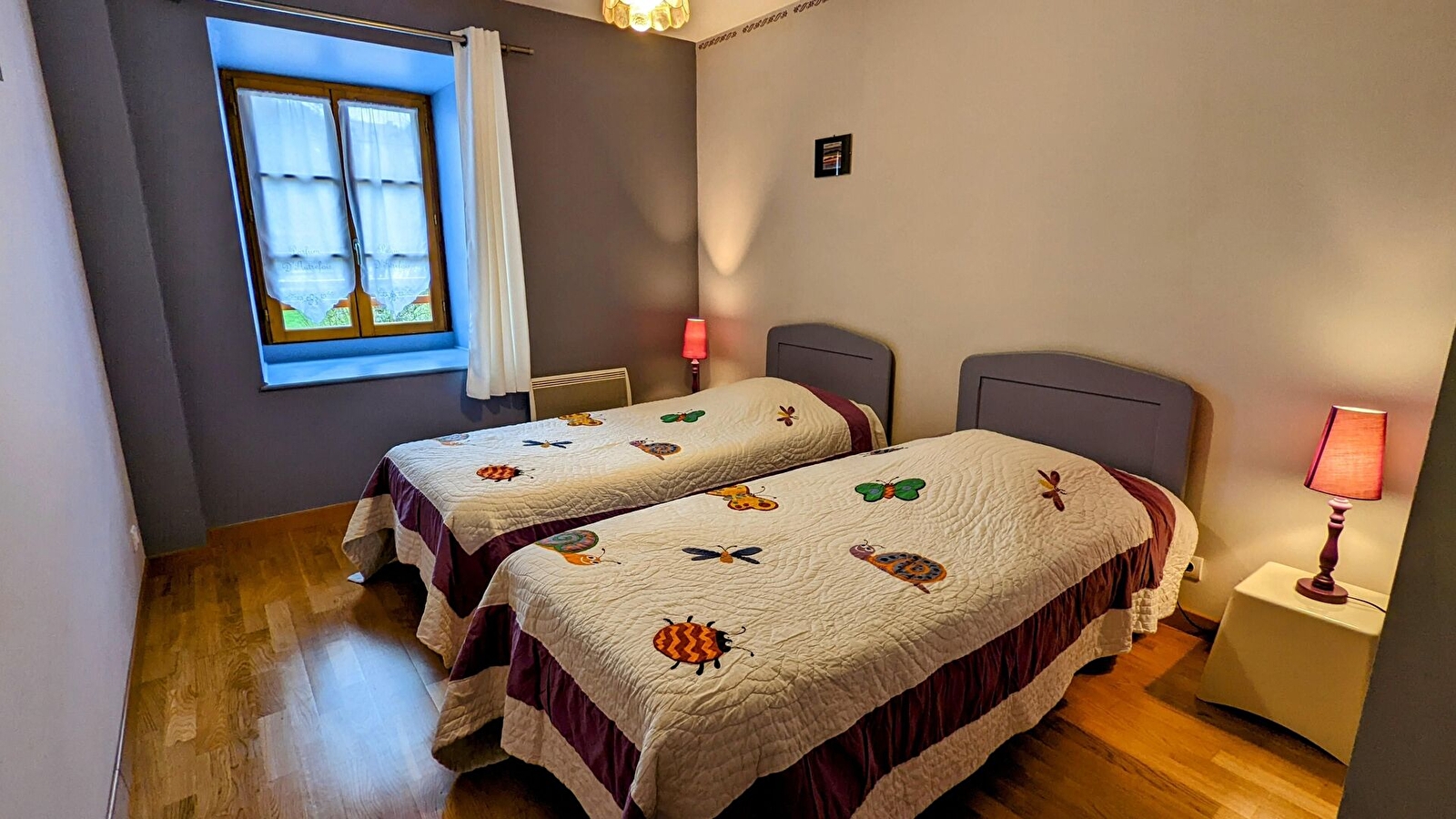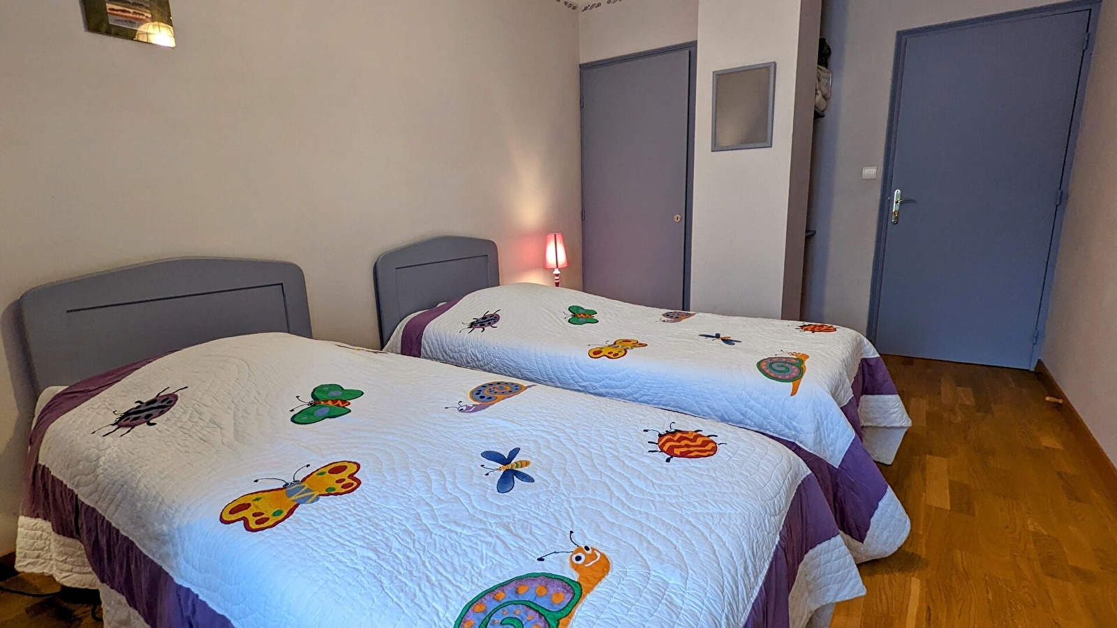 Étage: 4 chambres dont 2 avec poutres apparentes, 2 chambres avec chacune 1 lit en 140 et 2 chambres avec chacune 2 lits en 90. 2 salles d'eau. Wc. Terrasse et cour close. Jardin dans parc commun de 1 ha en bord de ruisseau. Parking fermé. Local de rangement. Calme assuré. Accès depuis le parc de la propriété à des sentiers balisés.