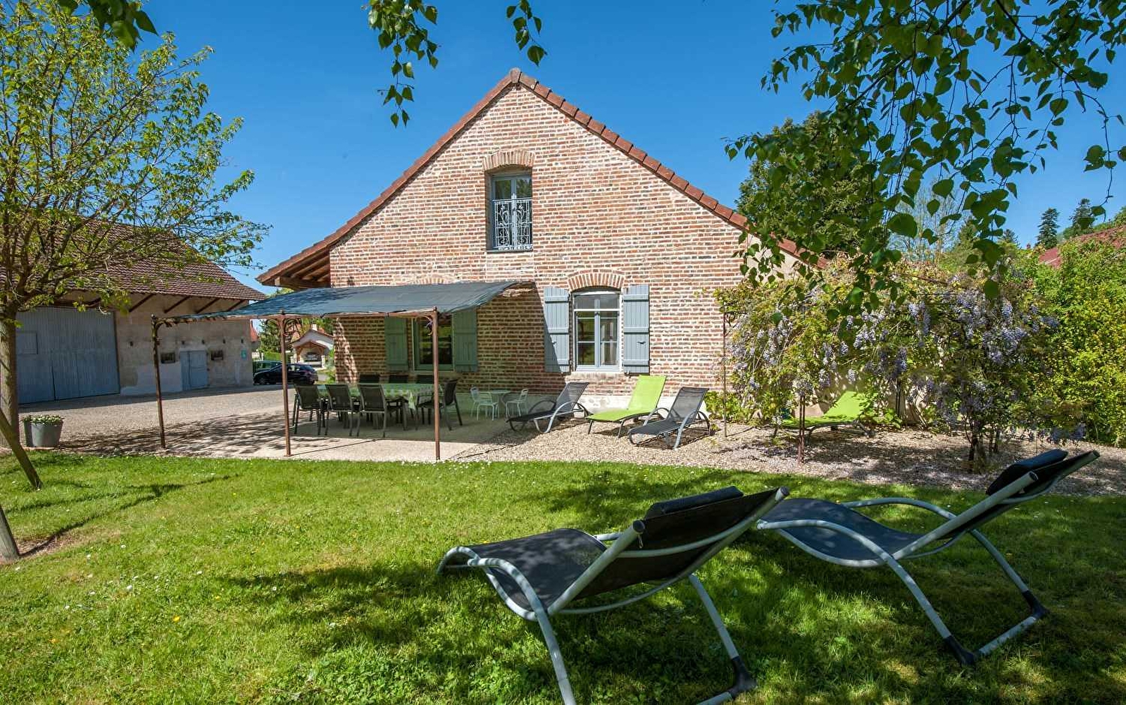 Ravissante demeure bressane datant de 1899 - à l'élégante architecture traditionnelle en briques de pays - nichée au calme en lisière d'une petite prairie accueillant les chevaux du centre équestre de la petite fille de la propriétaire, au sein d'un paisible quartier résidentiel du centre-bourg, à deux pas de la douce campagne environnante. Blotti au creux de la verdoyante vallée du Doubs sur les premiers contreforts montagneux du massif du Jura, Pierre-de-Bresse dispose d'un apaisant cadre champêtre entre pleine nature & champs de cultures, alternant plaines bocagères, prairies, nombreux étangs & rivières et vastes forêts sauvages, abrite le très réputé "Écomusée de la Bresse" (aménagé dans un somptueux château du XVIIe classé MH), dispose de nombreux commerces & services, et propose un très bon niveau d'équipements sportifs & de loisirs (plan d'eau de pêche avec base de loisirs écologique classé en "Zone Natura 2000" pour la richesse de sa faune & flore / parcours sportif & "Parkrun" dans le superbe parc du château / "Agorespace" : terrain de jeux polyvalent pour petits & grands etc…). Spacieux gîte de très bon confort. Grande pièce de vie. Chaleureux cachet campagnard "contemporain" sublimé par la conservation des riches traces du bâti originel (briques & poutraisons d'époque). Beaucoup de charme & de caractère. Ambiance douillette & cosy. Large espace terrasse en partie abrité (ouvert sur la pâture voisine). Agréable jardinet aménagé avec balançoire & terrain de pétanque. A disposition en bonus : salle de jeux couverte avec ping-pong & baby-foot (dans dépendance voisine).