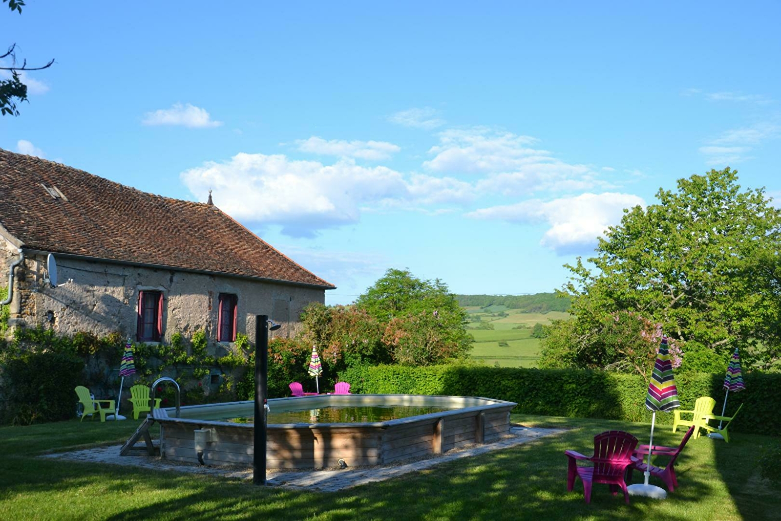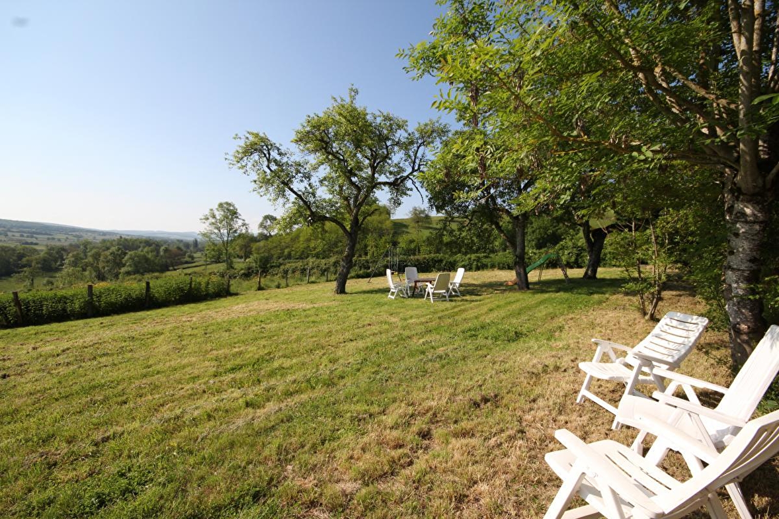 Authentique ferme bourguignonne de caractère du 16ème siècle restaurée, sise sur une vaste propriété naturelle privée de 1.5 ha (accueillant un second gîte) au sein d'un paisible petit hameau rural blotti à flanc de coteau exposé dominant la bucolique vallée verdoyante du Guye & sa rivière poissonneuse. Au creux d'un splendide cadre champêtre & naturel préservé - enchanteur & reposant - en lisière de prairies et d'une vaste forêt (sentier pédestre sur place), avec comme immédiates voisines les célèbres charollaises paissant tranquillement. A 2.5 km du pittoresque village chargé d'histoire de Sigy-le-Chatel (ruines d'un château médiéval du XIIème, maisons à pigeonniers et galeries, église romane du XIIème, moulin du XIVème…), lové au pied du site naturel du plateau de la Roche (belvédère unique sur les vallées de la Grosne & de la Guye offrant une vue panoramique littéralement exceptionnelle s'étendant de la plaine de la Saône jusqu'aux Alpes). Gîte de bon confort. Chaleureux cachet campagnard d'esprit « vintage » & « brocante ». Ambiance totalement dépaysante d'une ancienne demeure (poutres, manteaux de cheminées, tommettes d'origine…). Terrasse en gravier exposée & ombragée (complétée par une large terrasse abritée sous un ancien appentis). Vaste jardin clos privatif arboré de 2000m², en partie ombragé avec balançoire & agréable espace détente, jouxtant un espace commun doté d'une belle piscine chauffée semi-enterrée (8x3m) avec douche (ouverte du 1er mai au 30 septembre). Somptueux panorama sur la campagne environnante à quasi 360°. Superbes paysages.