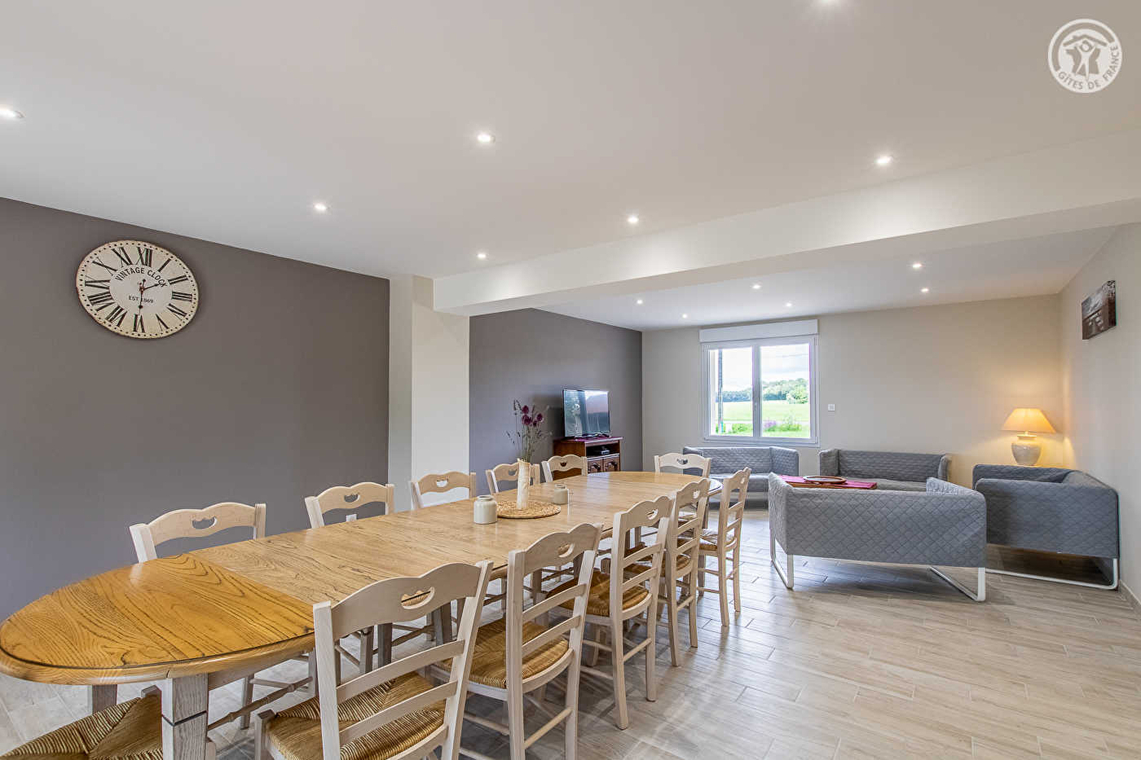 Françoise & Dominique vous ouvrent les portes d'une ancienne ferme de pays du 19ème siècle intégralement restaurée & revisitée en très confortable villégiature contemporaine (accessible aux personnes à mobilité réduite / PMR), sise en pleine campagne bressanne au sein d'un petit hameau rural résidentiel. Apaisant environnement champêtre préservé, blotti en lisière de vastes champs & prairies à deux pas de belles forêts sauvages & préservées (parsemées de sentiers pédestres) et de nombreux étangs & rivières poissonneux. Gîte de très bon confort. Ultra spacieux. Grande pièce de vie. Chaleureux cachet campagnard aux accents résolument contemporain. Douce sobriété dans une reposante ambiance zen. Vaste terrasse abritée ouverte sur un agréable intimiste jardin clos de 8500m², engazonné & arboré, niché à l'abri des regards, parfaite aire de jeux pour les enfants, en partie aménagé dans un esprit « nature » - flanqué de mini bosquets - idéal pour des parties de « cache-cache » entre petits & grands ! Large cour en gravier, littéral terrain de pétanque naturel. Apaisante vue dégagée sur la verdoyante & bucolique campagne environnante.