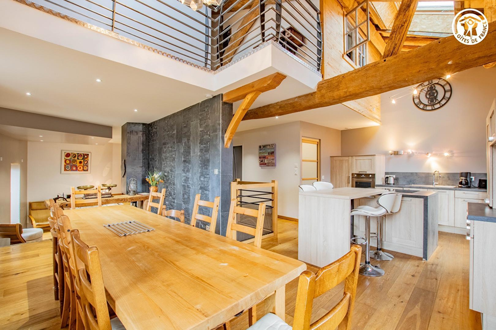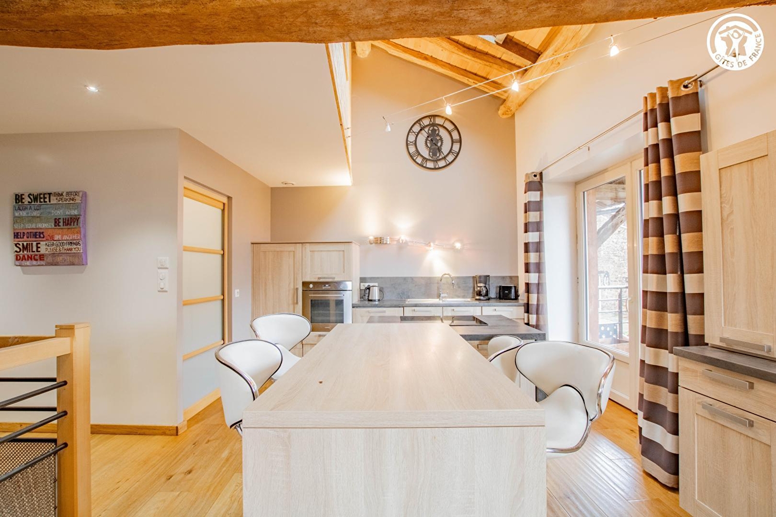 Charmante authentique ferme traditionnelle de caractère du XIXe soigneusement restaurée, blottie au calme au cœur d'un pittoresque hameau rural, perché en "balcon" à flanc de coteau sud-est exposé. Totale tranquillité en pleine campagne matourine vallonnée, au creux d'un bucolique écrin préservé de prairies bocagères, à l'orée d'une forêt sauvage, sur les premiers contreforts de la douce montagne de Saint-Cyr (belvédère unique offrant une exceptionnelle vue panoramique jusqu'au Mont-Blanc par temps clair !), proche des nombreuses commodités que compte le ravissant bourg de Matour, labellisé "Station Verte de vacances" (label d'écotourisme réputé dédié aux destinations "nature"). Spacieux gîte de grand confort. Vaste pièce de vie au très beau volume. Architecture atypique dans l'esprit d'un "loft à la campagne" (dont chambres "cabane" en "second jour"). Chaleureux cachet campagnard & montagnard aux accents contemporains sublimé par les poutres & charpente d'origine. Ambiance élégante & cossue. Énormément de charme. Cosy & douillet. Balcon-terrasse abrité complété par un agréable jardin clos, engazonné & végétalisé, abritant une balançoire & une terrasse en gravier (avec cuisine d'été à deux pas). Magnifique vue dégagée sur la campagne environnante.