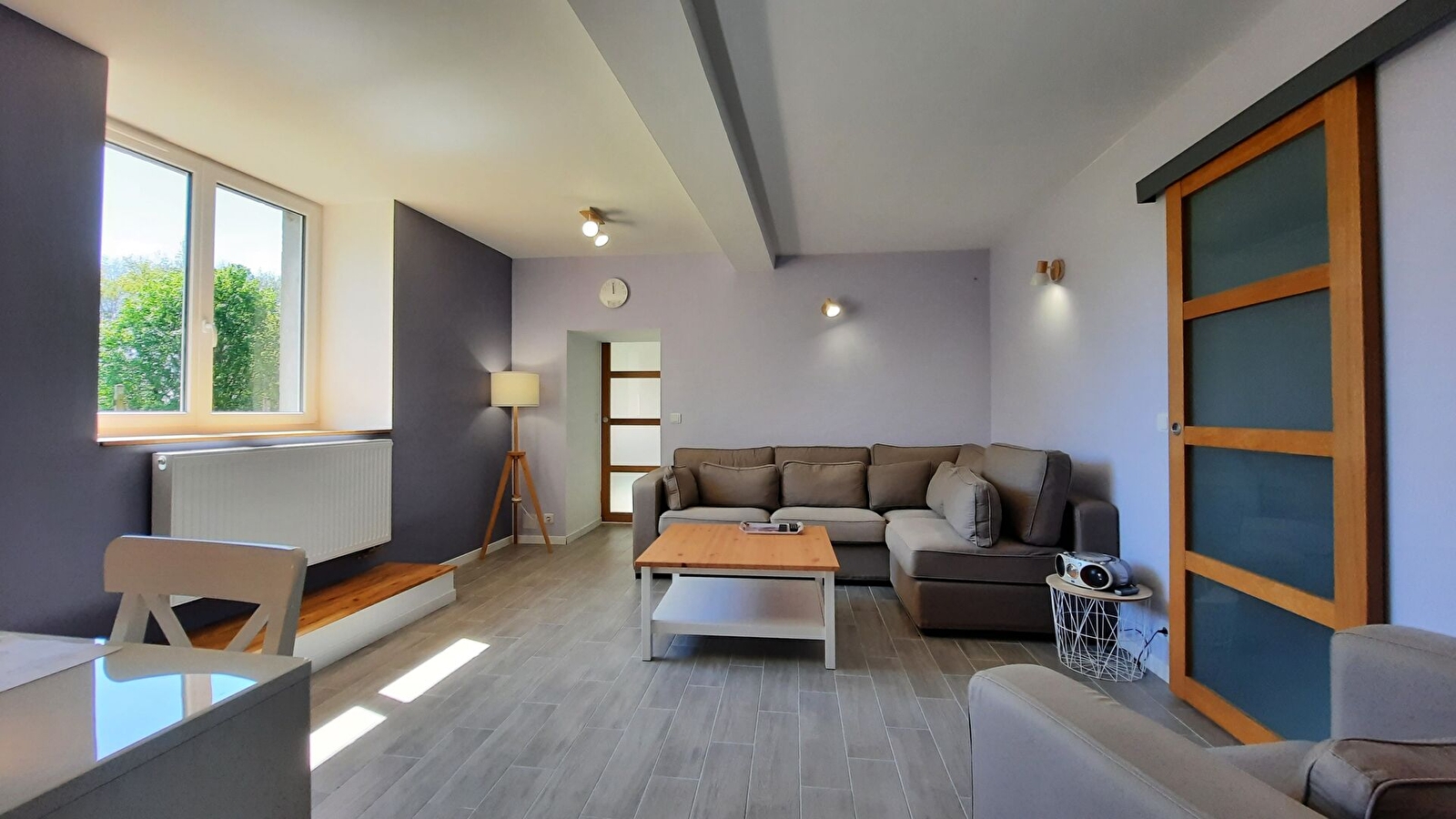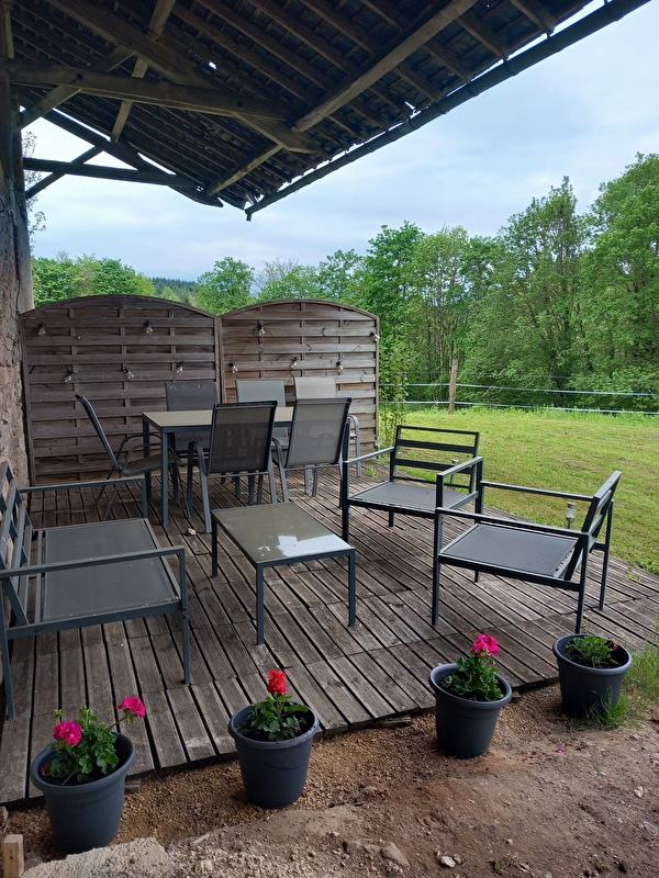 L’extérieur, non clos (en cours d’aménagement) offre une belle vue sur la campagne et offre un accès à la rivière en contrebas de la propriété. Salon de jardin et barbecue en dur.