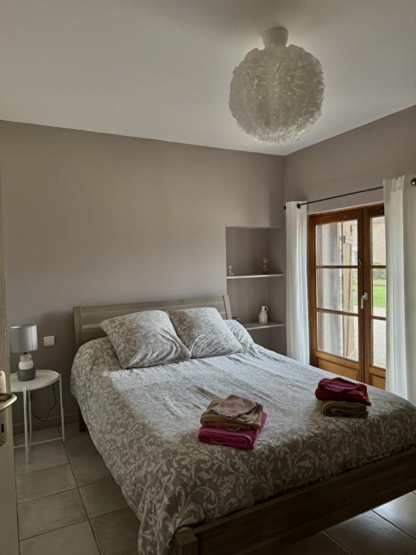Composition : Gîte au rdc d'un bâtiment jouxtant la maison des propriétaires (indépendance totale). Chauffage central (fuel). Séjour-cuisine-salon (avec billard français), 2 chambres (2 lits 1 p. 90x190cm / 1 lit 2 p. 140x190cm), salle d'eau (douche, WC), buanderie. Terrasse et jardin privatifs sur terrain clos commun. Parking privé. Commerces et services 800m. Gare 17 km.