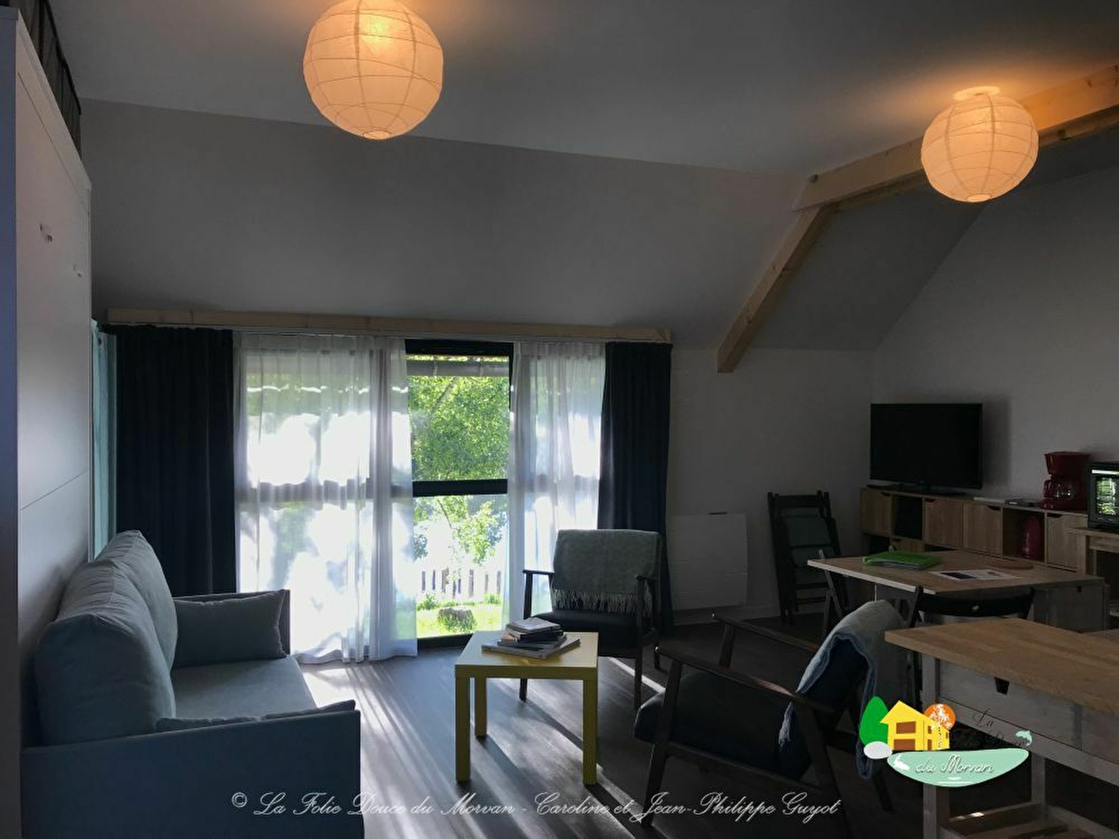 - Un gîte 2 places PMR 26 m2 tout confort, avec un lit double 160 cm facilement escamotable (douche/WC, cuisine équipée, coin salon, TV/DVD, wifi).