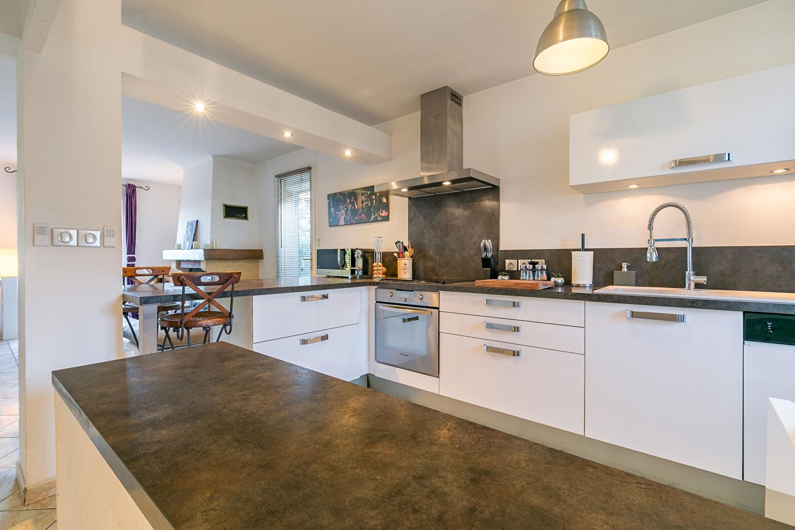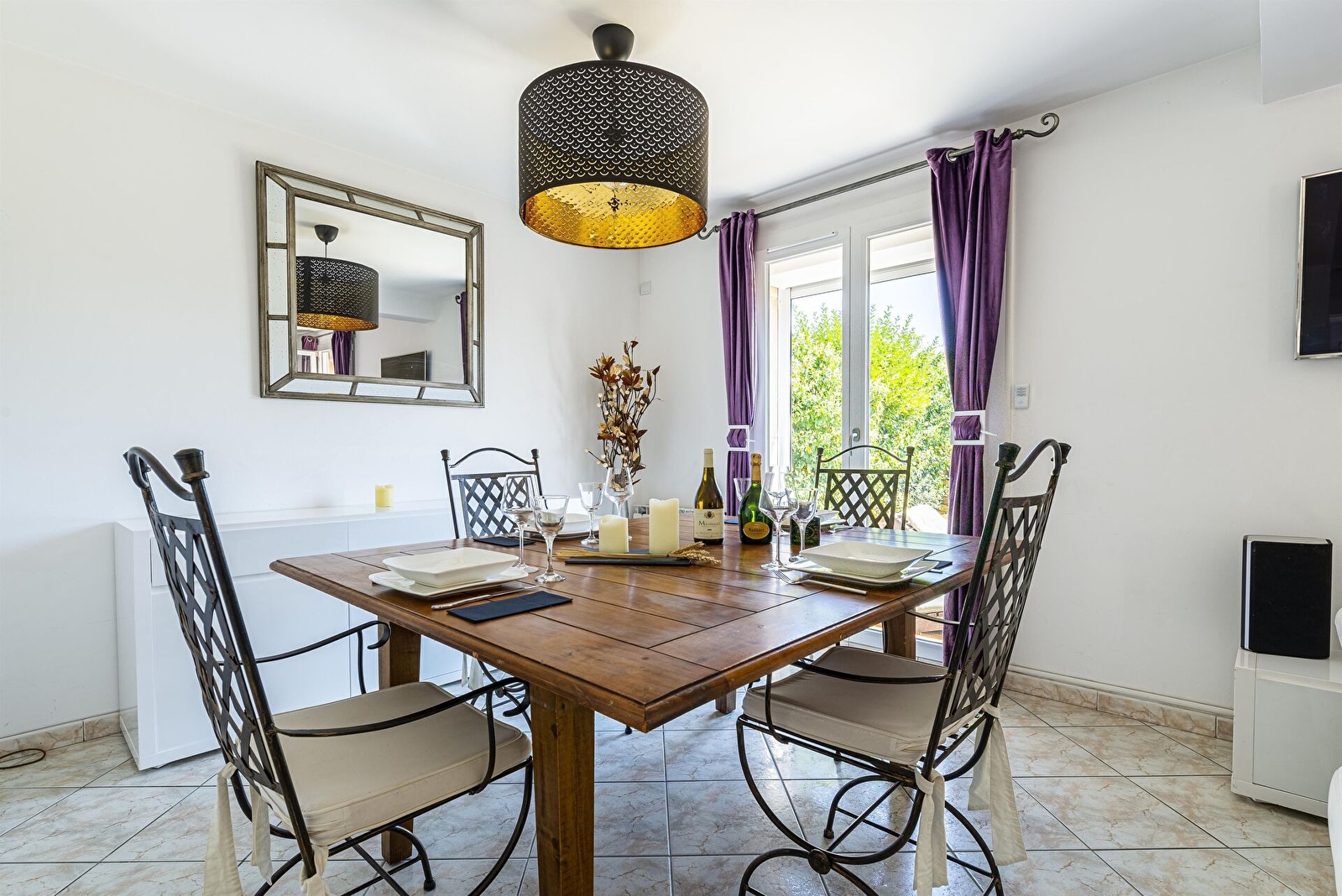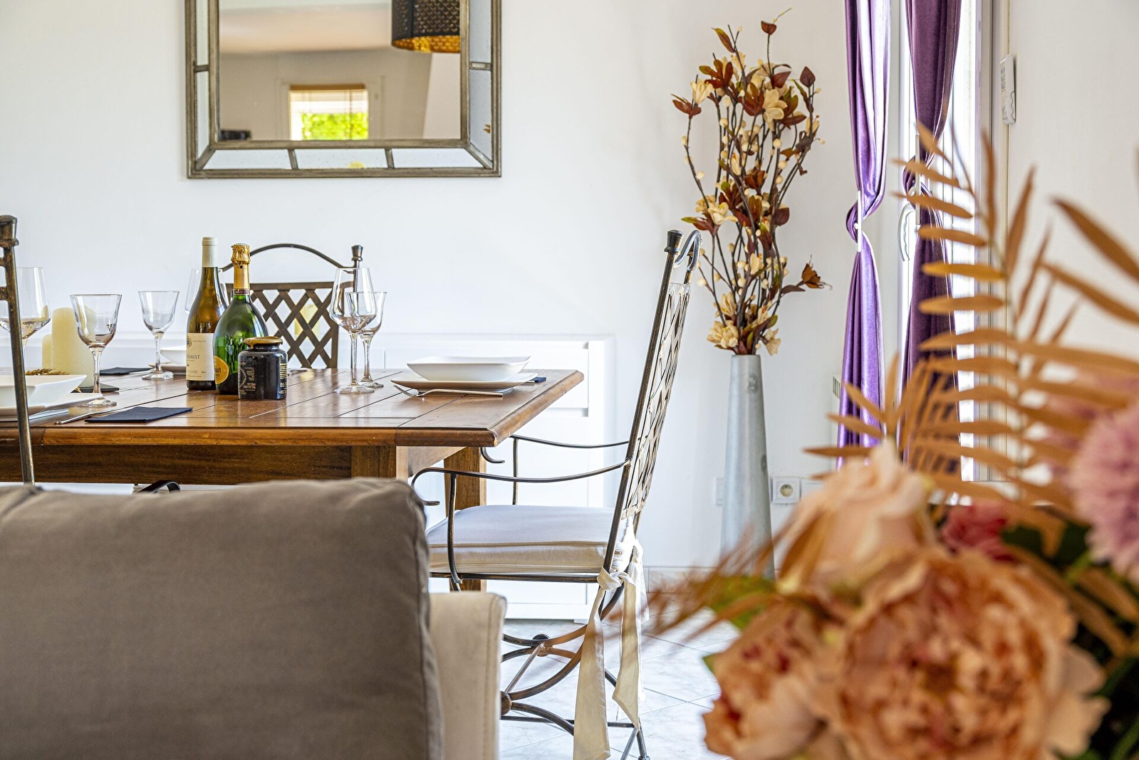 En rez de chaussée, belle pièce à vivre avec cuisine ouverte équipée, coin salle à manger/salon avec TV écran plat avec accès direct sur la terrasse, enceinte BOSE, cheminée . WC indépendants. Climatisation. Buanderie dans le garage avec machine à laver et sèche-linge.