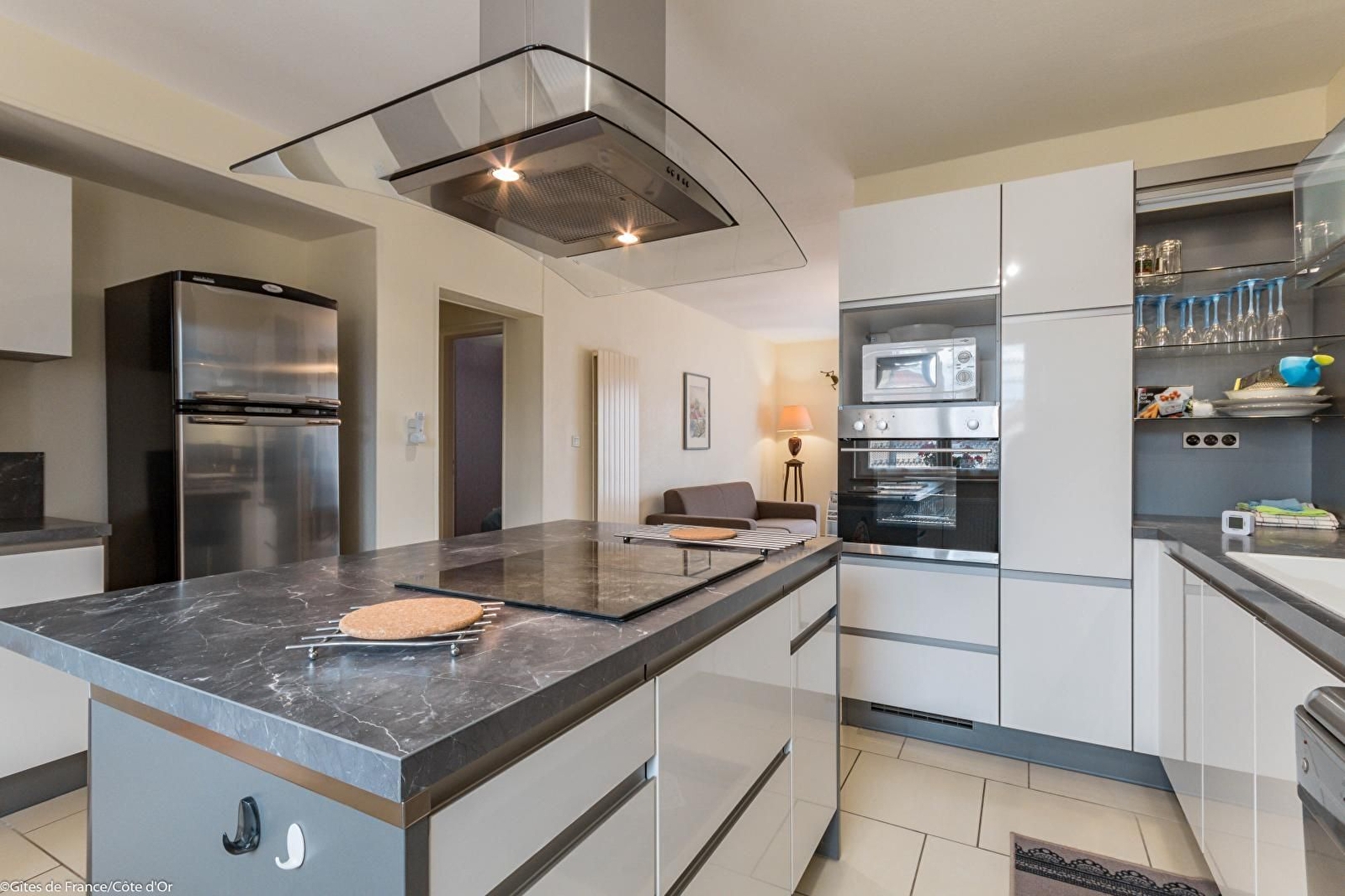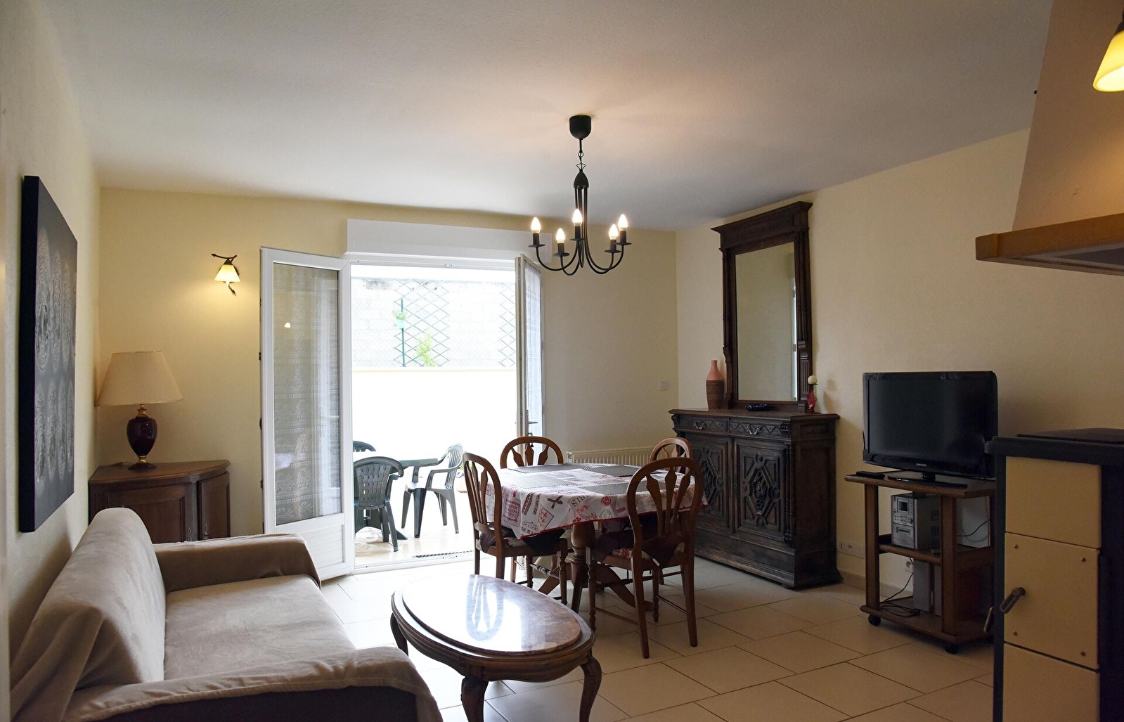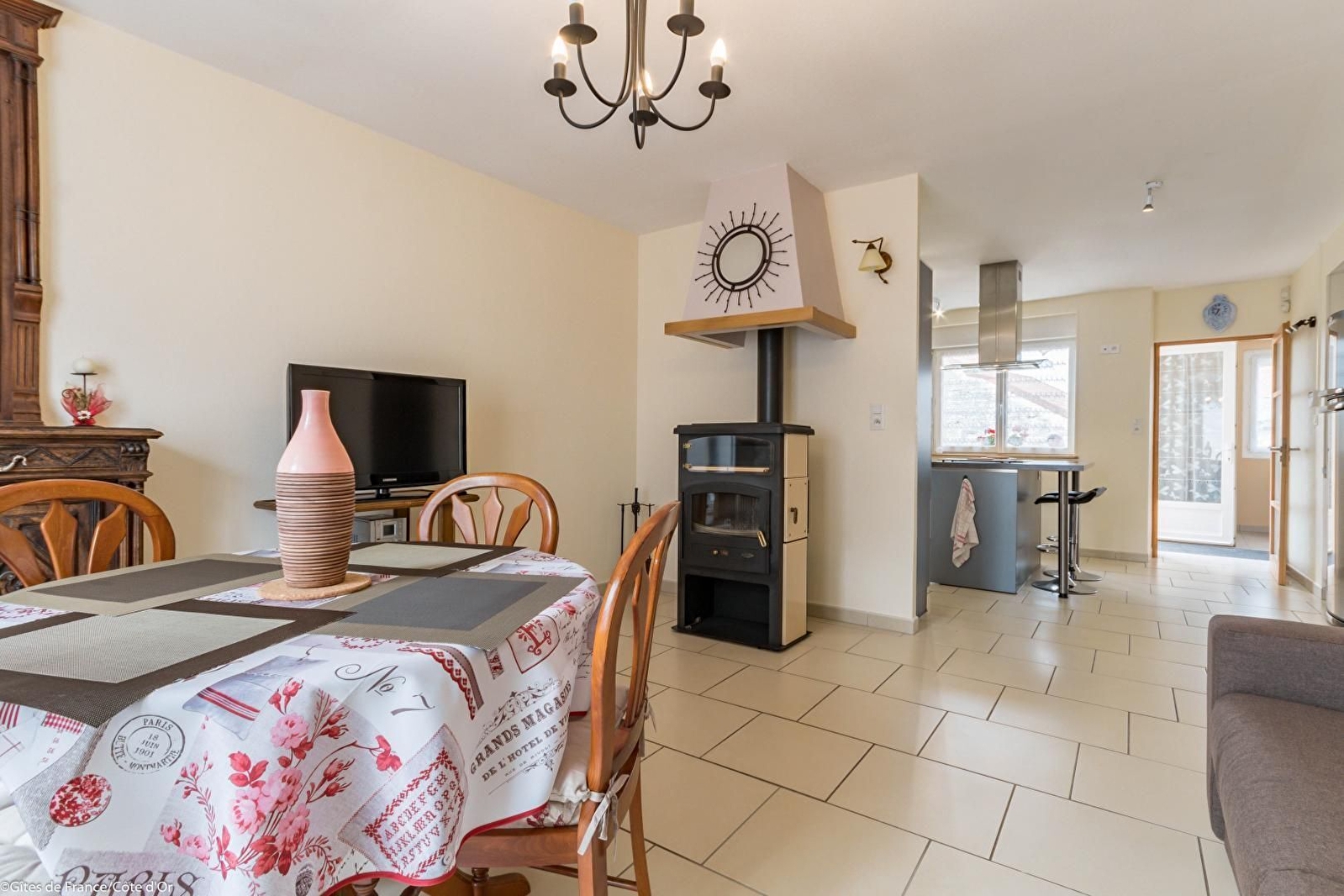 Entrée avec lit gigogne (2 x 80) et bureau, cuisine intégrée avec ilot central, ouverte sur le séjour avec salon (canapé convertible également), salle à manger et poêle à bois d'agrément.
