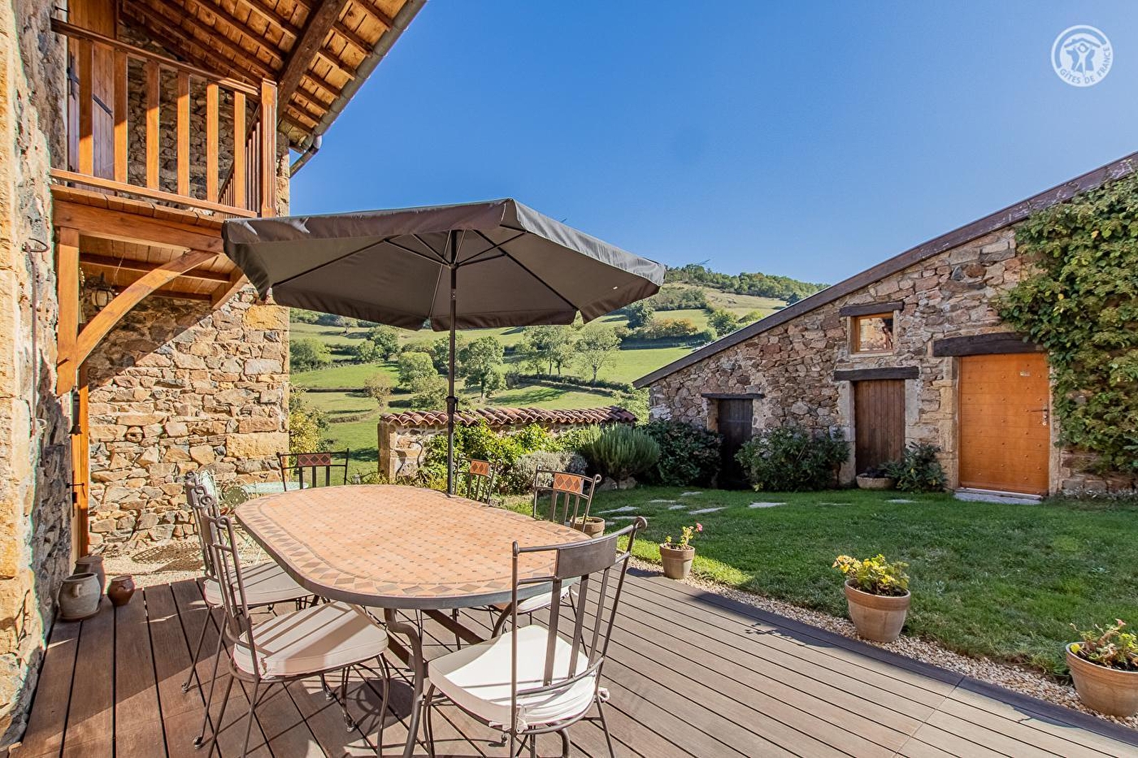 Authentique ravissante ferme typique de caractère de 1870 soigneusement restaurée dans les règles de l'art - dotée d'une "galerie mâconnaise" traditionnelle - sise au calme en bordure d'une ruelle en impasse, surplombant "en balcon", à flanc de colline, un bucolique vallon de bocage lové sous les crêtes boisées d'un vaste massif forestier. Totale tranquillité en pleine campagne clunisoise vallonnée, au sein d'un petit hameau rural, agricole & résidentiel, niché "en belvédère" sur un plateau exposé dominant la verdoyante vallée du Valouzin. Apaisant cadre champêtre & naturel préservé de montagne douce, proche des vignobles. Magnifique panoramas & paysages. Superbe vue dégagée sur la campagne environnante & les monts du Clunisois. Spacieux gîte de très bon confort. Chaleureux cachet campagnard aux accents contemporains sublimé par une restauration patrimoniale soignée (élégant manteau de cheminée en pierre, poutres & charpentes, linteaux & murs en pierres etc… d'origine). Énormément de charme & caractère dans une douce ambiance "maison de famille". Cosy & ultra douillet. Agréable terrasse exposée & ombragée. Vaste jardin abritant un verger fruitier (pommiers, pruniers, poiriers, petits fruits rouges, pêches de vignes / cueillette possible avec accord du propriétaire) jouxtant une pâture accueillant les paisibles vaches charolaises en saisons.