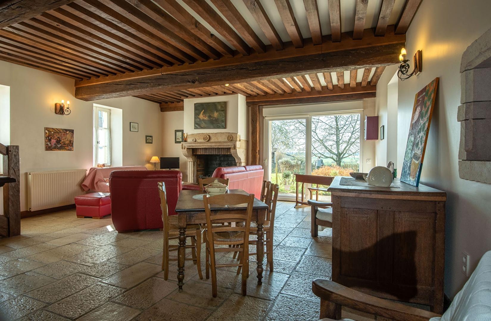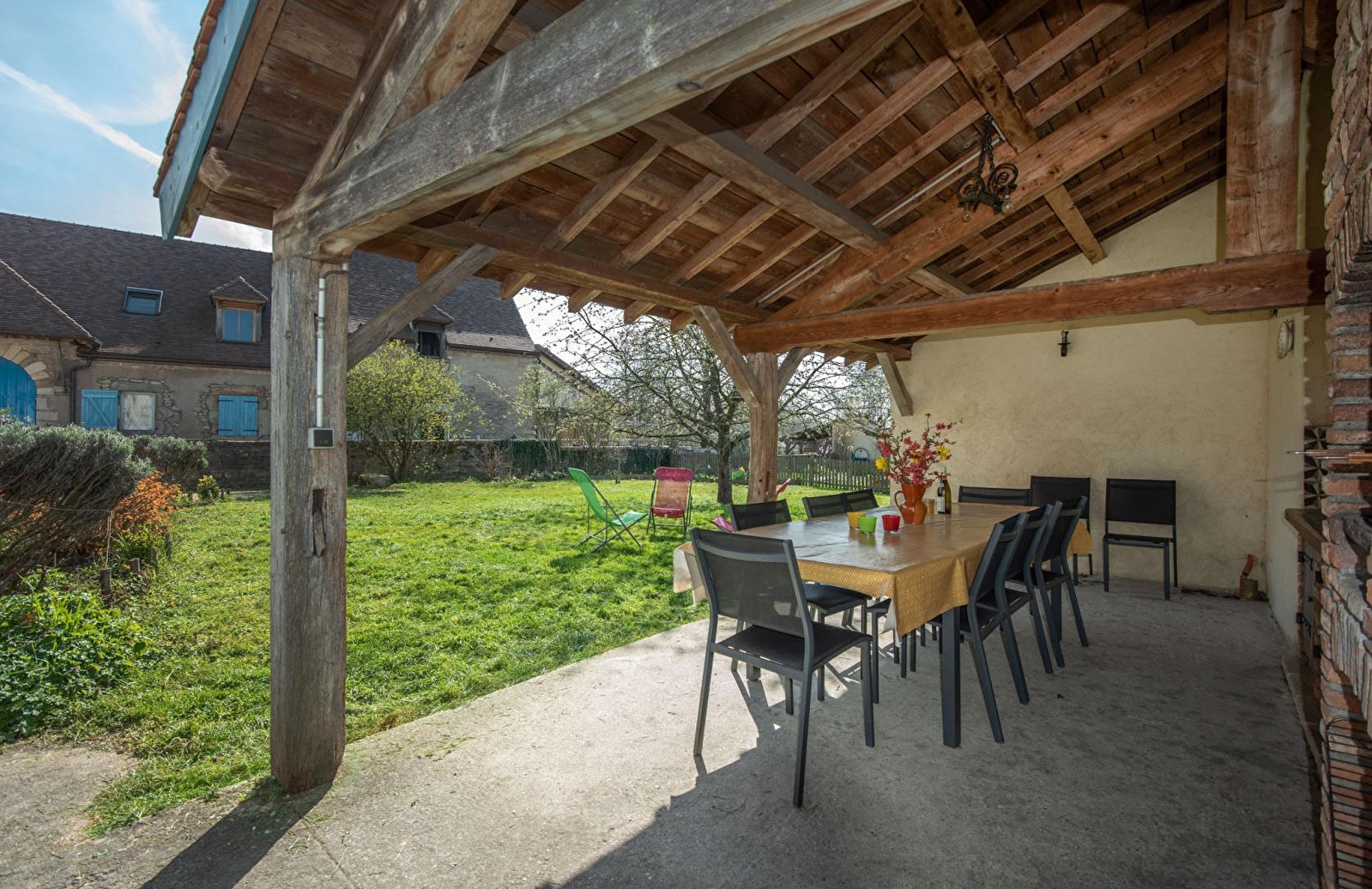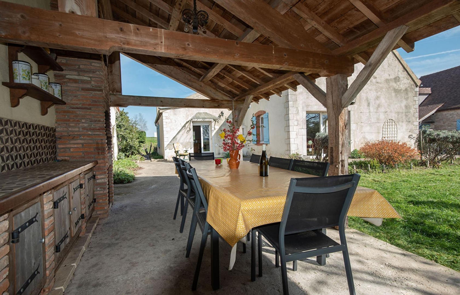 Édouard (apiculteur amateur par passion) & Marie-Christine vous accueillent au sein d’une charmante authentique ferme de pays de la fin XIXe intégralement restaurée, blottie au calme en lisière de ruelle au cœur d’un paisible hameau rural voisinant le pittoresque bourg typique & commerçant de Saint-Loup-Géanges doté d’une élégante église romane du XIIe (nombreux petits commerces & supermarché sur place). Calme & totale tranquillité en pleine campagne, niché sur un "mini" plateau exposé sud dominant un bucolique vallon de champs & prairies traversé par une petite rivière (accessible depuis la propriété), proche de belles forêts sauvages & préservées dont la vaste forêt de Gergy, littéral "poumon vert" du territoire. Vaste propriété écologiquement aménagée dans un esprit "100% nature" (visitable en compagnie du propriétaire), classée "refuge LPO" (vingtaine d’espèces selon les saisons), comprenant un atypique jardin potager "mandala", un poulailler (poules & cannes), des ruches (à l’écart), une insolite "truffière" & un "jardin-forêt" doté d’un petit bassin. Gîte de bon confort. Ultra spacieux Chaleureux cachet campagnard mixé à l’âme douce & dépaysante d’une ancienne demeure. Belle pièce de vie sublimée par un magistral manteau de cheminée en pierres. Large terrasse abritée prolongée par un vaste espace terrasse exposé (avec table de ping-pong), ouvertes sur un agréable jardin clos de 300m² fleuri & arboré.