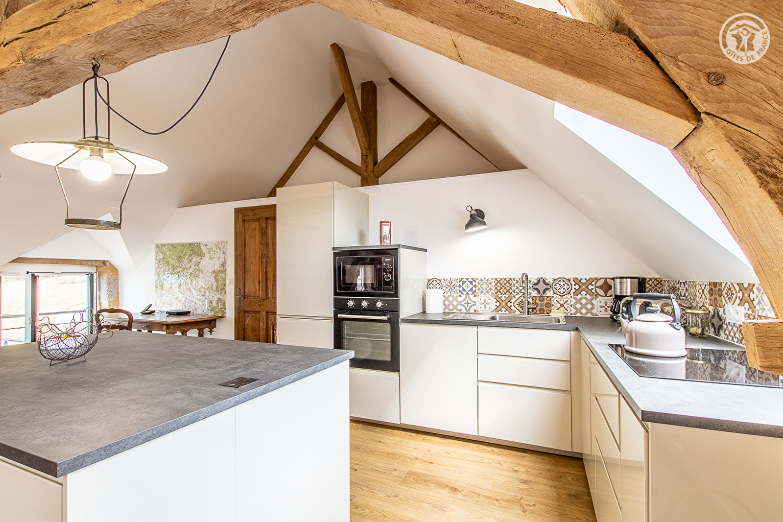 Composition : Maison avec 2 gîtes mitoyens (en verticalité), jouxtant la maison des propriétaires (indépendance totale sans vis-à-vis). Buanderie commune sur place (l-linge + s-linge). Wifi. Chauffage central bois + poêle à bois. Gîte au 1er ét. avec demi-niveau (accès plain-pied depuis parking). Séjour-cuisine-salon, 4 chambres (2 lit 1 p. 80x200cm dans chaque / 2 incluant une mezzanine accessible par échelle de meunier avec 2 lits 1 p. 70x190cm d'appoint), salle d'eau (douche), sde (douche/wc), wc indépendant. Terrasse + jardin + parking privés. Parc + local vélos en commun. Petits commerces 2 km. A noter : gîte situé en zone blanche.
