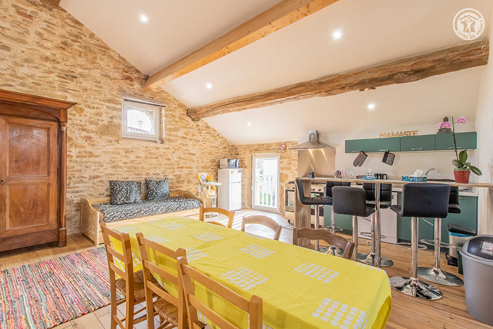 Fabienne, professeur de yoga (séances personnalisées sur place possibles sur demande) & Stéphane (passionné de sports & "fitness"), vous ouvrent les portes d'une authentique dépendance viticole & agricole du XIXe blottie en lisière d'une petite vigne, au cœur d'un bourg viticole typique de la campagne mâconnaise (abritant une église romane classée du XIIe). Niché au pied de la célèbre Roche de Solutré labellisée "Grand Site de France" pour ses exceptionnelles richesses patrimoniales & paysagères (l'un des plus grands gisements préhistoriques d'Europe riche de 50 000 ans de présence humaine, offrant une superbe vue dégagée jusqu'au Mont-Blanc !), Davayé dispose d'un cadre viticole vallonné, immergé au cœur d'un immense plateau préservé de vignobles, proche de plusieurs massifs forestiers sauvages. Somptueux paysages & panoramas à découvrir aux alentours. Vaste atypique "loft à la campagne" lové sous les toits à l'endroit de l'ancienne grange. Très beau volume. Chaleureux cachet campagnard aux accents contemporain sublimé par une restauration patrimoniale soignée (conservation des riches traces du bâti d'origine : murs en pierres, linteaux en pierres & bois, poutres, originales fenêtres en "œil de bœufs" parées de briques…). Beaucoup de charme & caractère. Ambiance cosy & cocooning. Insolite & dépaysant. Agréable & spacieuse "terrasse sur cour" protégée des regards par l'ancien mur d'enceinte de la propriété. Table de ping-pong & pétanque possible côté cour.