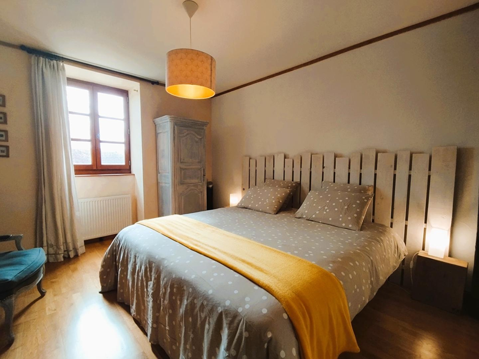 Composition : Gîte en duplex dans la maison des propriétaires comprenant également un second gîte (indépendance totale en mitoyenneté). Wifi. Chauffage central chaudière à pellets + poêle à bois (bois fourni gratuitement avec limitation). Buanderie commune aux 2 gîtes comprenant lave-linge + sèche-linge. Rez-de-chaussée : séjour-cuisine-salon, wc indépendant. 1er étage : 4 chambres dont 2 en enfilade, assimilables à une grande chambre « familiale » divisée en 2 espaces indépendants (lit 2 p. 160x200cm / 2 lits 1 p. 90x200cm jumelables en lit 2 p. de 180x200cm / lit 2 p. 160x200cm / lit 1 p. de 80x190cm), 2 salles d'eau situées dans 2 chambres (douche + wc dans chacune). Terrasse privée. Jardin commun avec espace réservé. Parking privé. Local vélos commun. Commerces & services 7 km. Gare TGV Creusot 16 km. Golf 28 km. Location du gîte en dehors des périodes de vacances scolaires sur demande.