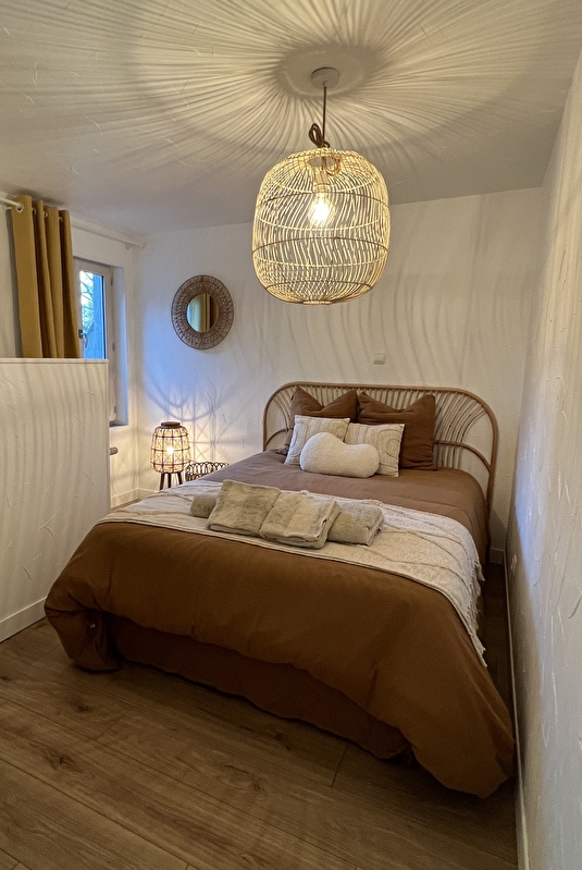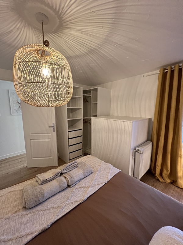 Au rez-de-chaussée, vous profiterez d'une pièce de vie ouverte comprenant cuisine équipée, coin repas et salon (canapé convertible en lit de 160cm). Accès direct à l'extérieur avec coin détente à l'ombre d'un arbre et parterre paysagé. Le premier pallier est composé d'une salle d'eau avec douche et W.C. séparés. A l'étage, deux belles chambres (une avec lit de 140cm et l'autre avec lit de 160cm) avec chacune leur dressing.
