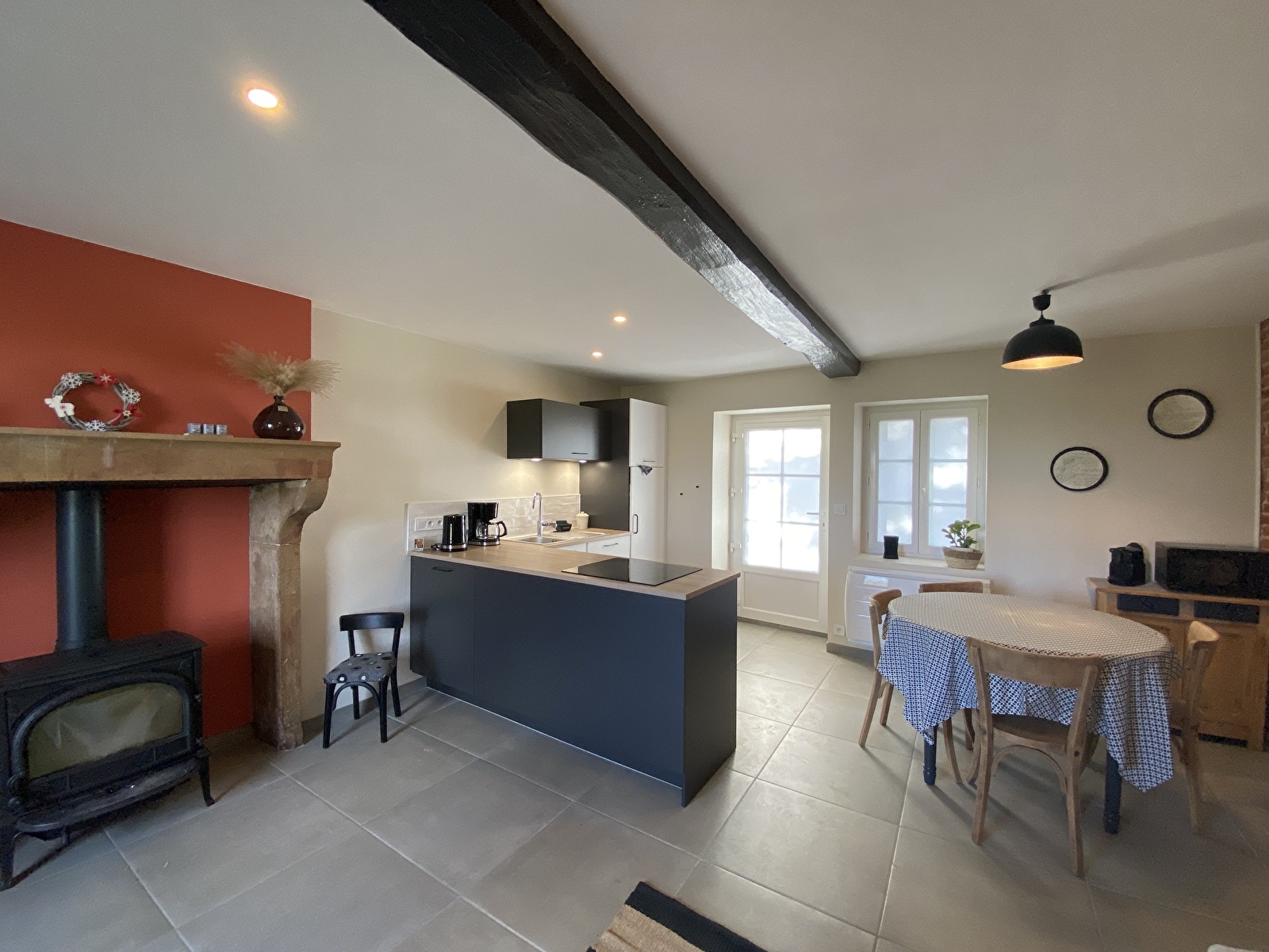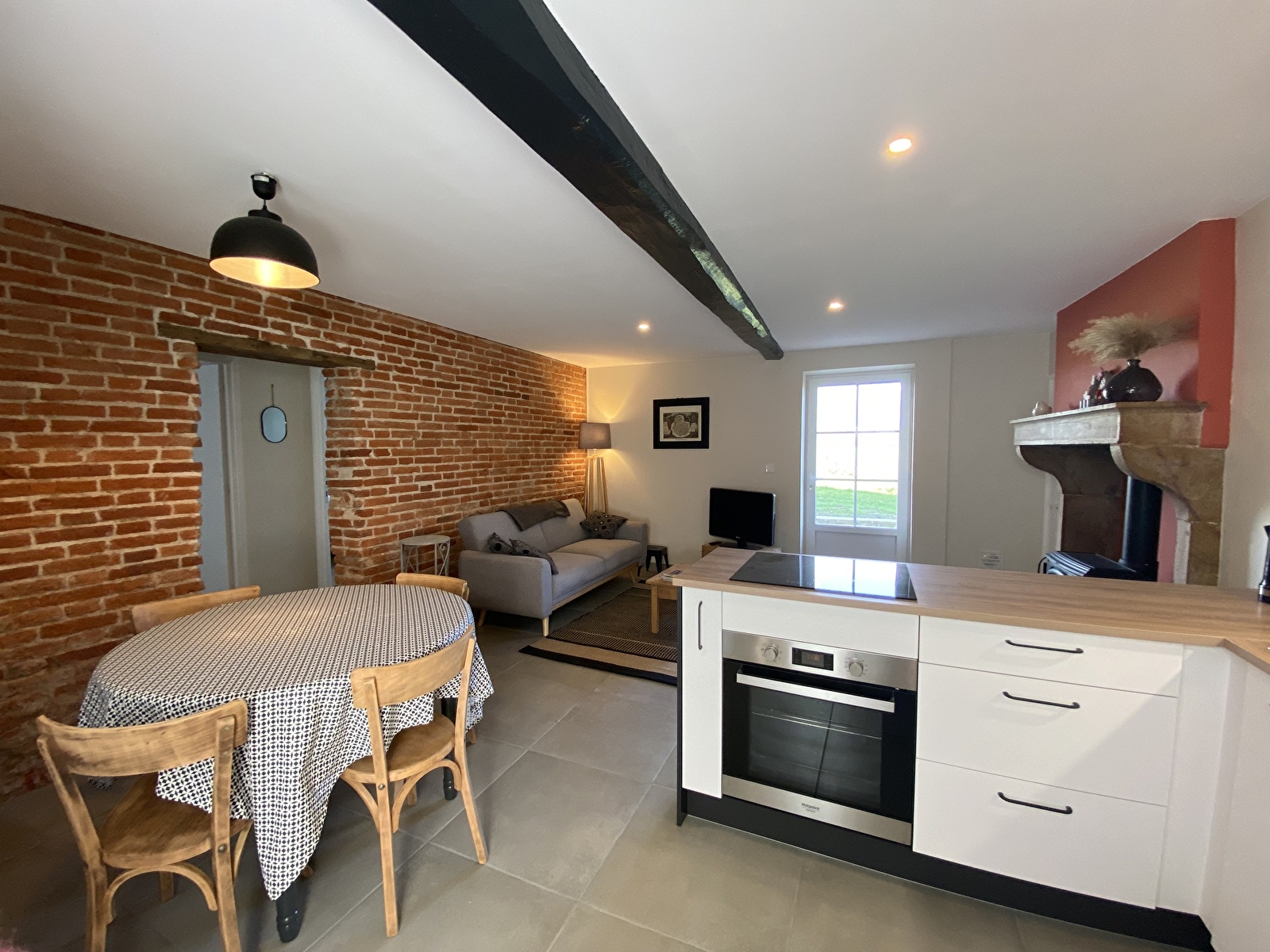 Notre gite possède une pièce de vie avec un poêle à bois et une magnifique vue sur la campagne environnante et une cuisine équipée ouverte sur le salon.