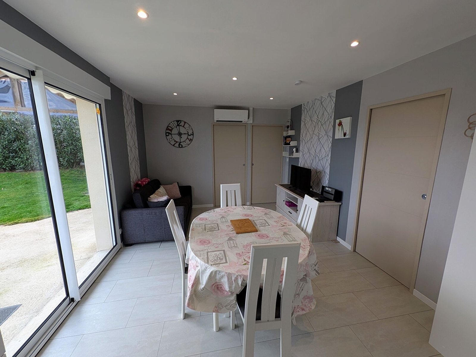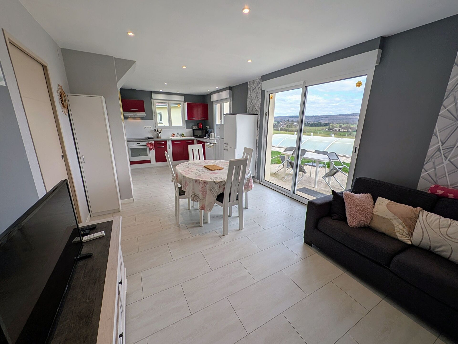 L’ensemble s’ouvre directement sur la terrasse et l’extérieur, offrant une vue dégagée sur la campagne environnante. Le gîte est également équipé de la climatisation pour des séjours agréables en toute saison.