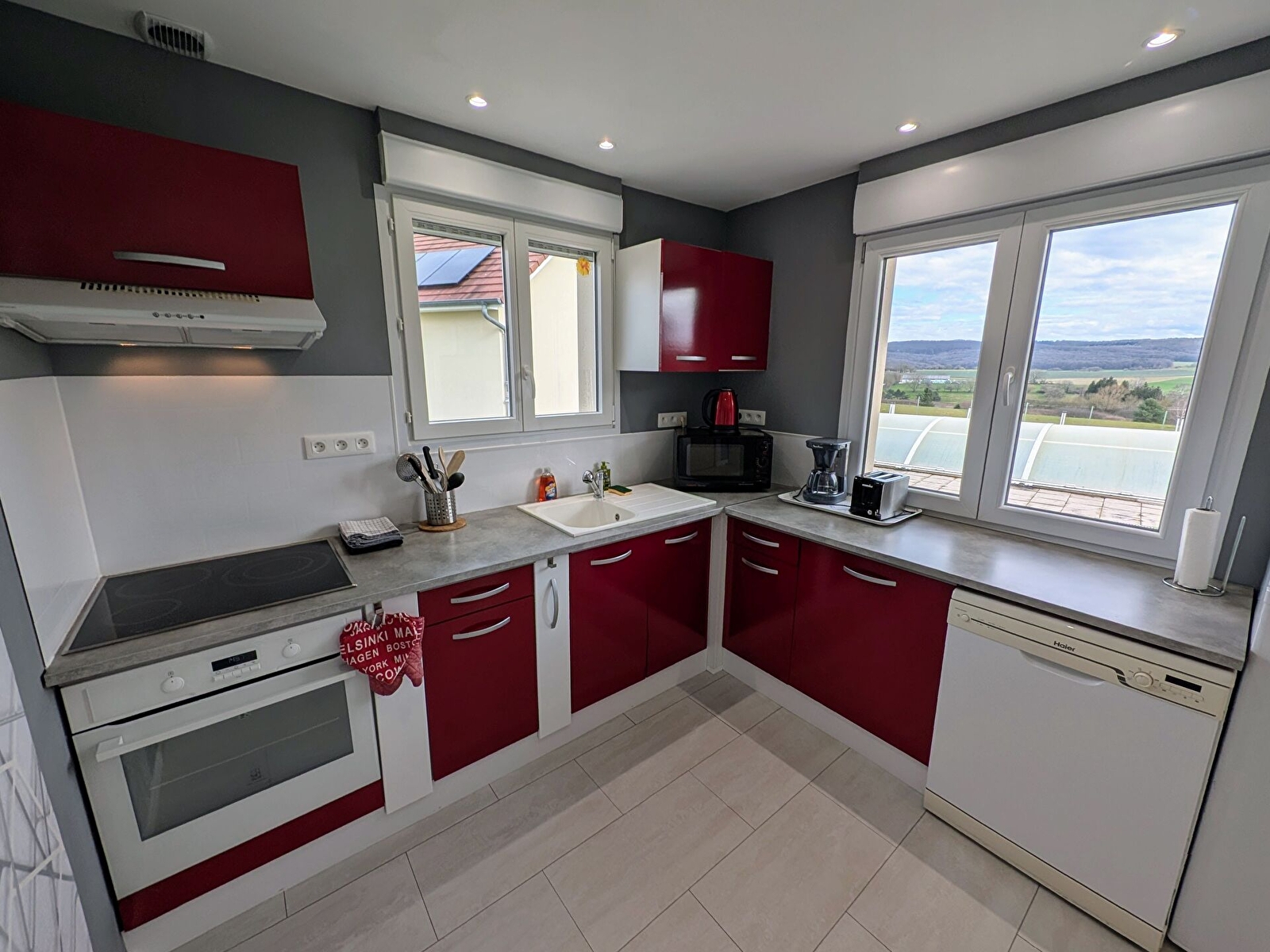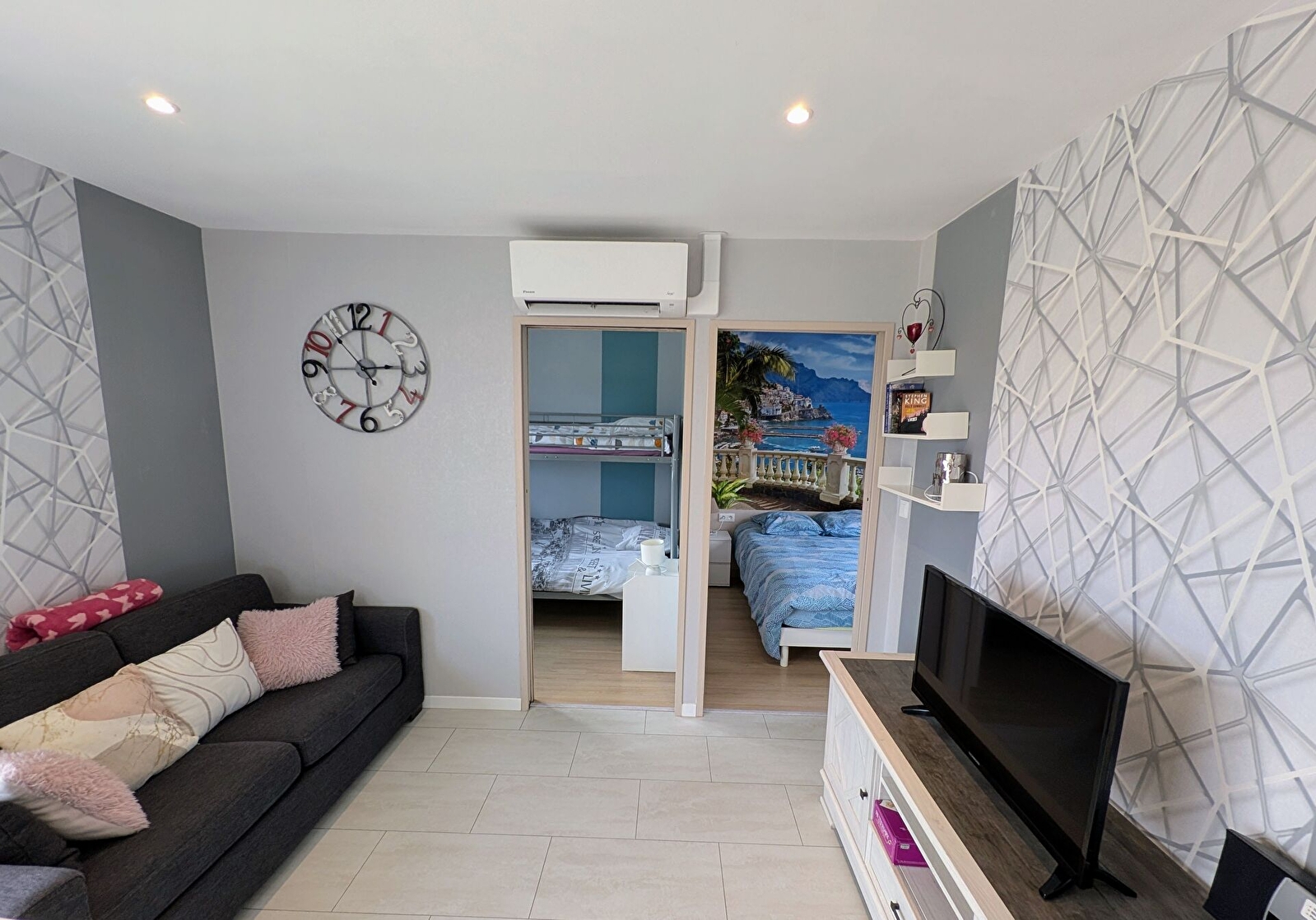 La pièce de vie se compose d’une cuisine toute équipée, ouverte sur le séjour avec un coin salon convivial comprenant un canapé et une télévision (Netflix disponible sur demande). Des jeux de société ainsi que quelques livres sont également à disposition pour partager de bons moments en famille ou se détendre au calme.