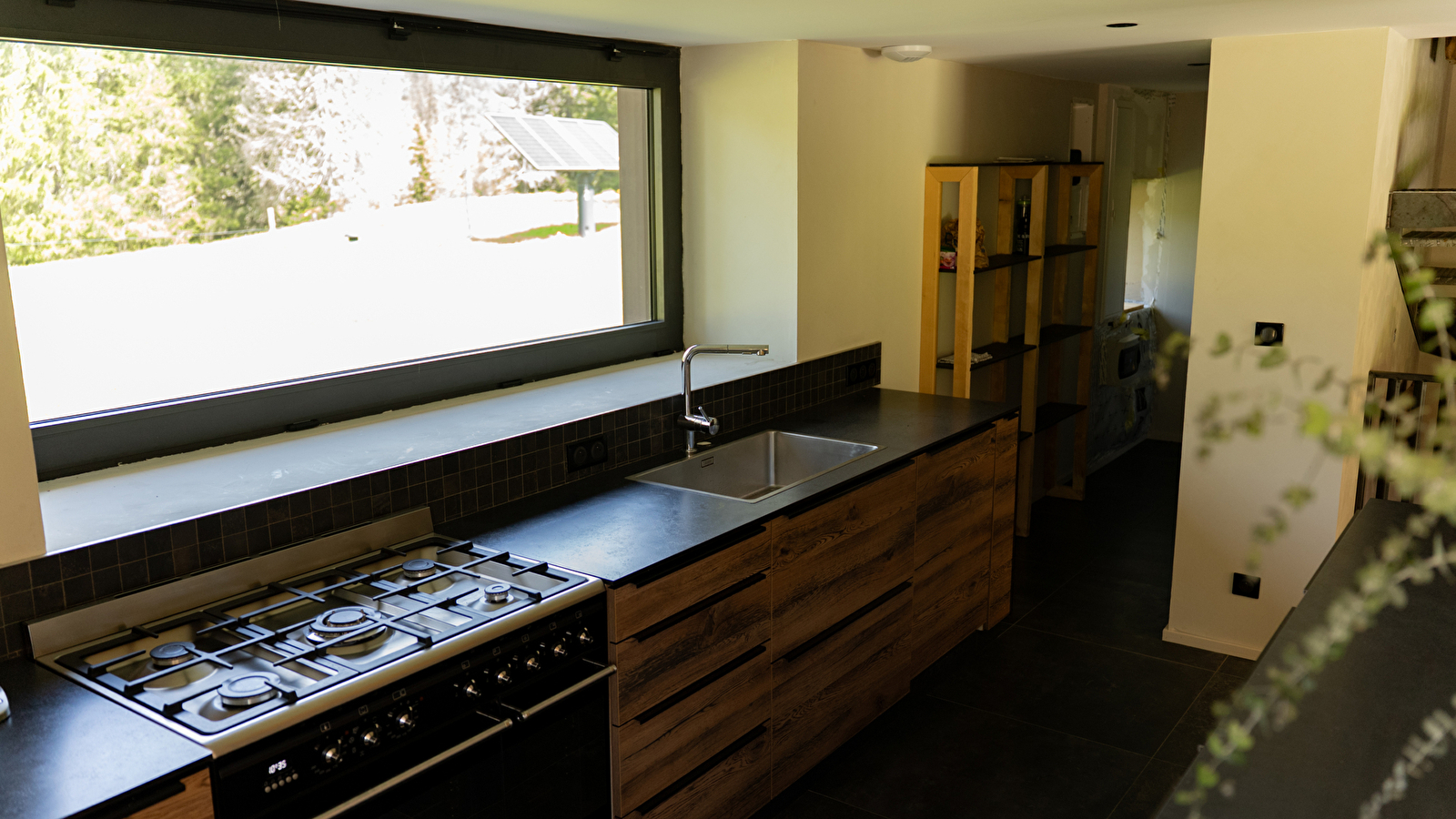 Cette maison de 175m2 est composé d'une grande pièce à vivre avec avec coin repas et salon et d'une grande cuisine équipée donnant sur une grande terrasse face à la nature.