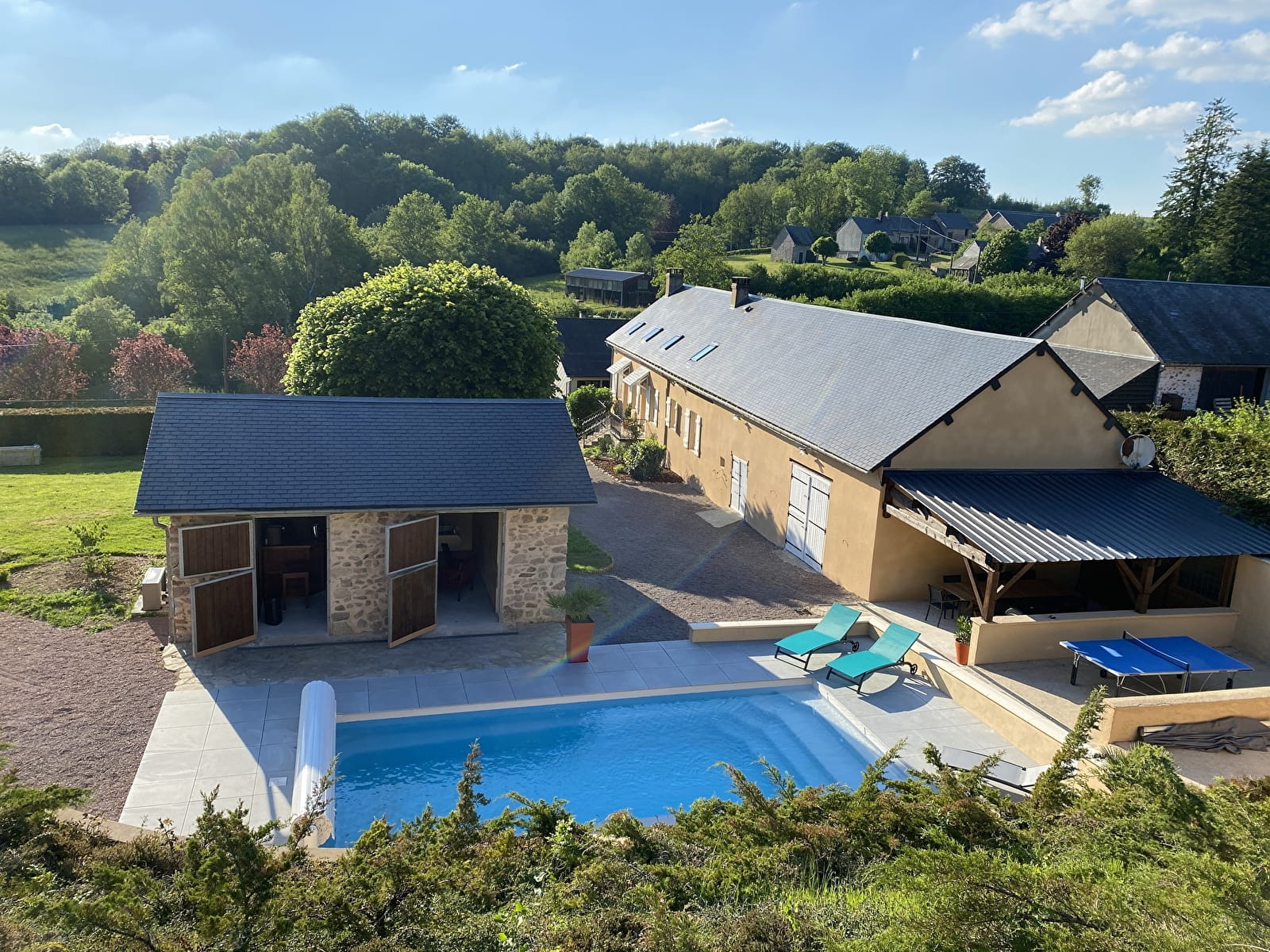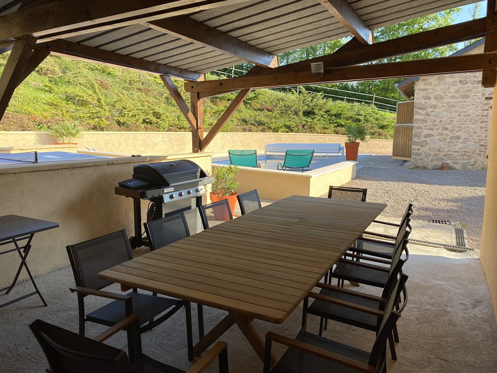 A l'extérieur se trouvent un jardin clos face à la maison, une première terrasse couverte avec table de jardin et barbecue, puis une deuxième terrasse avec salon de jardin. Une dépendance accueille un bar équipé et babyfoot professionnel, et donne sur la piscine chauffée de 8,50m (équipée d'un rideau électrique). Possibilité table de ping-pong et transats.