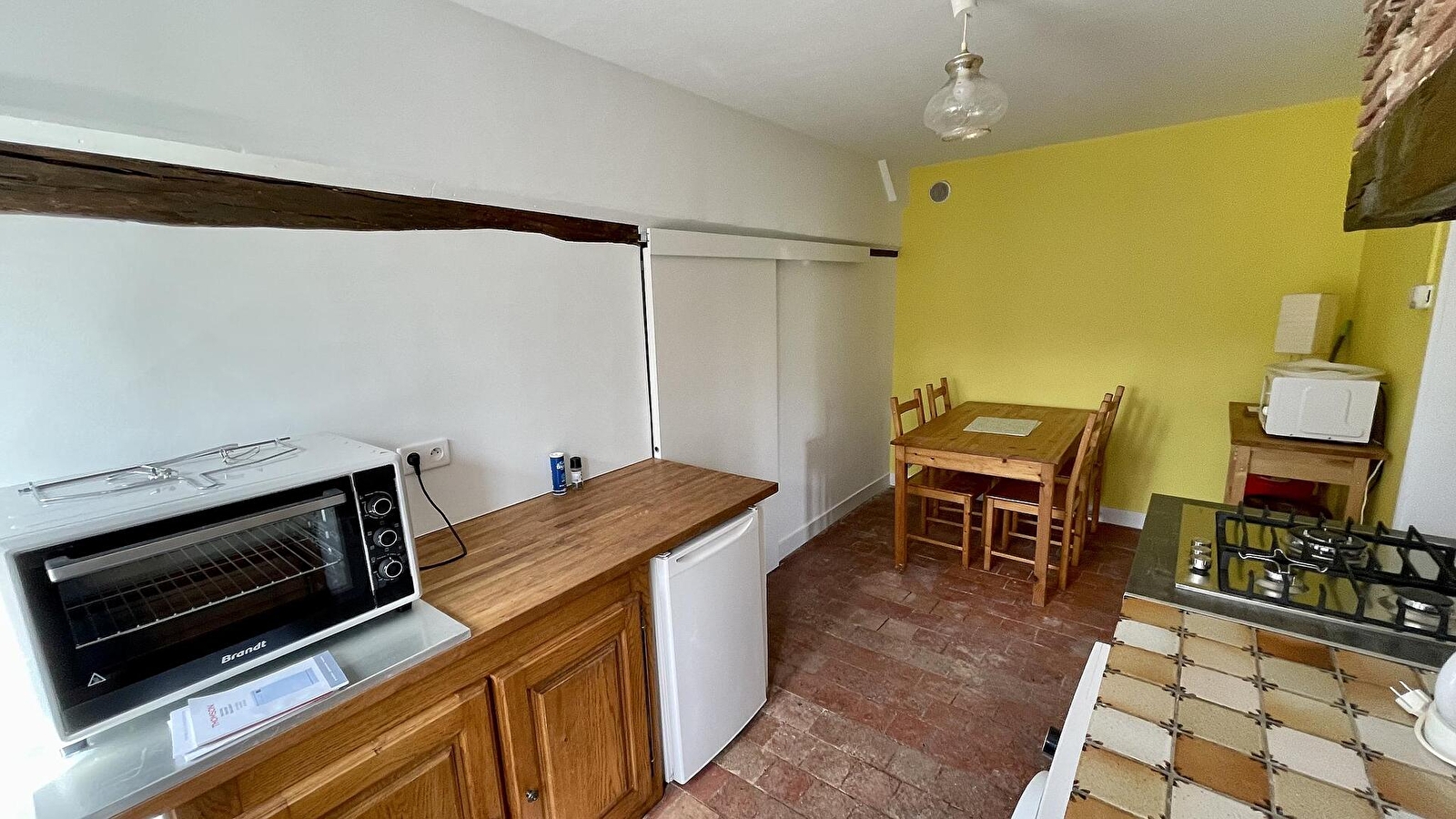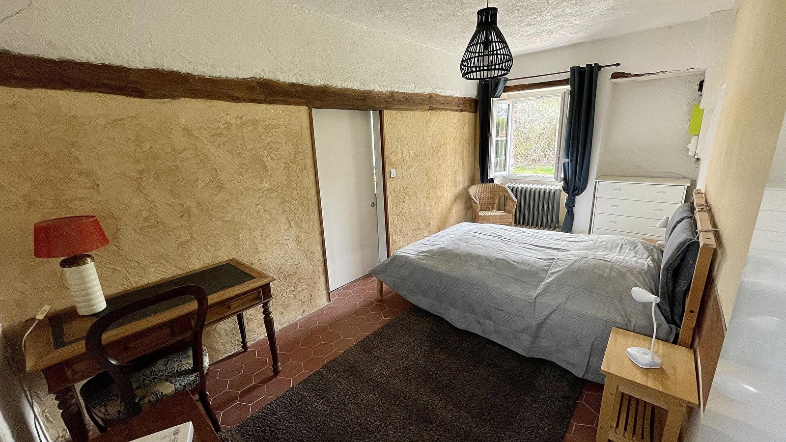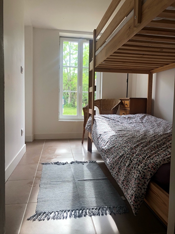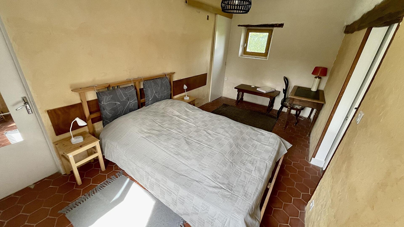 La maison se présente ainsi : vous entrez dans la pièce à vivre, spacieuse avec des poutres et une cheminée avec un insert. Une cuisine salle à manger lumineuse avec un beau plan de travail en bois d'un côte et de l'autre un évier et un plan de travail en carrelage de Saint Sauveur. Les fenêtres de la cuisine donnent sur la terrasse, bien agréable pour bavarder en préparant la cuisine ou passer les plats. Les deux chambres suivent ensuite , d'abord celle disposant d'un lit double, elle donne accès à la petite chambre aux lits superposés et à la salle de douche et wc avec portes coulissantes pour gagner de la place.