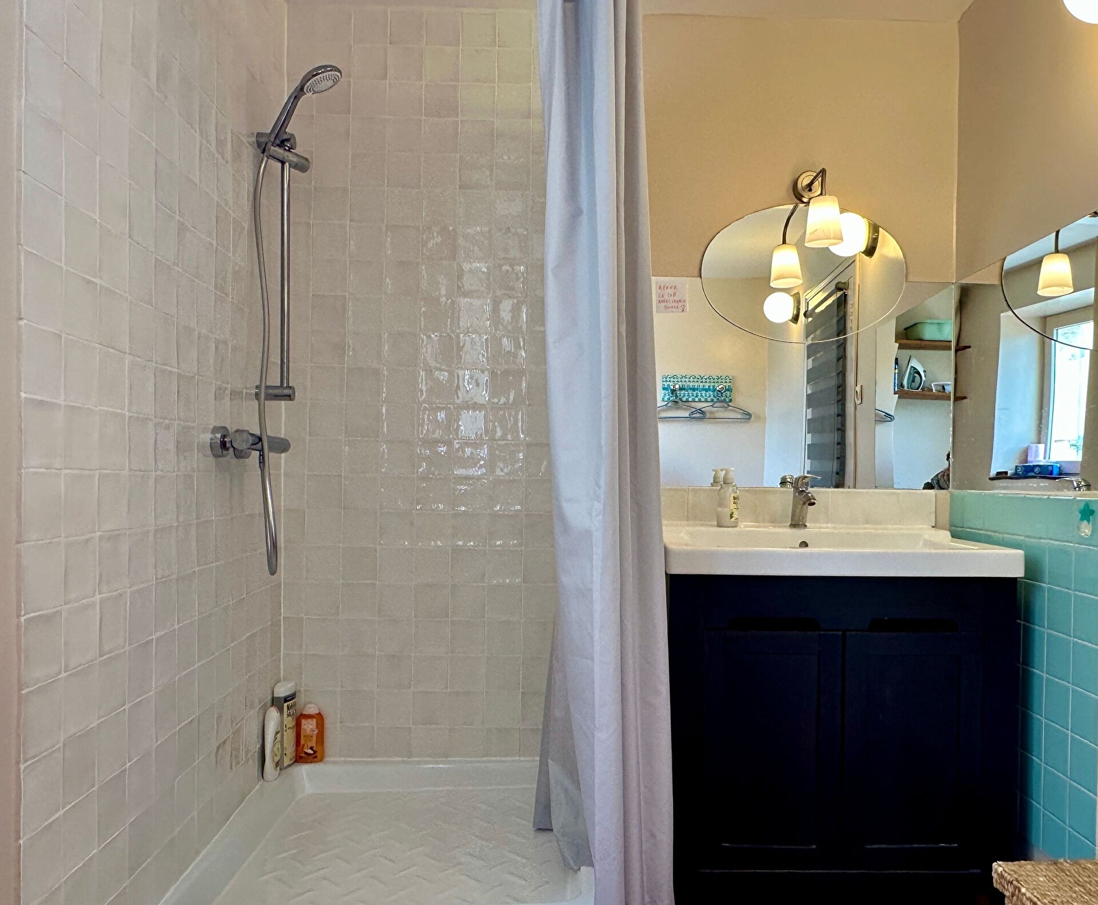 La seconde bâtisse (RDC surélevé) propose une chambre avec un lit 160cm et une salle d’eau attenante et WC, à l’étage une chambre sous les toits dotée de deux lits individuels.