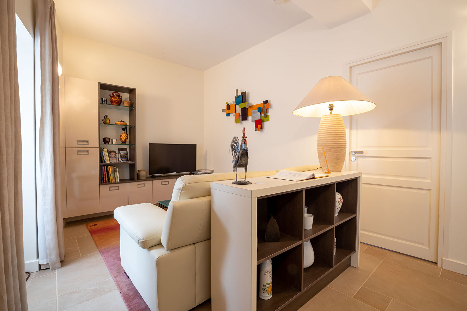 De plain pied, elle est composée d’une cuisine équipée ouverte sur le salon, d’une chambre, d’un espace buanderie, d’une salle de douche et d’un toilette séparé.