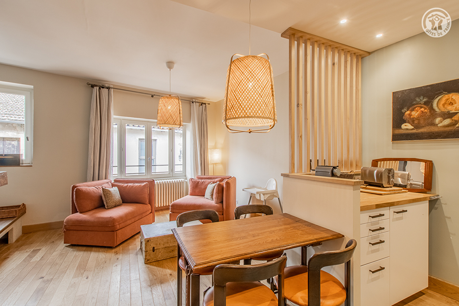 Composition : Maison de bourg mitoyenne. Wifi. Chauffage central gaz + cheminée. Gîte duplex (accès par rdc). 1er étage : séjour-cuisine-salon, salle d'eau (douche/wc). 2ème étage : chambre (lit 2 p. 160x200cm + lit 1 p. 80x200cm). Garage privé (voiture & local vélos). Toutes commodités sur place. 62m² de surface au sol (incluant mansardes sous hauteur de 1.80m).