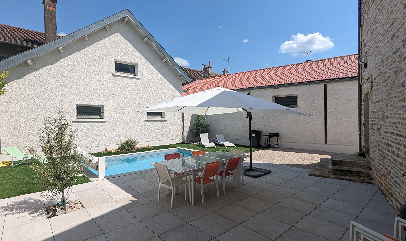 Grande terrasse avec salon de jardin, parasol, barbecue, transat. Piscine chauffée de 5,5 X 3,5m (volet électrique), ouverte de Mai à Septembre. 1 stationnement dans la cour fermée du gîte et 1 parking à 20 mètres du gîte .