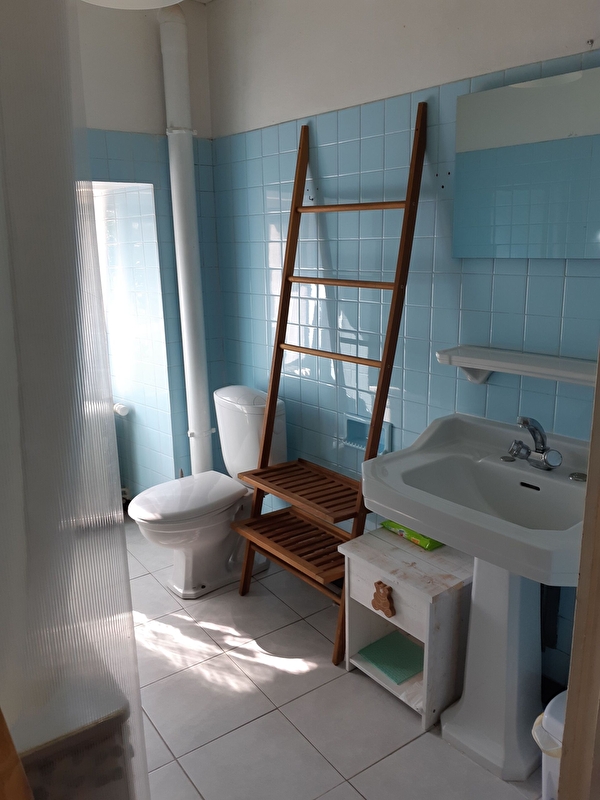 A l'étage, 1 chambre avec un lit de 160 et une chambre "enfants" avec 1 lit de 80 + 1 lit de 140, 1 salle de bain avec WC.